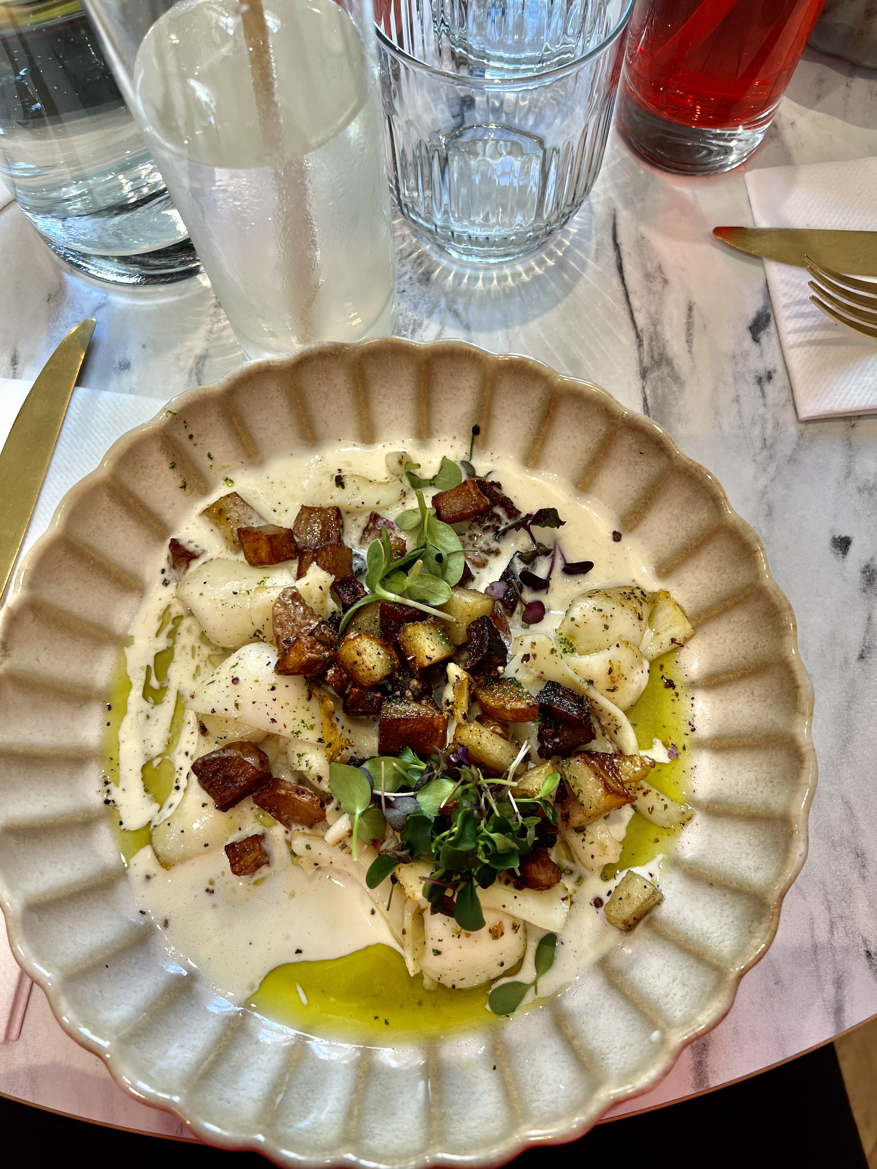 J'ai déjeuné dans ce restaurant au décor épuré et élégant, où chaque détail : des couverts à la vaisselle, respire la sobriété raffinée. Optant pour le menu à 28€, avec une délicieuse poêlée d'encornets à la persillade, parfaitement accompagnée d'une sauce citronnée. En dessert, le crumble de pommes et sa texture croustillante était un régale. Je recommande sans hésitation !