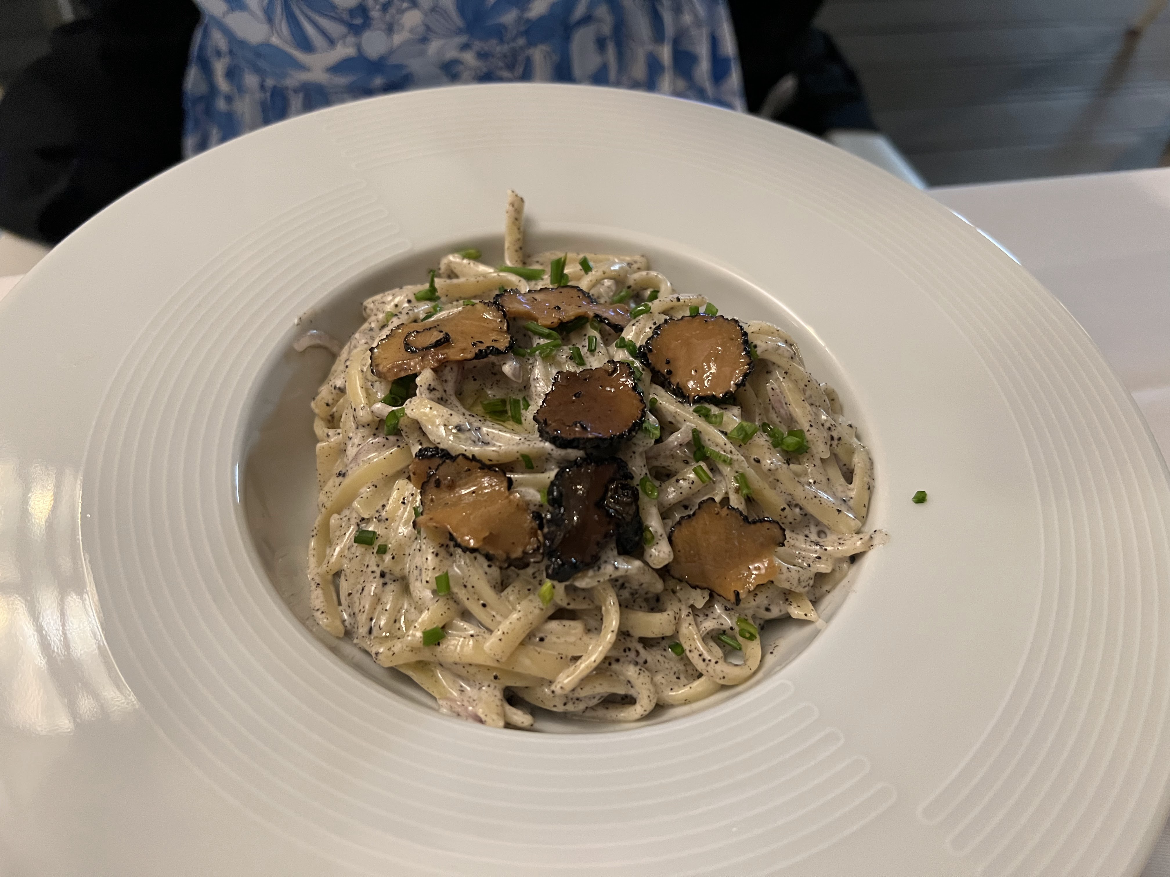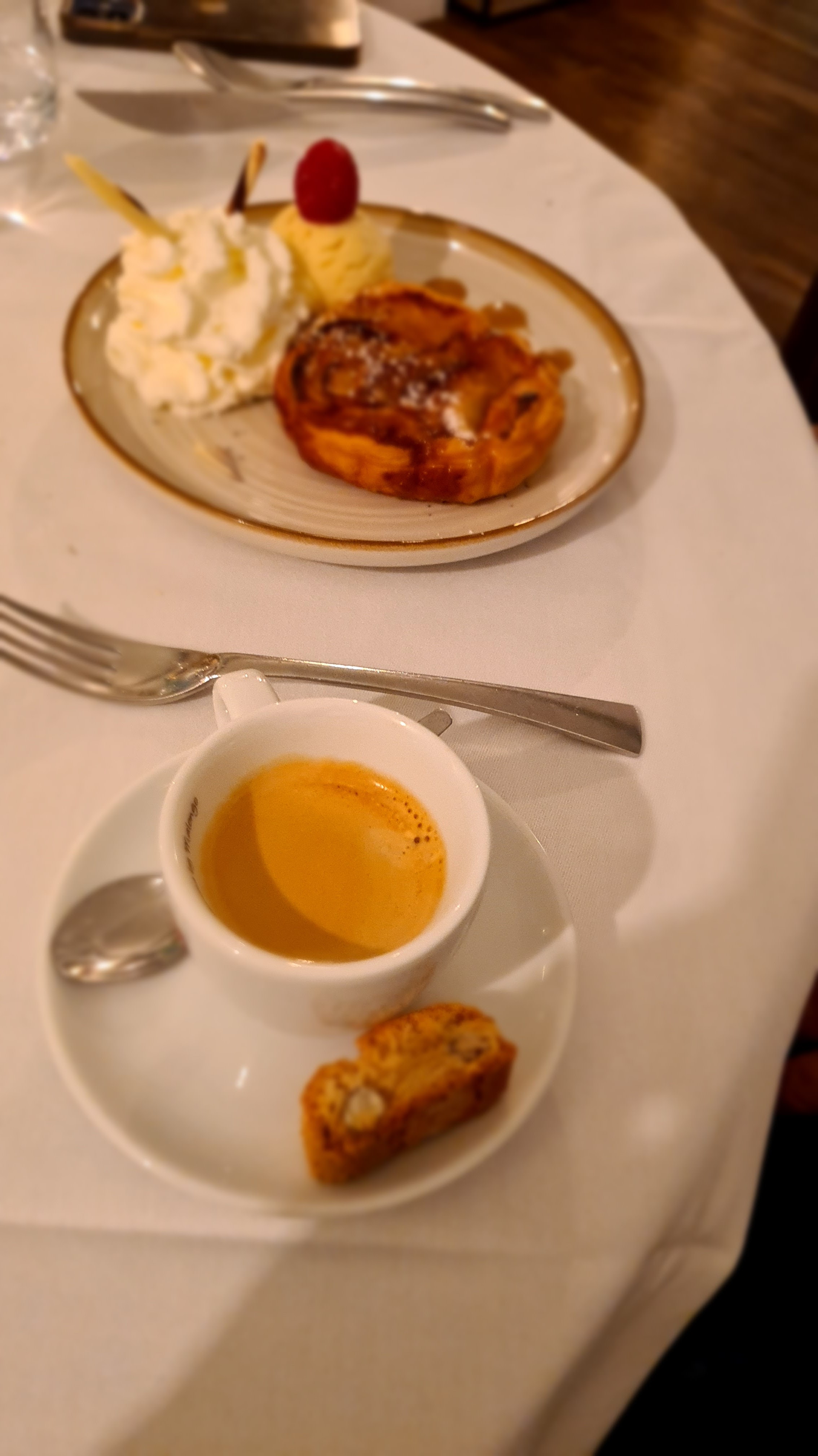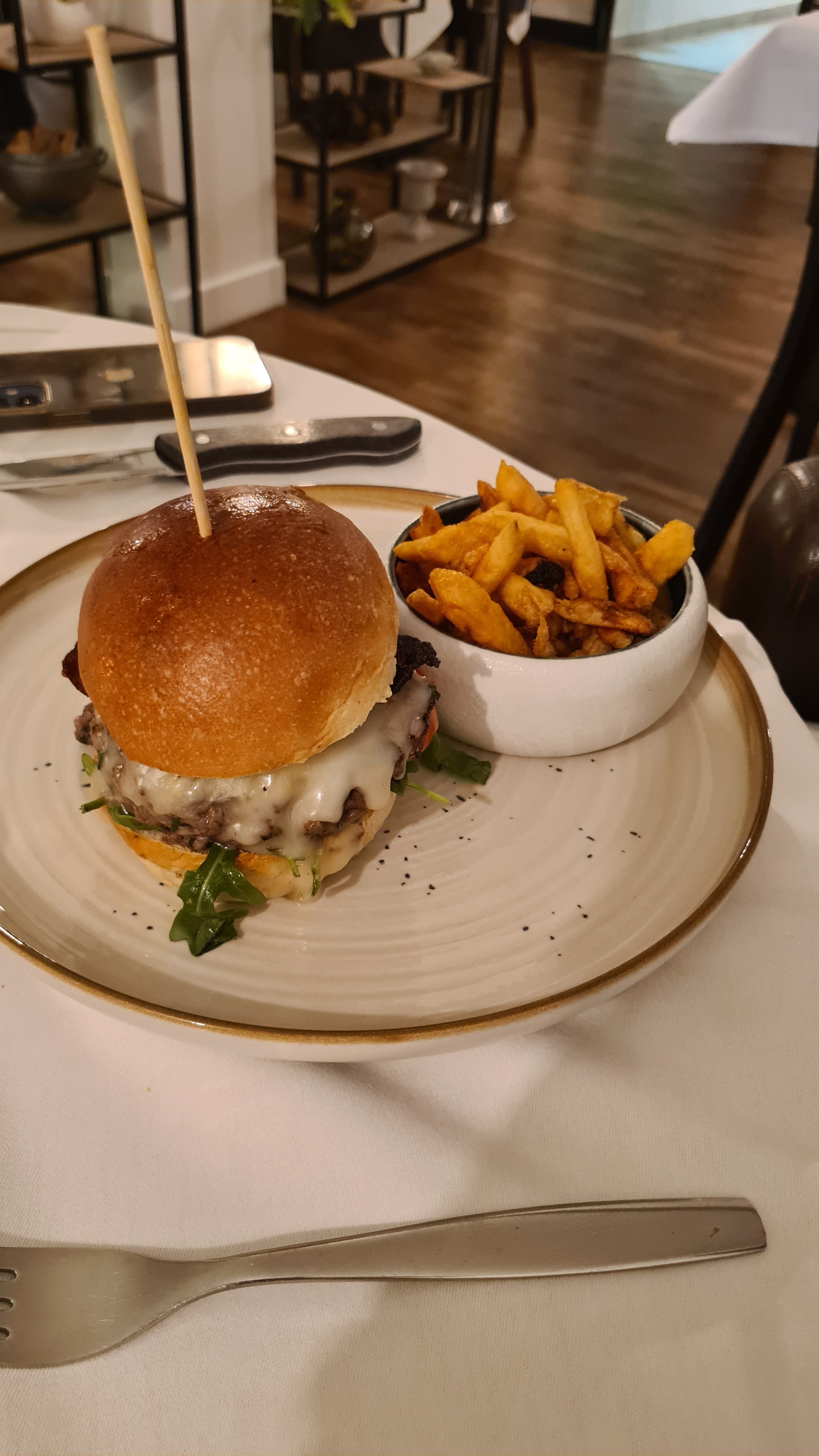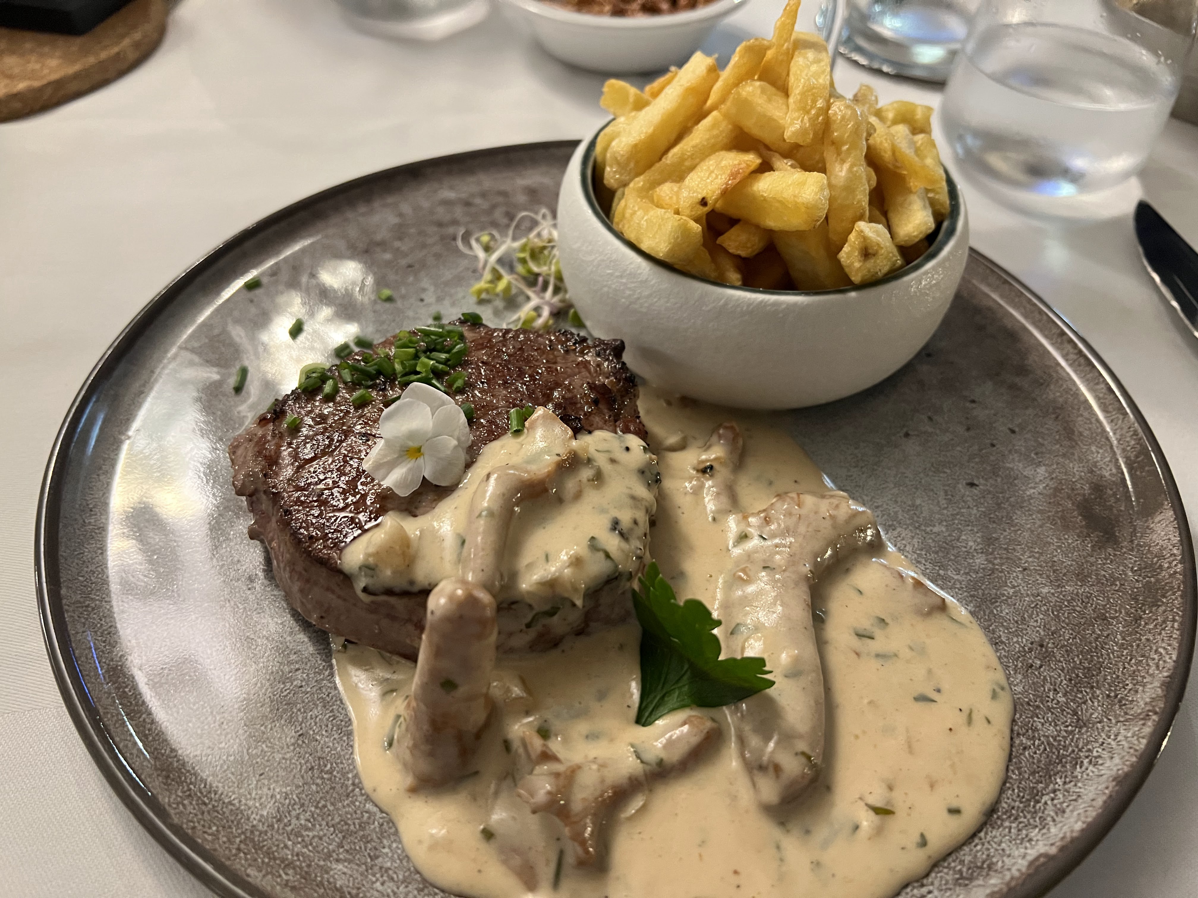 La nourriture était fantastique. Le bœuf est leur spécialité pour une bonne raison. Nous avons commandé le filet ainsi que des pâtes végétariennes aux truffes. Les deux étaient splendides. Nous avons également bu du vin et une boisson sans alcool (rouge blush) tous deux délicieux mais 10 € pour une boisson sans alcool semble un peu cher. La principale raison des 4 étoiles était qu'il n'y avait qu'un seul serveur servant 10 tables et que le service du dîner était donc très lent - il nous a fallu une heure pour obtenir notre dessert. Sinon, la nourriture est tout aussi fantastique et je le recommande toujours.