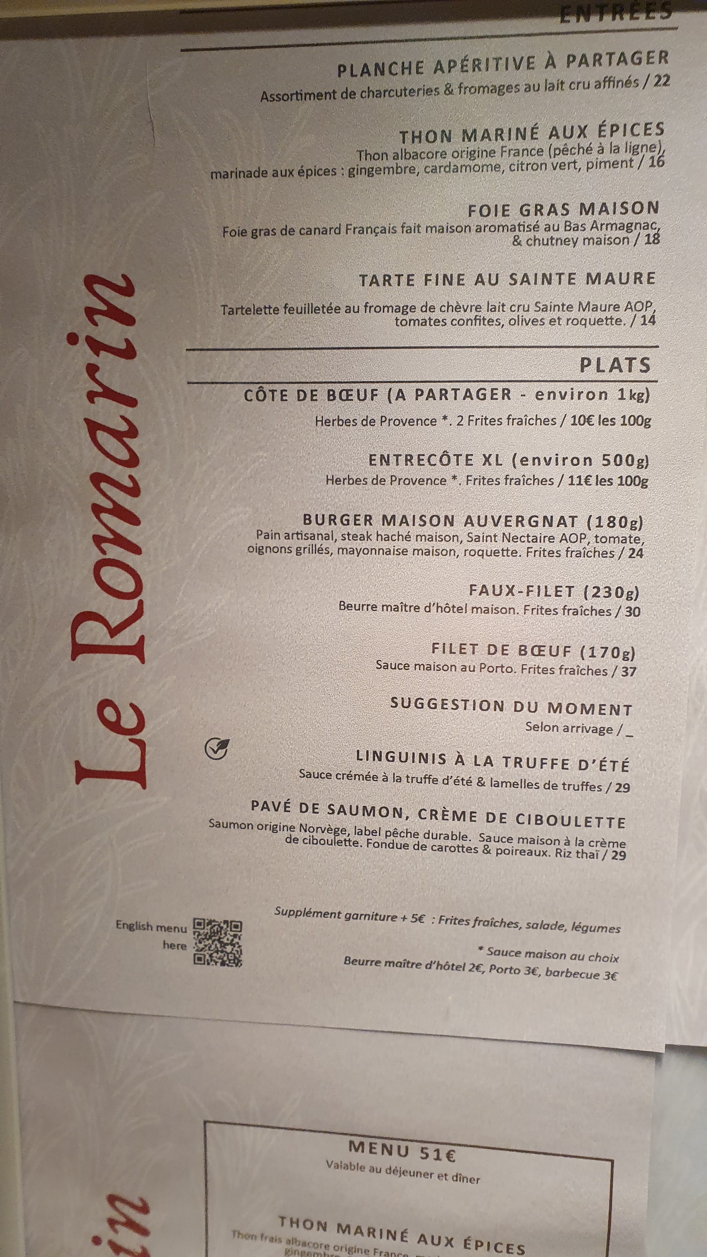 Un lieu, un service et des mets de qualité, tout est réuni pour passer une excellente soirée gourmande… Si l’on aime la bonne viande, bien cuisinée, c’est Au Romarin qu’il faut dîner ! Nous reviendrons avec plaisir.