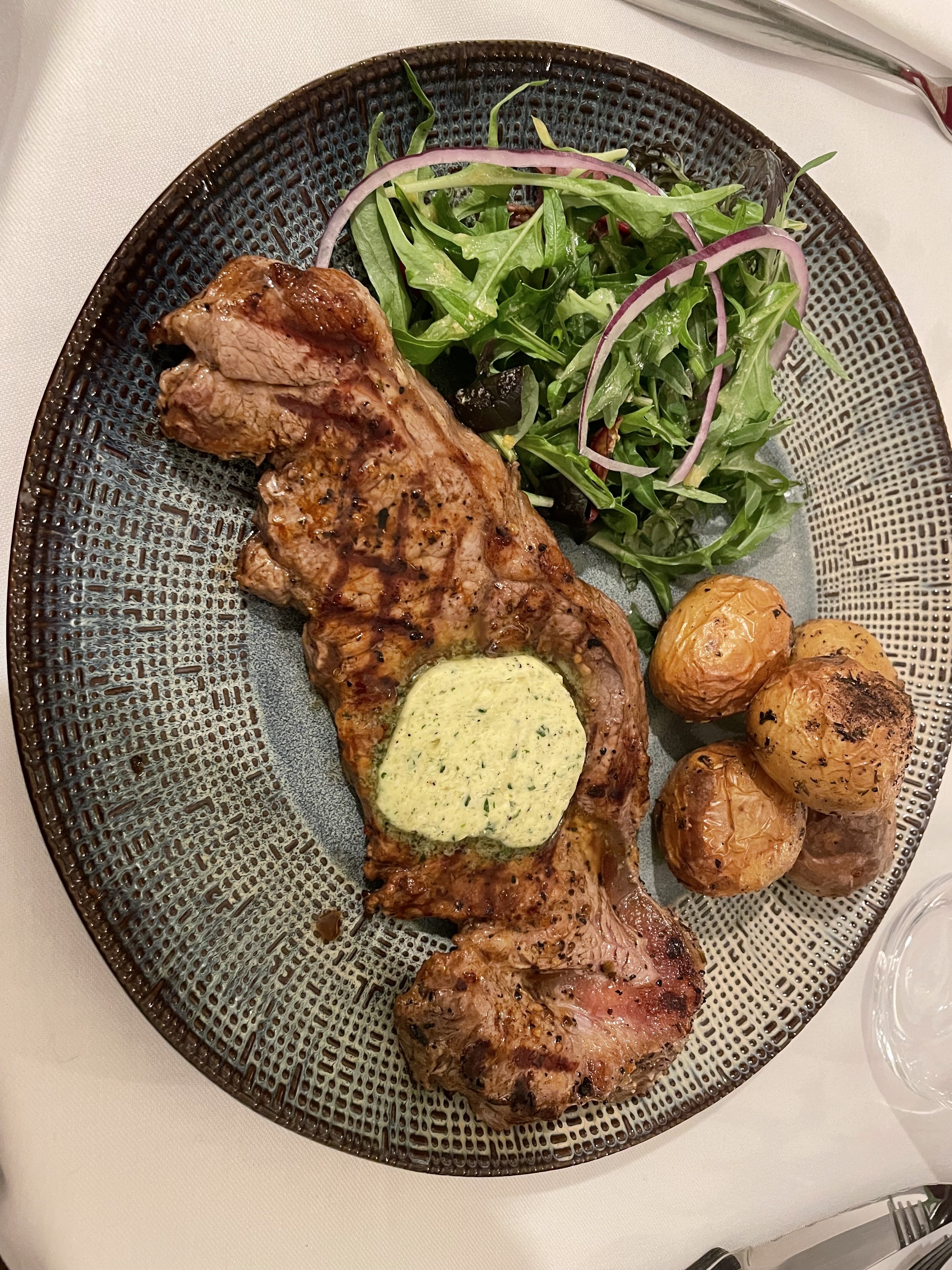 Peu de monde en ce lendemain de St Valentin. Reçu avec le sourire, on prend le temps de s'occuper de chacun. J'aime la viande rouge et ça tombe bien, c'est 95% de la carte. (1 plat de volaille, 1 plat de poisson, un plat végétarien, tout le reste est à base de bœuf grillé). Un planche à partager à l'apéro, nous sommes 2 mais il y en a assez pour 3 voir 4. Puis une belle pièce de bœuf. C'est trop, j'ai beau être un gros mangeur, je ne fini pas.