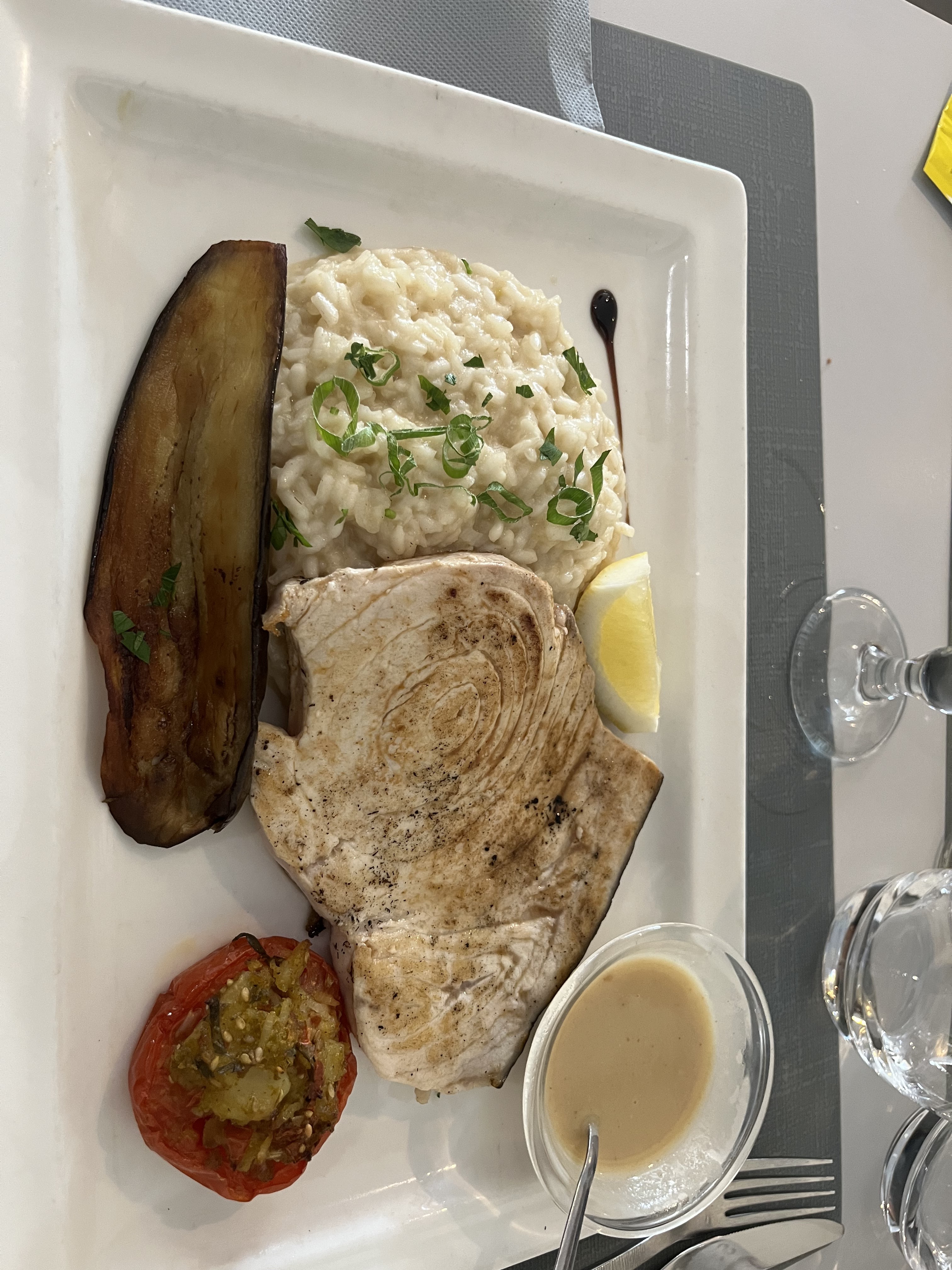 Restaurant le rond point au Cannet, excellent comme d'habitude avec le poisson dont cet excellent duo de thon et de cabillaud avec son écrasé de pommes de terre. Service au top et serveuses jolies et souriantes, que demander de plus. Je recommande fortement, venez le tester par vous-même. Octobre 2022