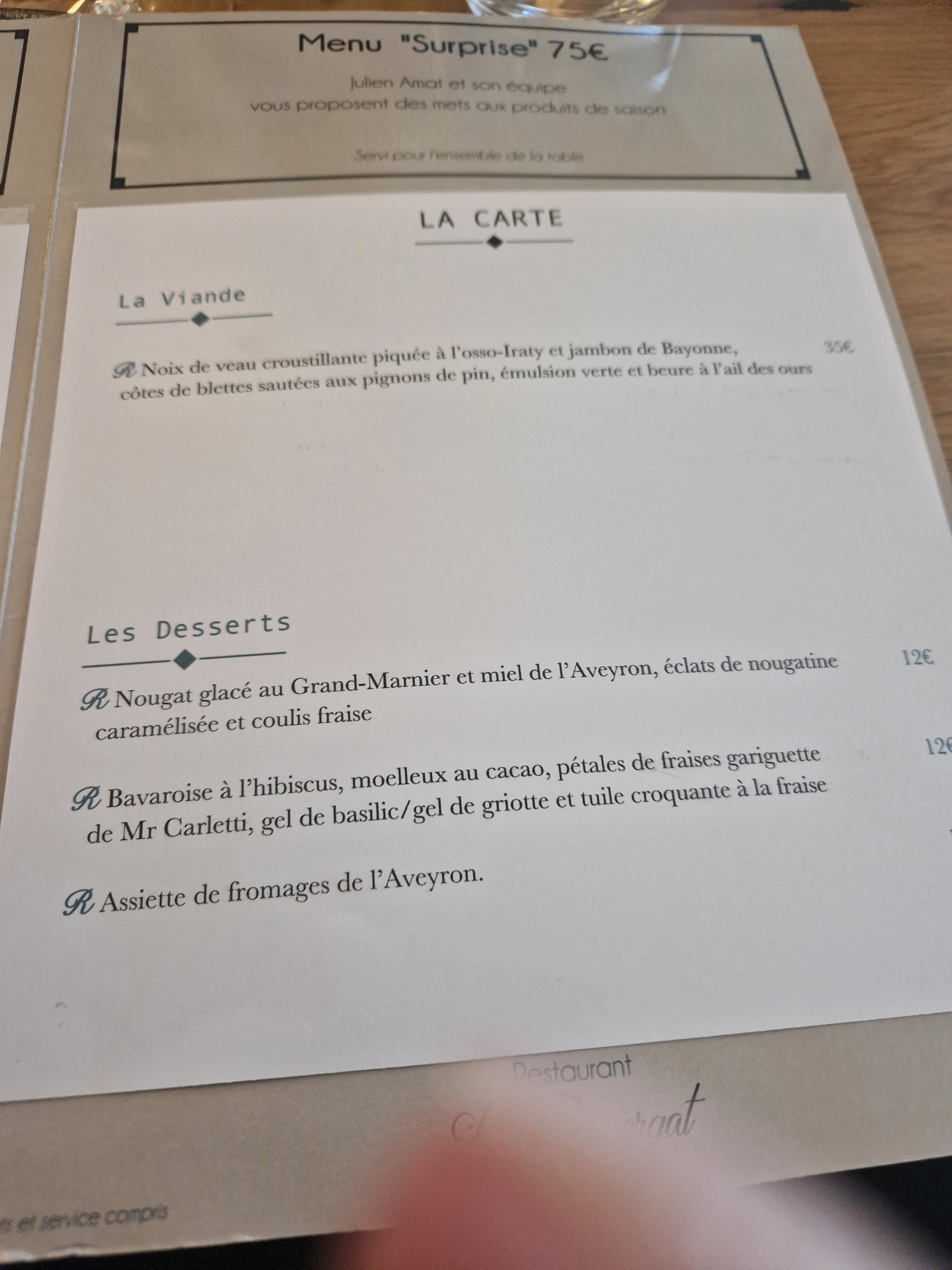 Ce chef a clairement pas envie. Nous étions à le rouergat pour le troisième fois pour déjeuner et on a commandé le menu surprise (€75 € pp). Mais ce n’était pas une surprise: c’était tous les plats de la carte. Le chef a servi de mauvaise humeur et on ne pourrait pas servir les vins de la carte qu’ on voudrait ( pas de bon bordelais et enfin on a commandé une cote de beaune, pas mal). le rythme de service était très élevé. Le gazpacho du maïs était superbe et les autres plats étaient ok. Mais le croquette d’agneau était objectivement beaucoup trop salé et on le mangeait pas. Le chef a fait rien avec ce comment. Nous sommes déçu avec ça, particulièrement l’air du chef et nous ne retournions pas à ce restaurant. On a payé € 200+ pour ce déjeuner…