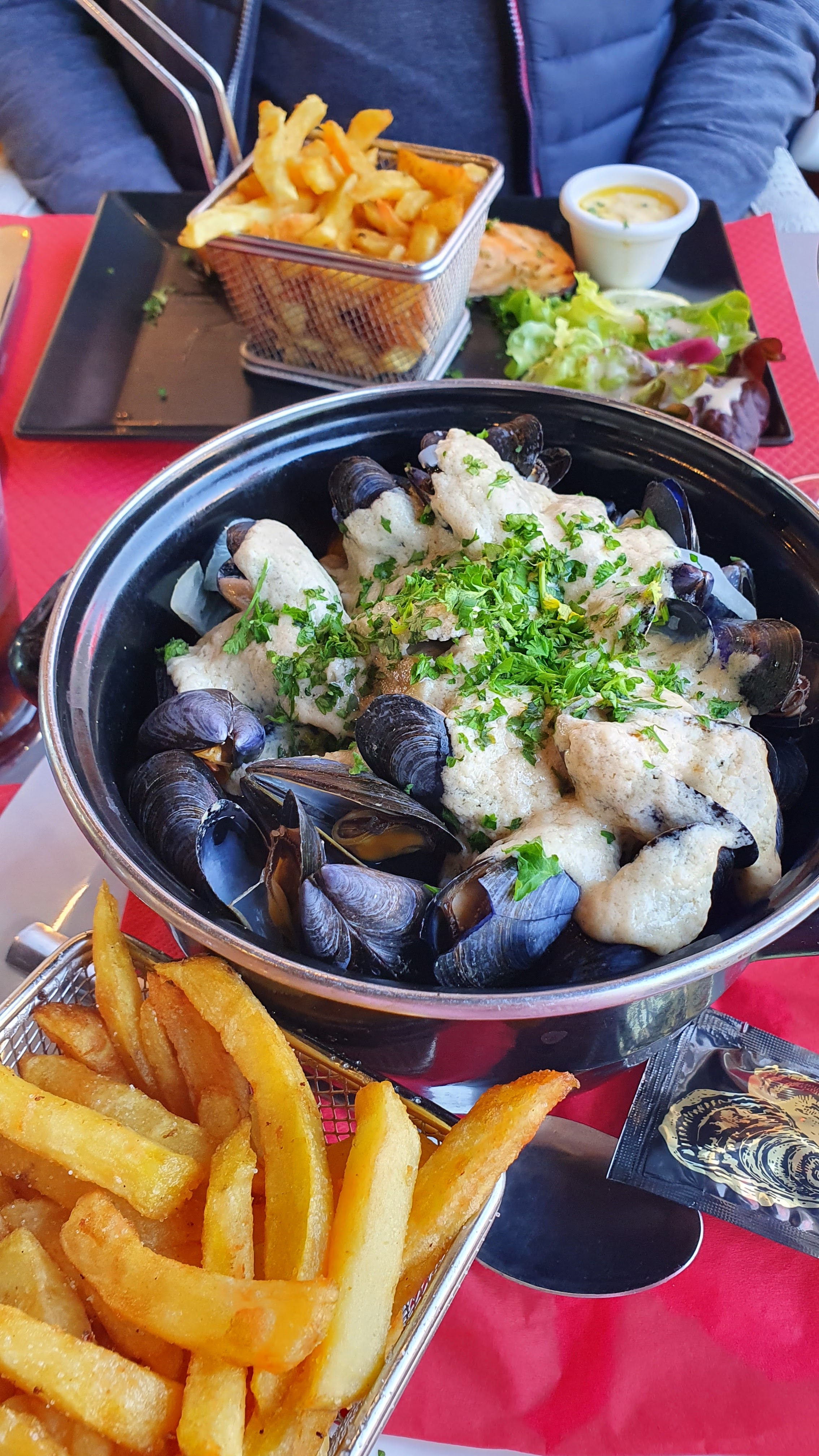 Moules à la crème trop cuite, juste une louche de crème rajoutée par dessus à la va vite histoire de dire que c’est des moules à la crème, très peu de frite qui sont sèche. Très déçu. Je déconseille