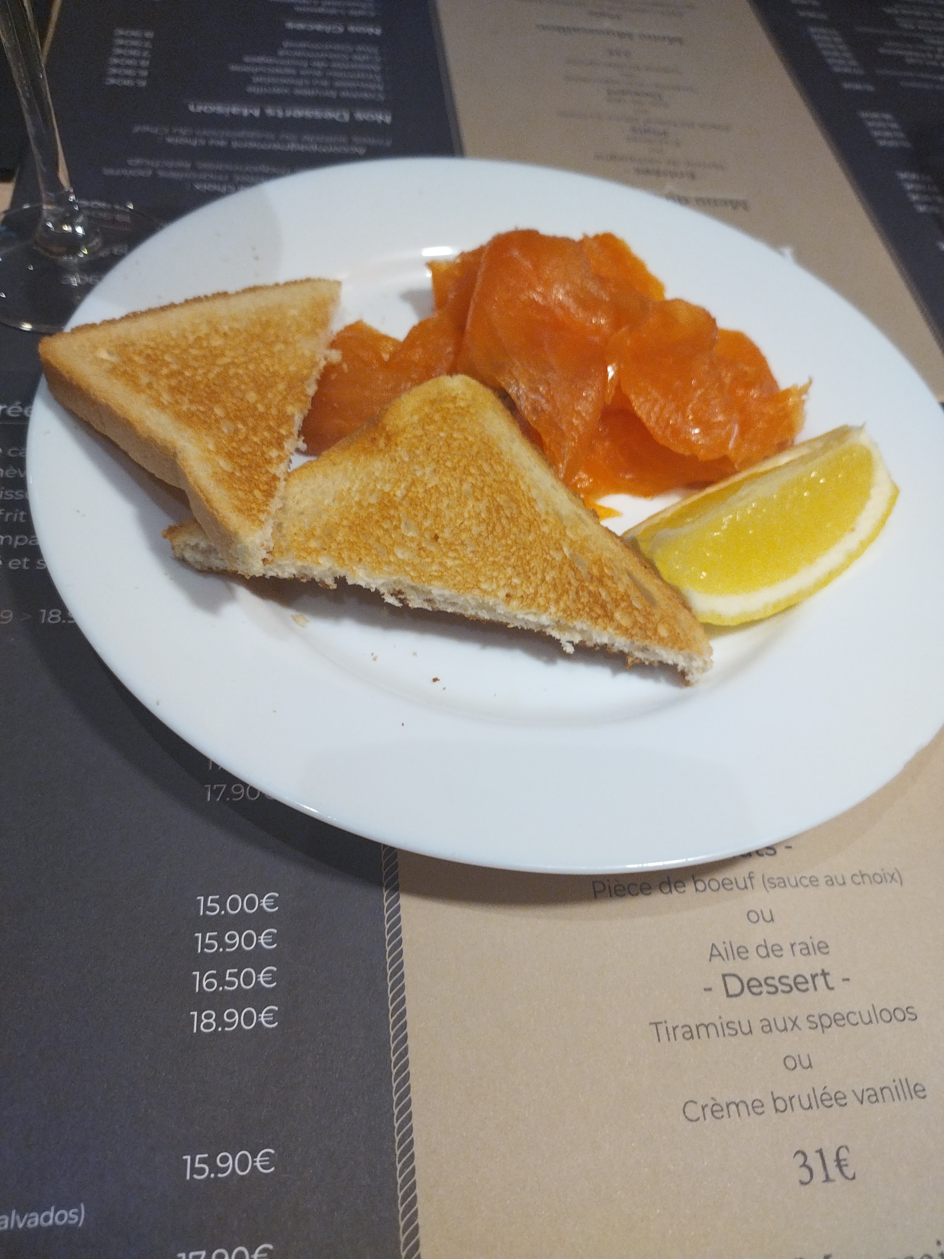 De passage sur Étaples suite au récent avis nous avons essayes ce restaurant . Accueil téléphonique charmant de la part d Isabelle nous sommes arrivés un regard froid du gérant portant une casquette c'est pour ? ... bref nous sommes accueilli et installer par la serveuse tjs aussi sympathique . Apéro : coupe de champagne prix non indiqué sur la carte . Entrée saumon : frais et bon. Petit attente car erreur de la cuisine sur la présence de salade ... plat viande et canard la cuisson n'est pas optimale pour les deux plats idem aller retour car erreur d assiette vite régler par notre serveuse du départ . Pas de dessert juste café le tout pour 90 e pour deux je recommande pour la qualité du service et la fraîcheur produit .