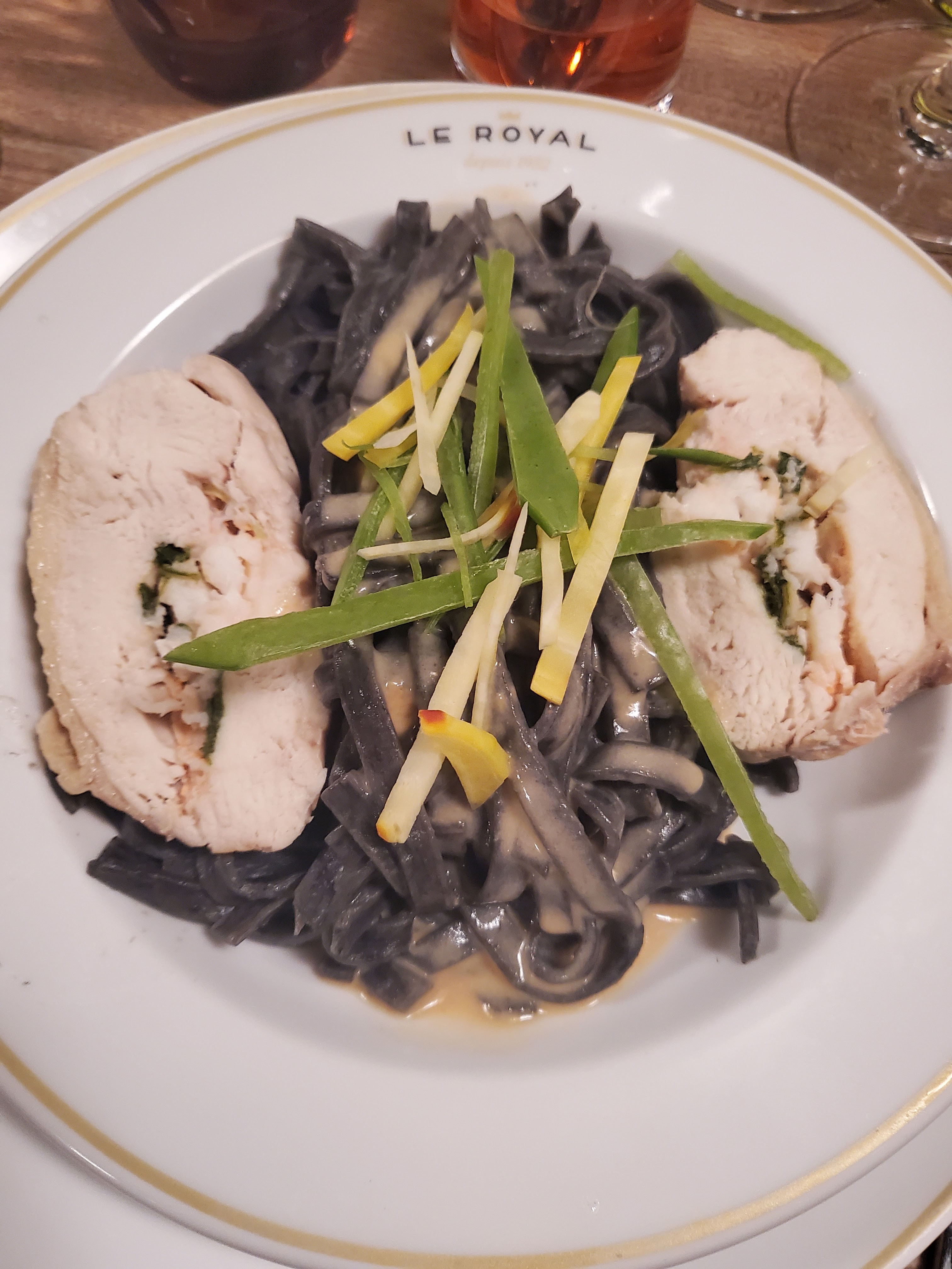 En déplacement déjeuner au Royal super le service les plats ma femme dos de cabillaud au parmesan h vert et salade pour moi riz de veau avec purée maison et salade vraiment super merci au chocolat