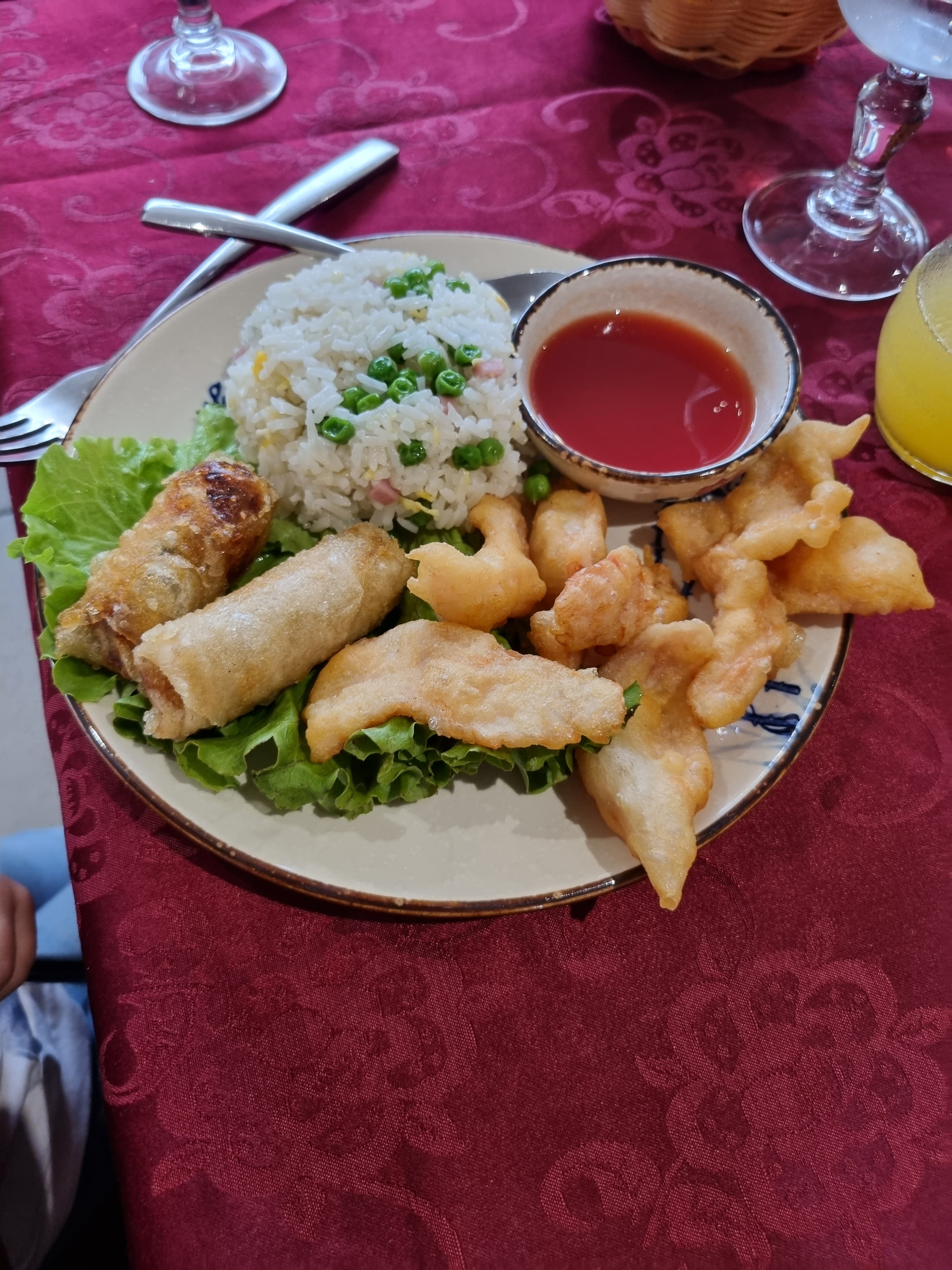 Aujourd'hui, nous avons mangé un morceau au restaurant asiatique Le Royal Aubigny. En fait, tout le monde à la maison aime la cuisine asiatique. Ce restaurant a été bien noté. Aujourd'hui, c'était jour férié. Le restaurant était plutôt complet. En entrant, nous avons été chaleureusement accueillis et conduits à une table joliment décorée. Les prix des boissons sont bons. Litre d'eau 5 €, boissons gazeuses 3,50 €. Nous avons opté à deux reprises pour le menu enfant (voir photo) et une entrée pour 2 personnes plus deux plats chauds avec du riz cantonais. Le menu pour enfants était bon. Quantité généreuse et savoureuse. Les entrées étaient également toutes bonnes individuellement et si nous nous en étions tenus à cela, elles auraient reçu 5 étoiles. Seuls les deux plats très chauds étaient un peu décevants. Boeuf sur une plaque chauffante et crevettes sur une plaque chauffante. Nous avons tout mangé proprement, mais nous n'avons pas trouvé cela génial. Dans l’ensemble, la nourriture était délicieuse et si vous aimez la cuisine asiatique et que vous êtes dans la région, cela vaut vraiment le coup ! Service 3 étoiles, le personnel était un peu distant et même si nous avions donné un pourboire poliment, il était difficile de dire merci et de ne pas vous voir ni au revoir. Point négatif, quelque chose qui peut être vécu complètement différemment avec le sourire et un peu d'enthousiasme.