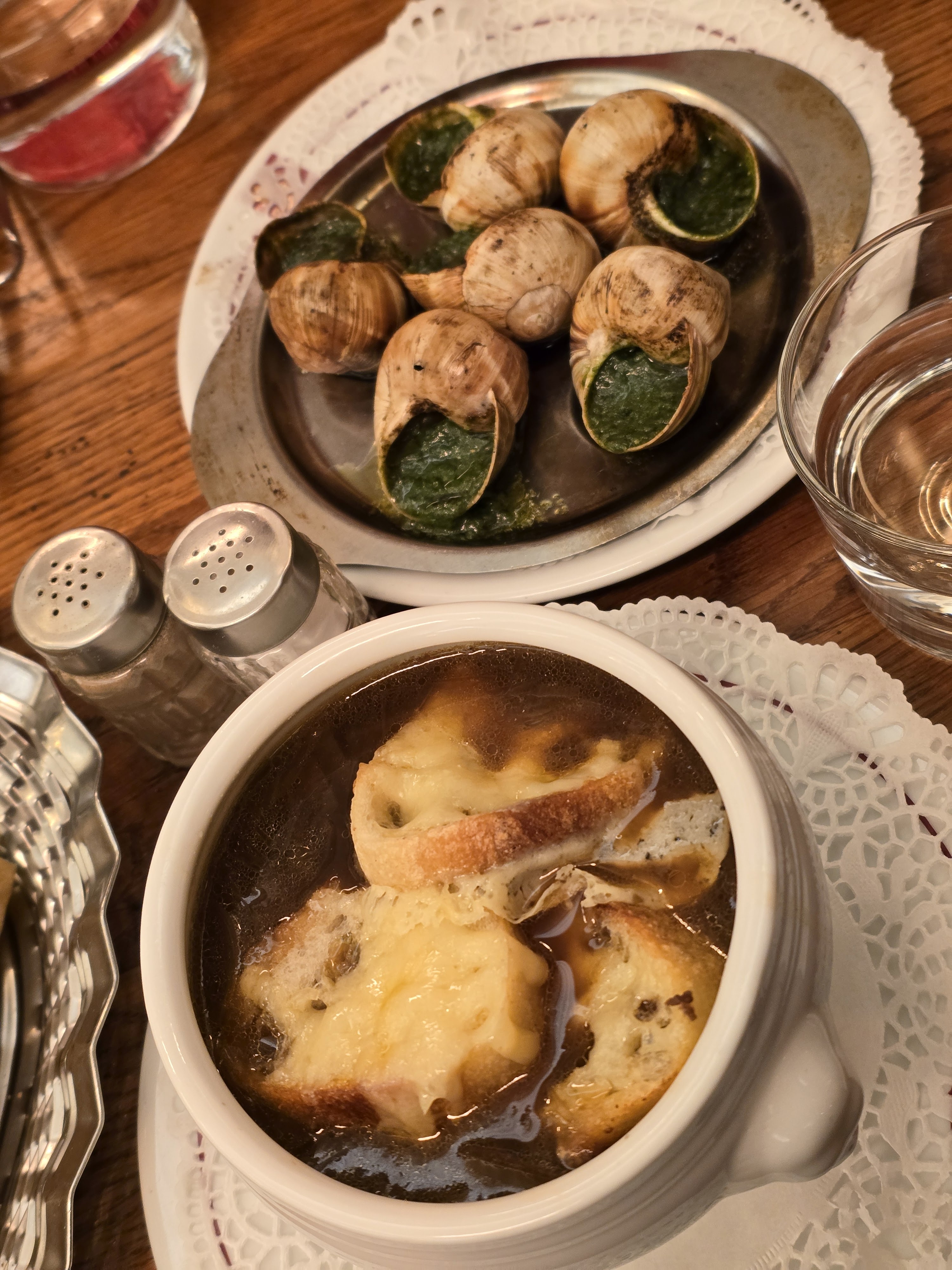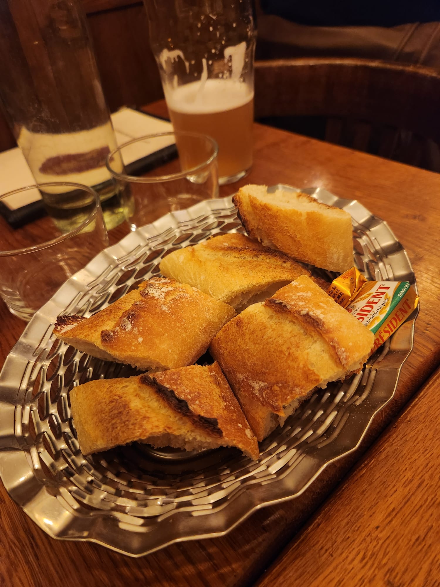 L'ambiance est animée et on ressent l'excitation de manger dans un restaurant français. Bien que le service soit bon, l'attention portée aux détails dans les commandes aurait pu être meilleure. Par exemple, j'ai commandé une soupe à l'oignon française mais elle n'est jamais arrivée. Ce qui est venu en premier, c'est l'entrée car c'était la même que celle de mon ami, donc je suppose que le serveur a oublié. (Je n'en ai pas parlé car le plat principal était posé devant moi et je voulais le manger chaud). De plus, lorsque nous avons commandé du steak frites comme entrée/plat principal, on ne nous a pas demandé comment nous préférions la cuisson du steak. Nous avons tous les deux trouvé le steak assez moelleux, ce n'était peut-être pas la meilleure coupe de steak ? Cependant, le steak était savoureux, surtout mangé avec la sauce qui était délicieuse. Les escargots étaient incroyables et constituaient le clou du repas.