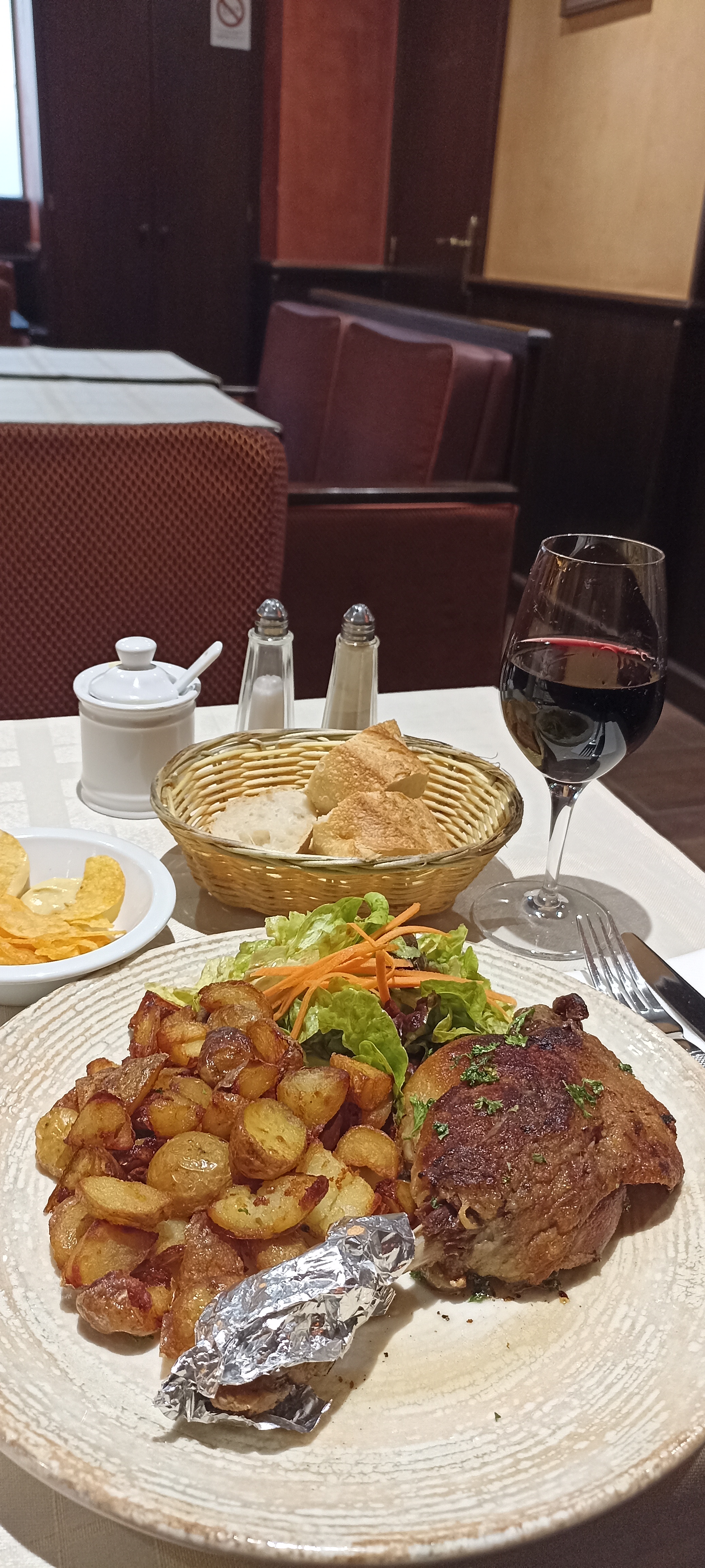 Un excelent dinner au Le Royal Brasserie avec une entrée d' oeufs durs avec de la mayonese, suivie d' une magnifique cuisse de canard confité avec de la salade, accompagné d' un très bon vin rouge Morgon Vieilles Vignes et pour le déssert une délicieuse tarte aux poires. À revenir bien sure.