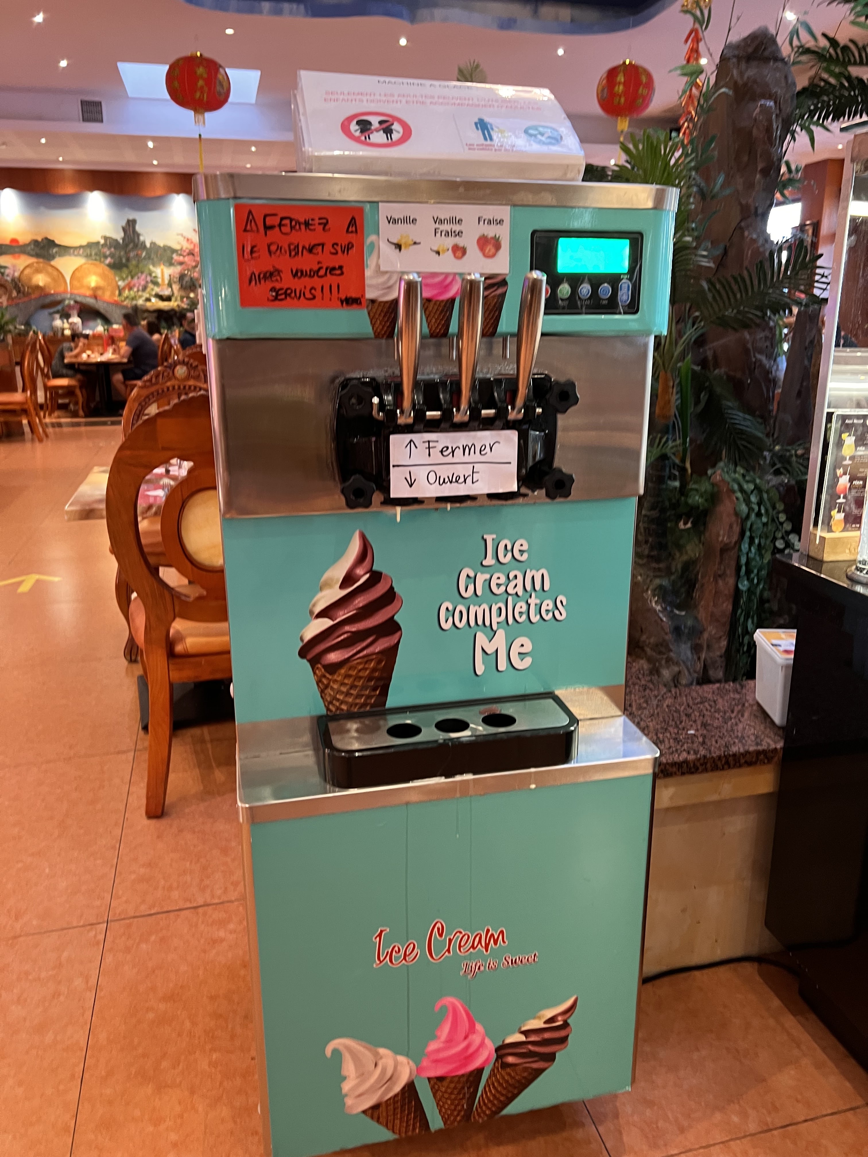 Personnel sympa. Par contre hygiene â vomir. Les sanitaires dont limite. Il y a des salelé dasns les angles de carrelages. Les couvercles de poubelles sales et j.y suis allées à plusieurs diff j.ai 4 enfants. Le miroir bof. Les poignets pour ouvrir le congélo à glace est vraiment tres déguelasse. L.eau pour tremper la cuillere à boules pareil. Cuisine potable. La derniére visite date du p1.01 2020 il y avait plus de choix et je ne me souvenais pas d.une hygiene aussi fouteuse. Esperons que personne ne tombe malade. En plus d.une grosse augmentation. Le petit de 8 ans a payé adulte alors qu.il a encore 8 ans