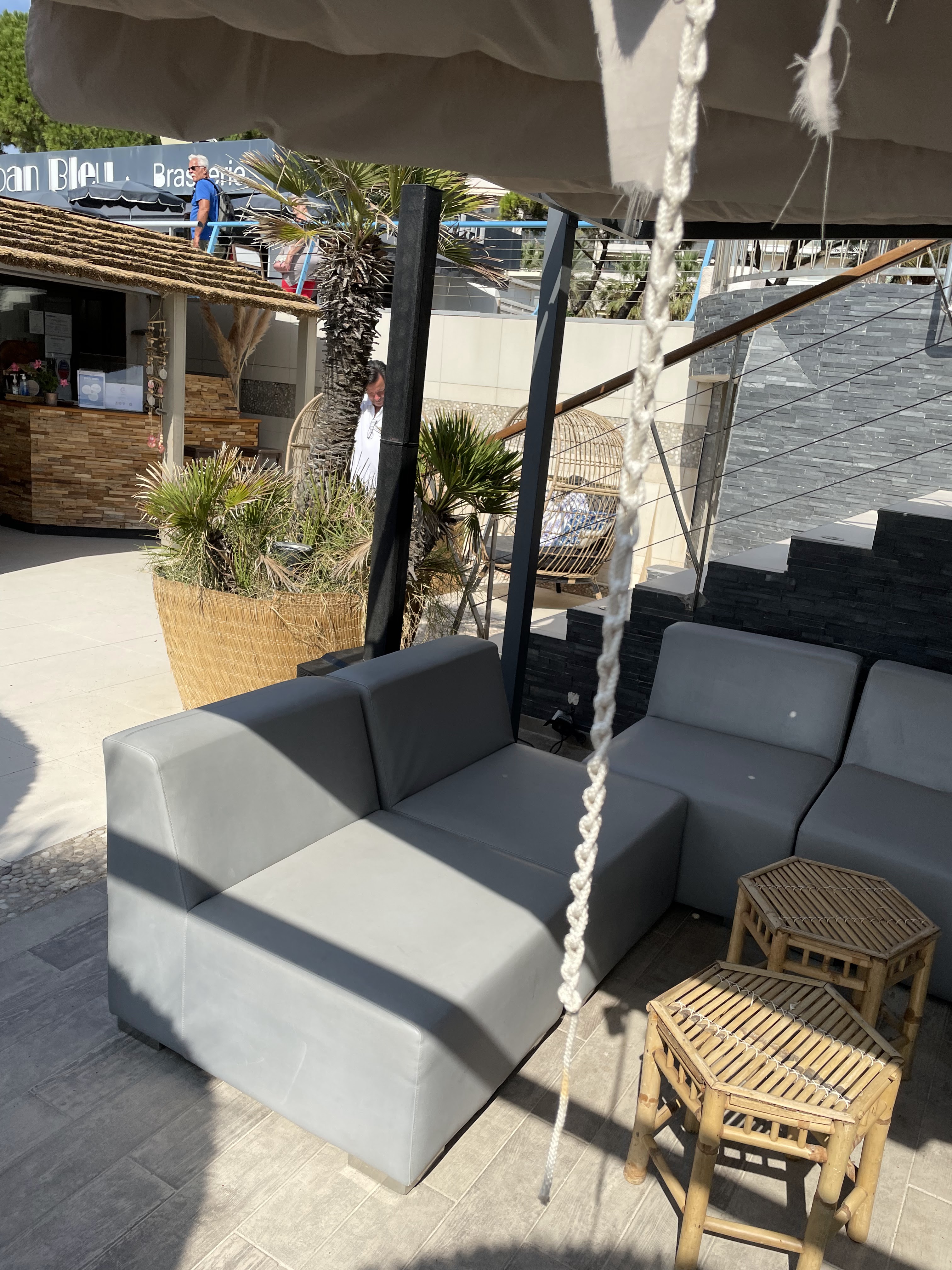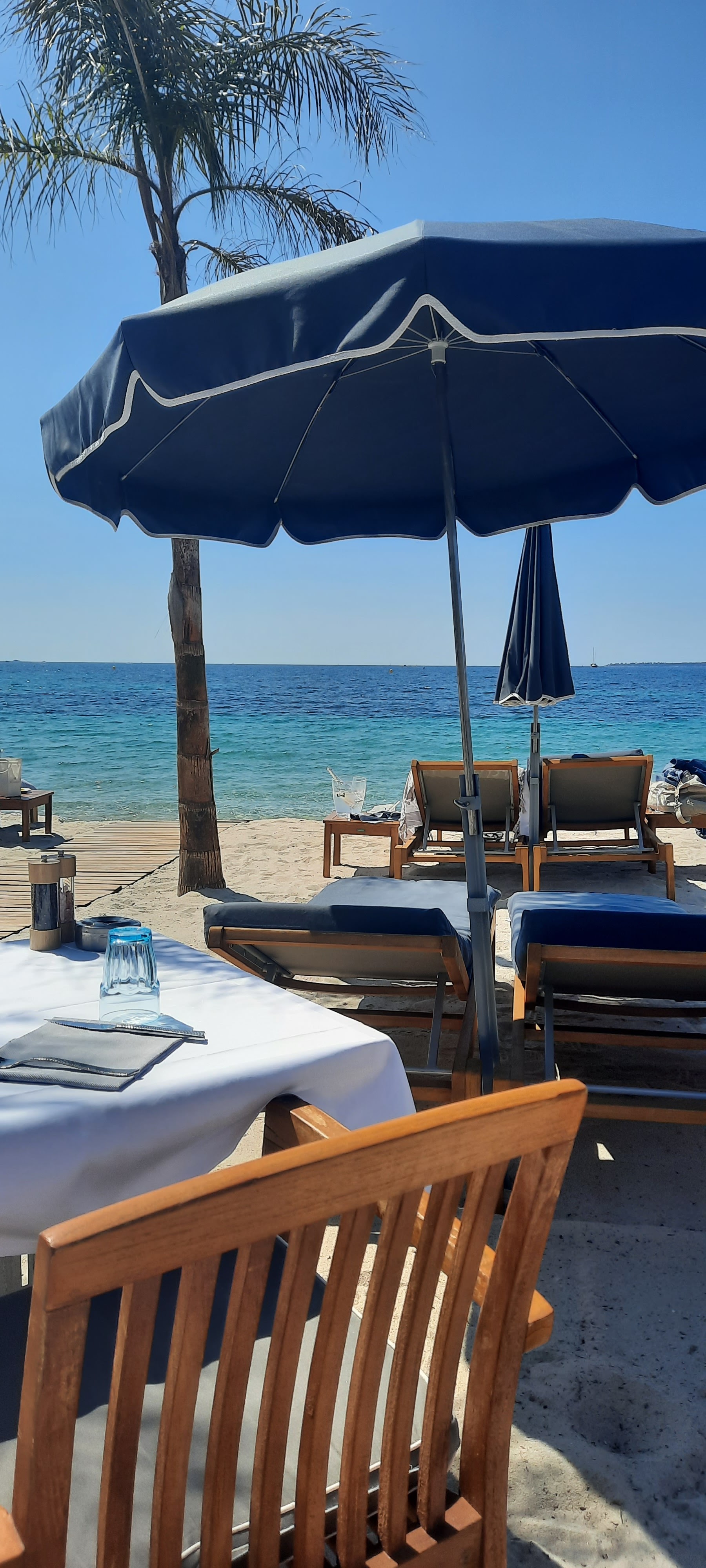 Un endroit calme et élégant sans chichi Merci à Maxime et Jean de leur gentillesse et professionnalisme, une adresse vraiment sympa pour la plage les pieds dans l’eau , le restaurant est une bonne table . Superbe déco .Transats confortables Nos vacances se feront à Juan les pins à 100% l’an prochain car Cannes est à fuir sur tous les points .