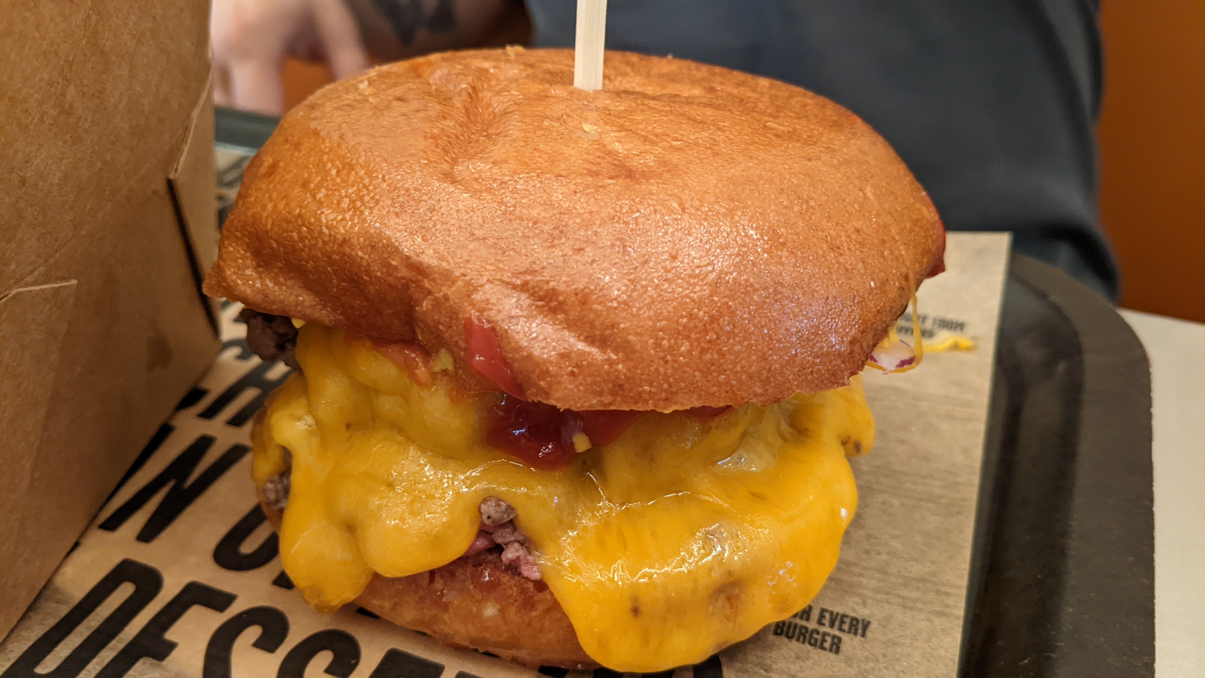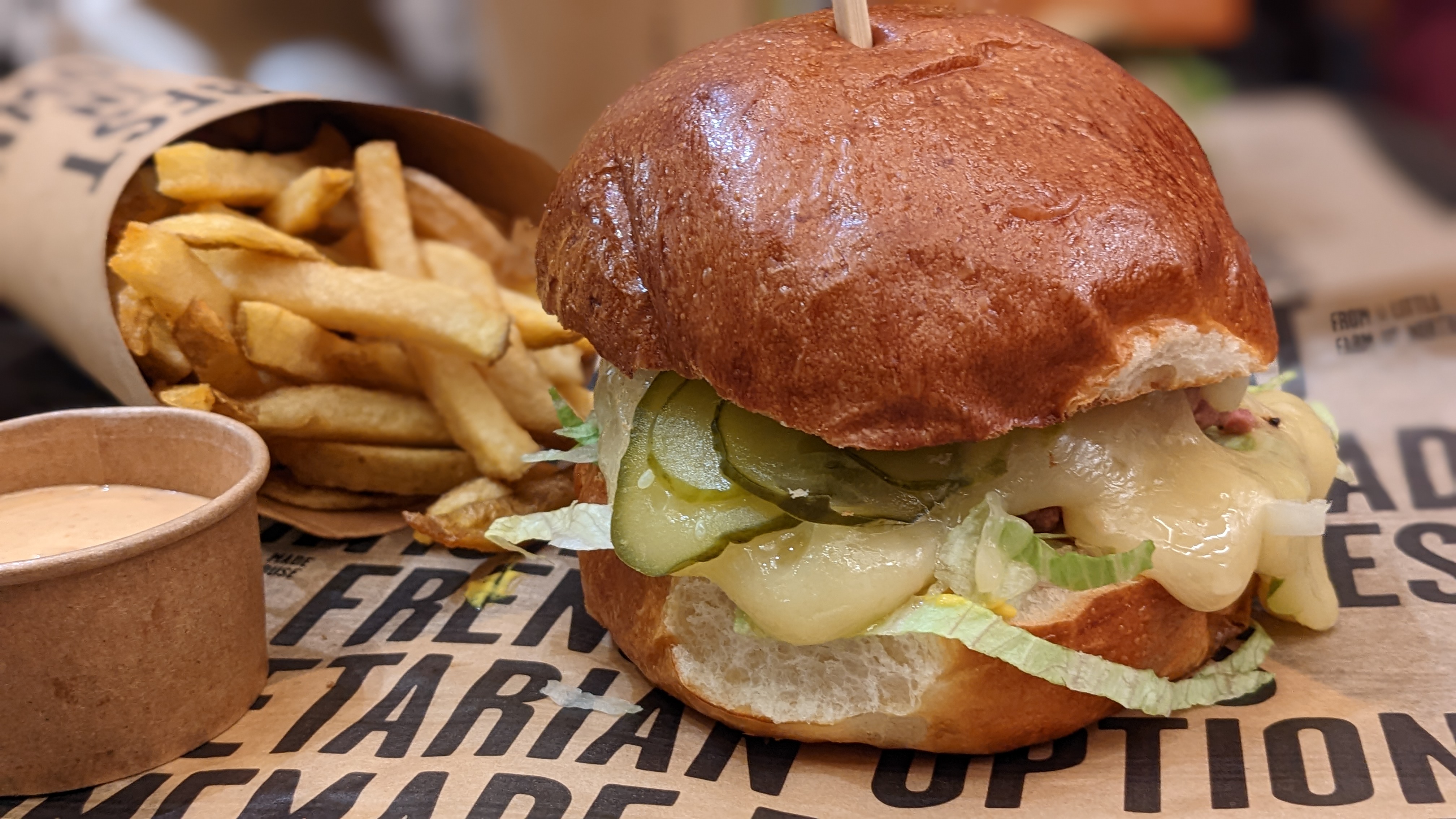 J'emporte un burger au cheddar à emporter et c'était vraiment bon. Sérieusement miam. le prix était également raisonnable et comprenait des frites et des sodas pour 13 €.