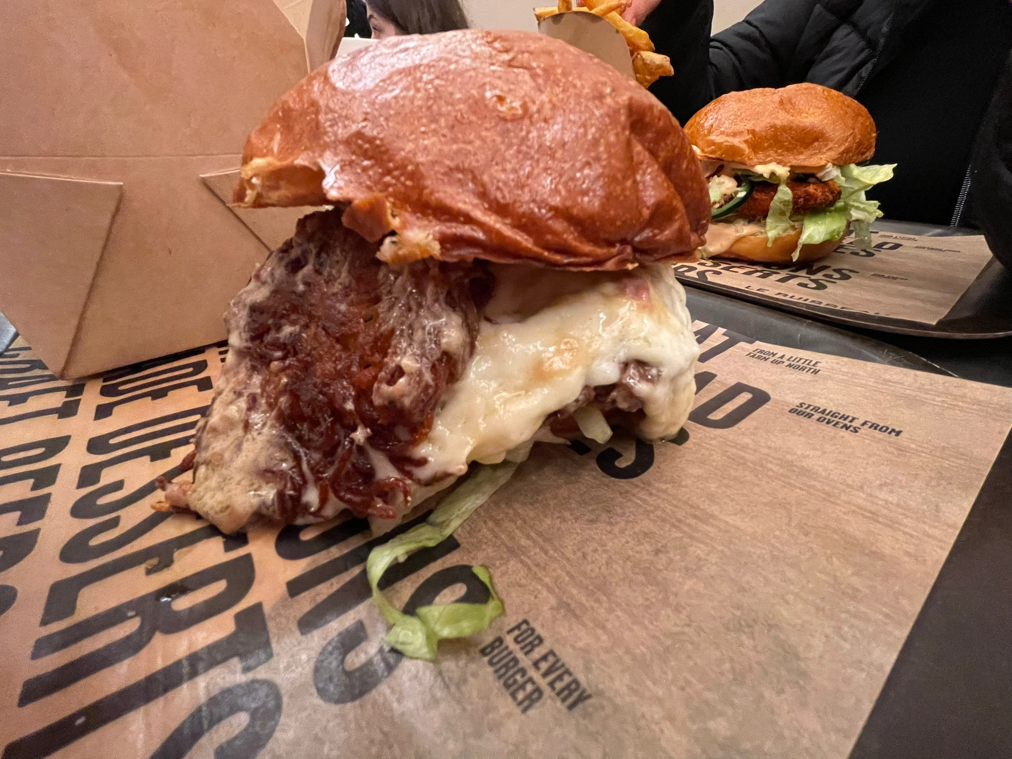 J’ai pris le tom burger, on ne sentait pas la tomme car la moutarde américaine masquait le goût. Dommage ! Mais dans l’ensemble c’était bon avec des ingrédients de qualité.