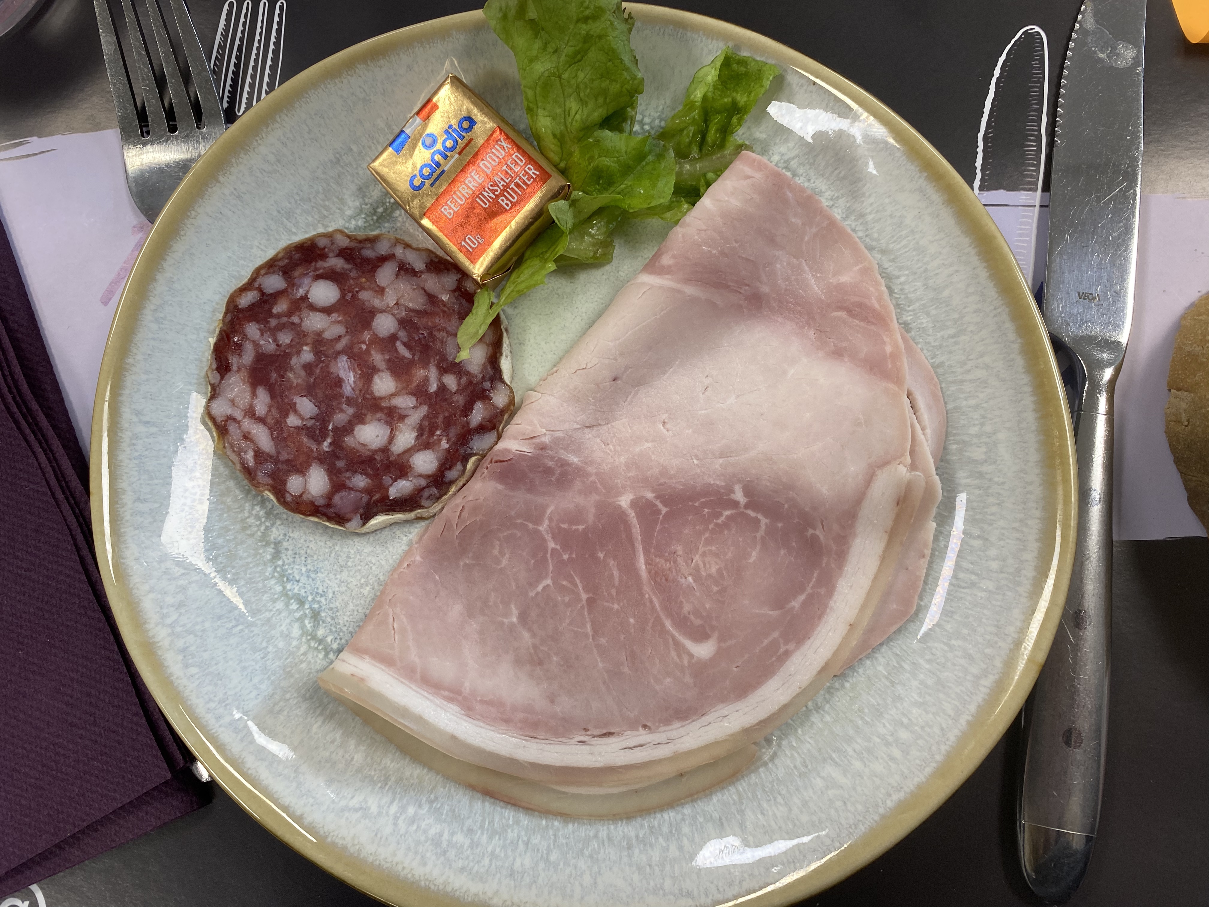 Nous nous sommes arrêtés en conduisant sur l'autoroute et avons été enchantés par la délicieuse cuisine française typique.