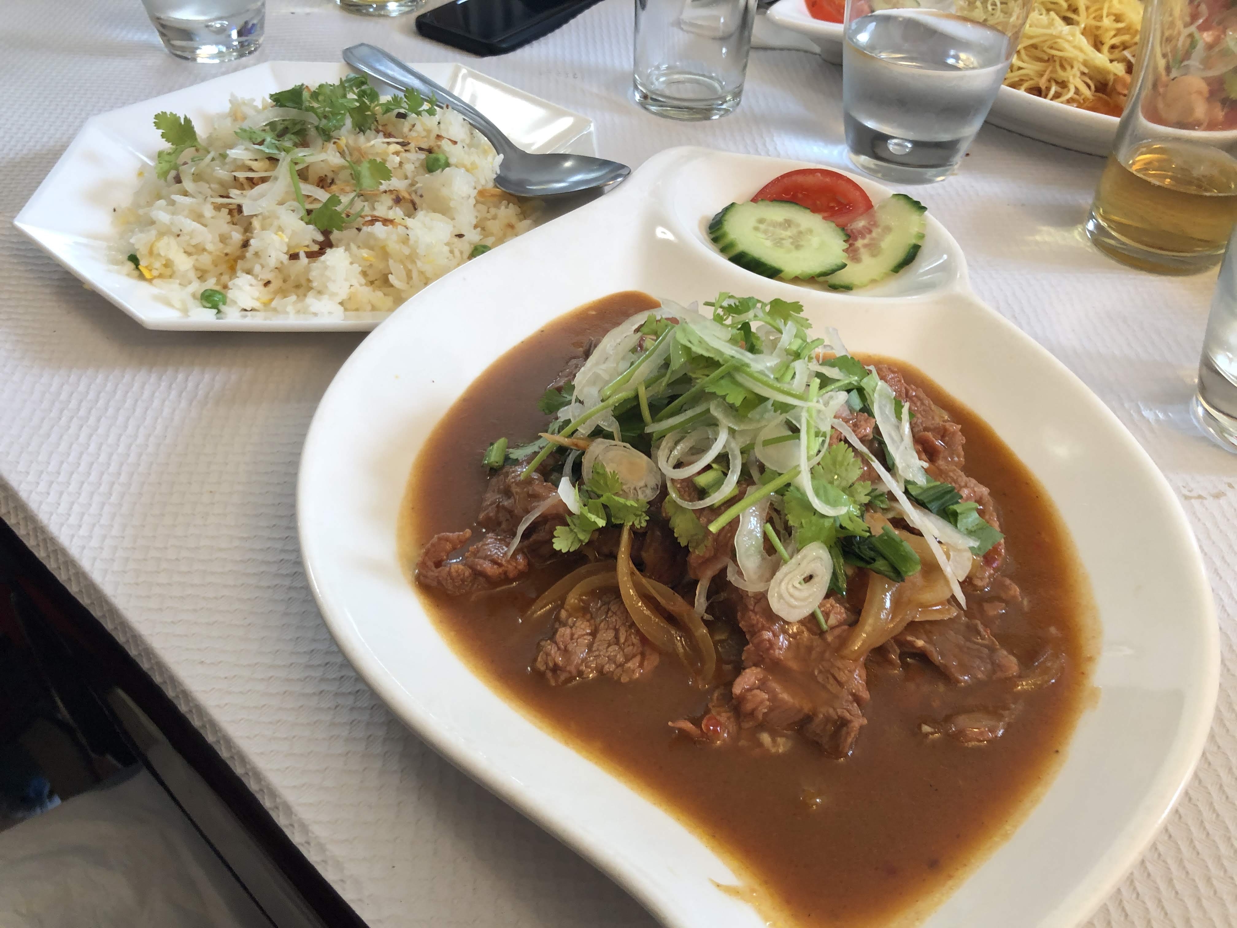 Bon plat ( boeuf sauce piquante) Petit bémol, le centre des samoussas était un peu froid. Bonne adresse cela dit. Petite salle pensez a reserver