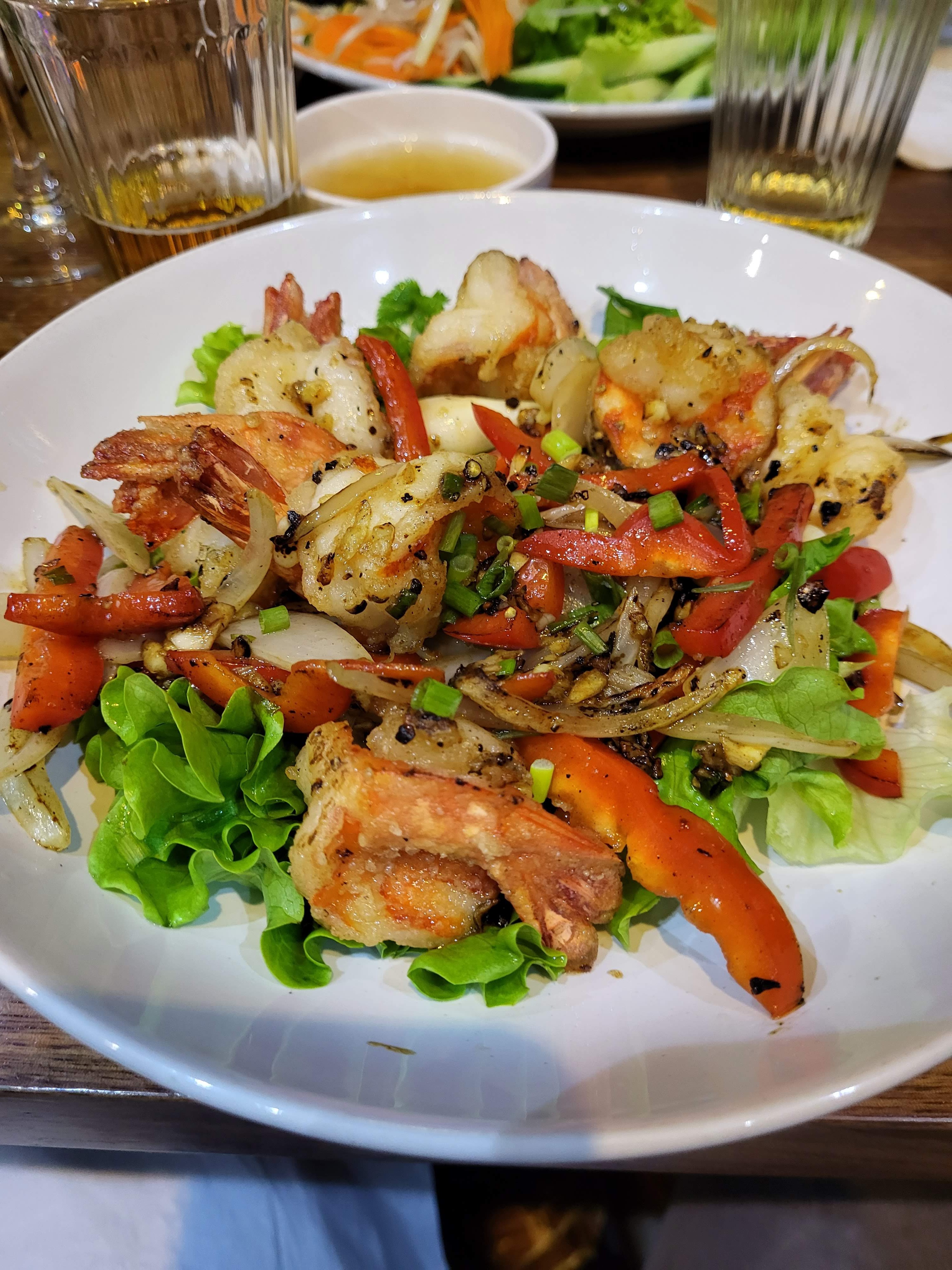 La nourriture était absolument délicieuse. J'ai eu les crevettes sautées au basilic et j'ai beaucoup apprécié. Les critiques font l'éloge du Pho. C'était vraiment bon, mais c'est toujours un Pho, alors gardez cela à l'esprit au cas où vous vous attendriez à être époustouflé :)