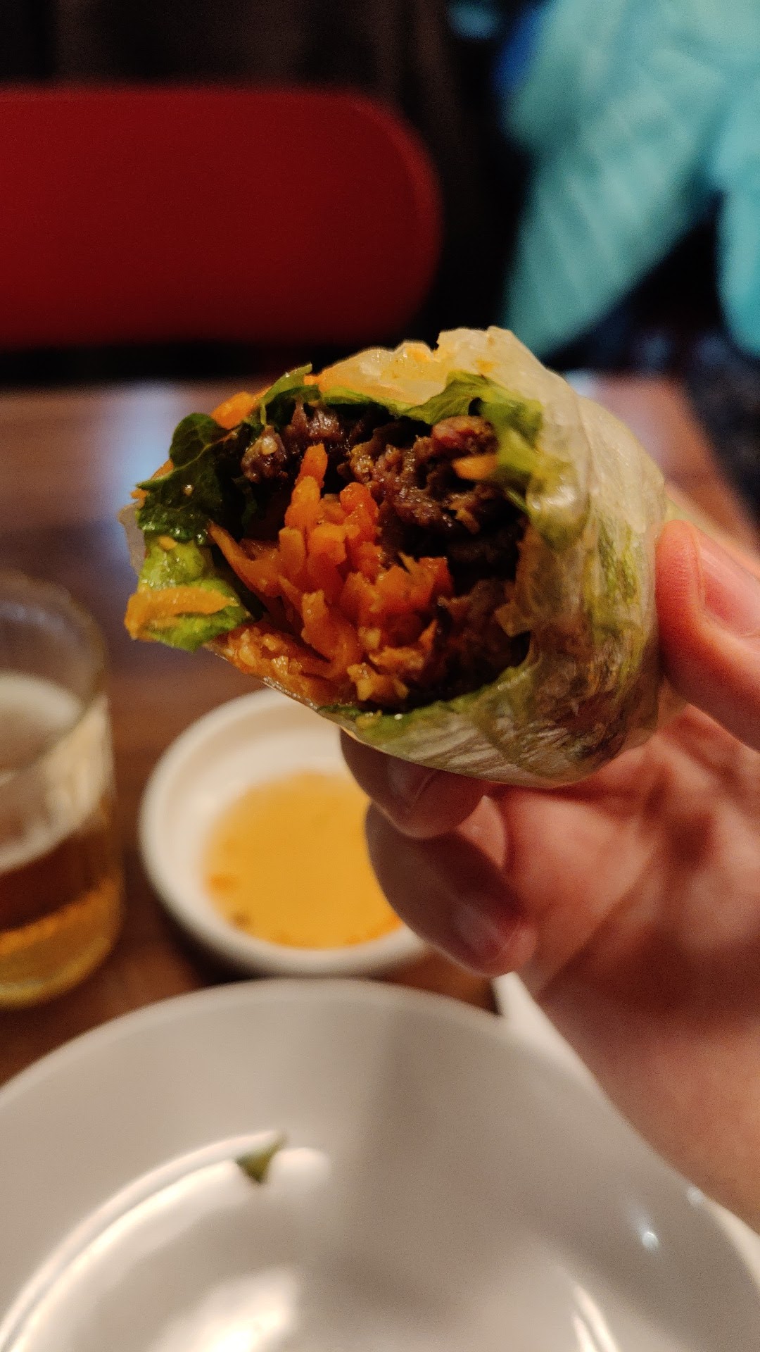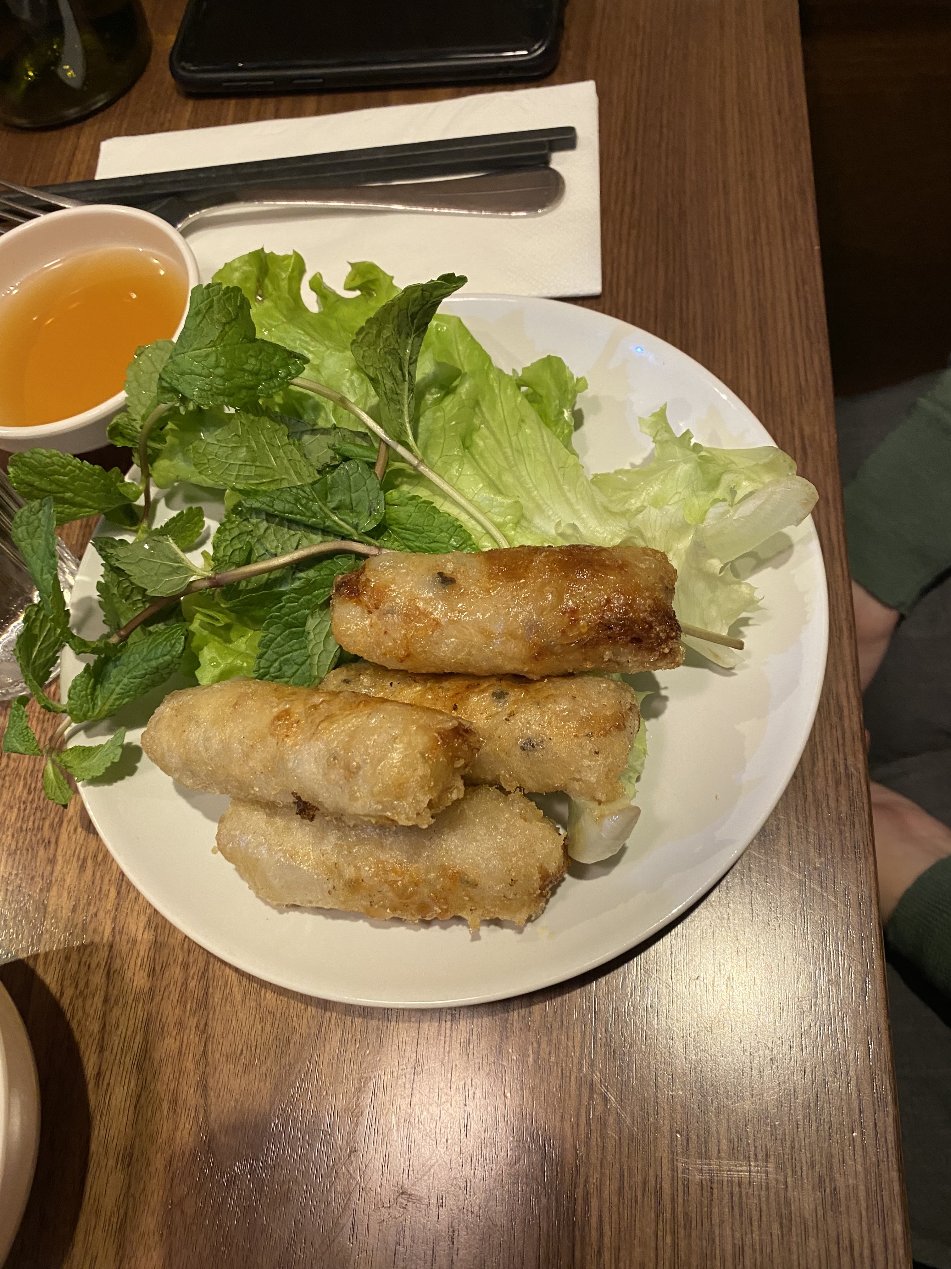 Les rouleaux de printemps au boeuf ont été une bonne expérience culinaire. Je recommande. Tout était délicieux, petit point à améliorer attention à la cuisson de certains aliments ma compagne à eu droit à un de ses trois nems à un tiers cramé. Et son sauté de boeuf une partie de la viande était également charbonné. Sinon une très bonne soirée avec de bons plats.