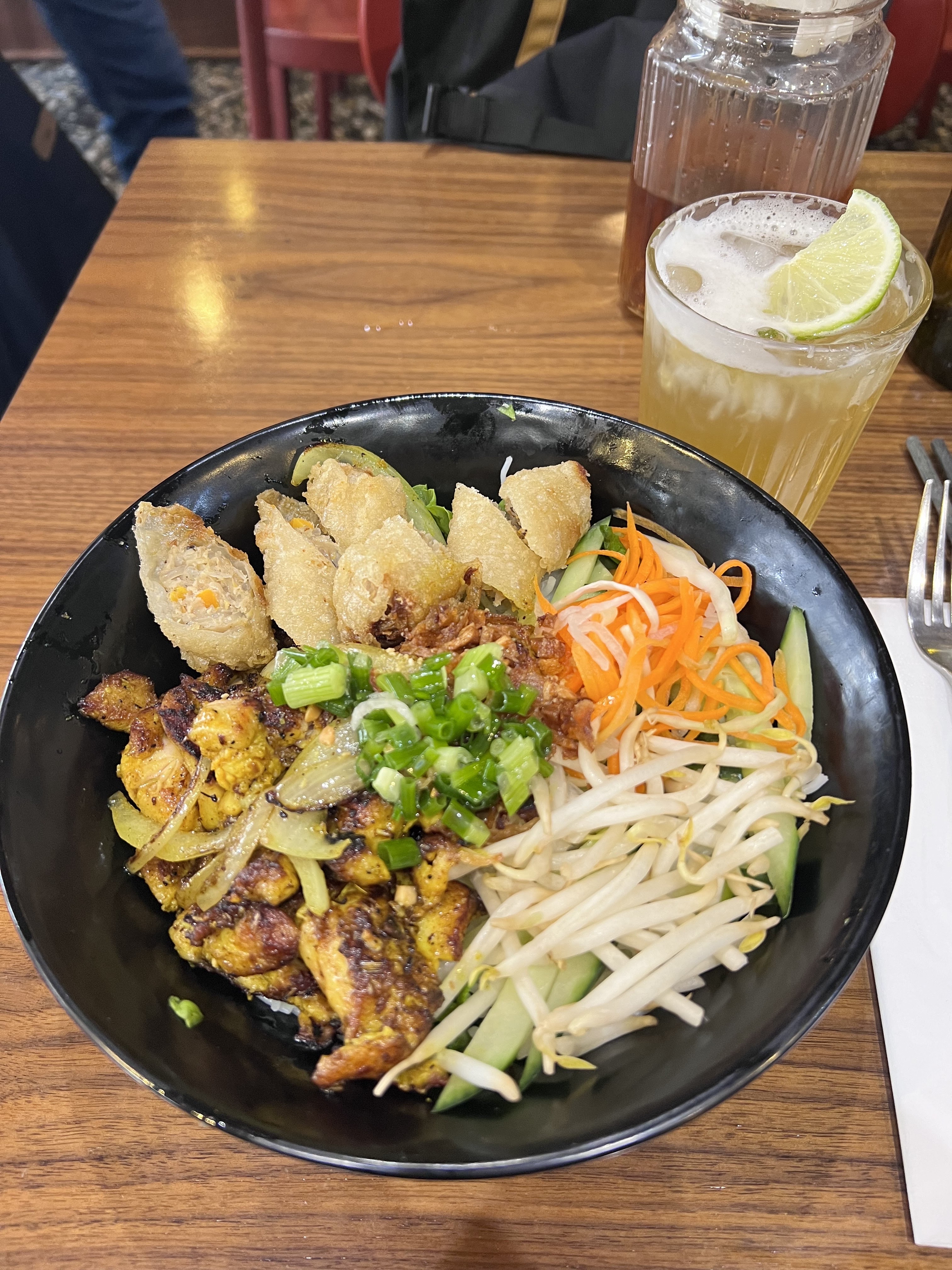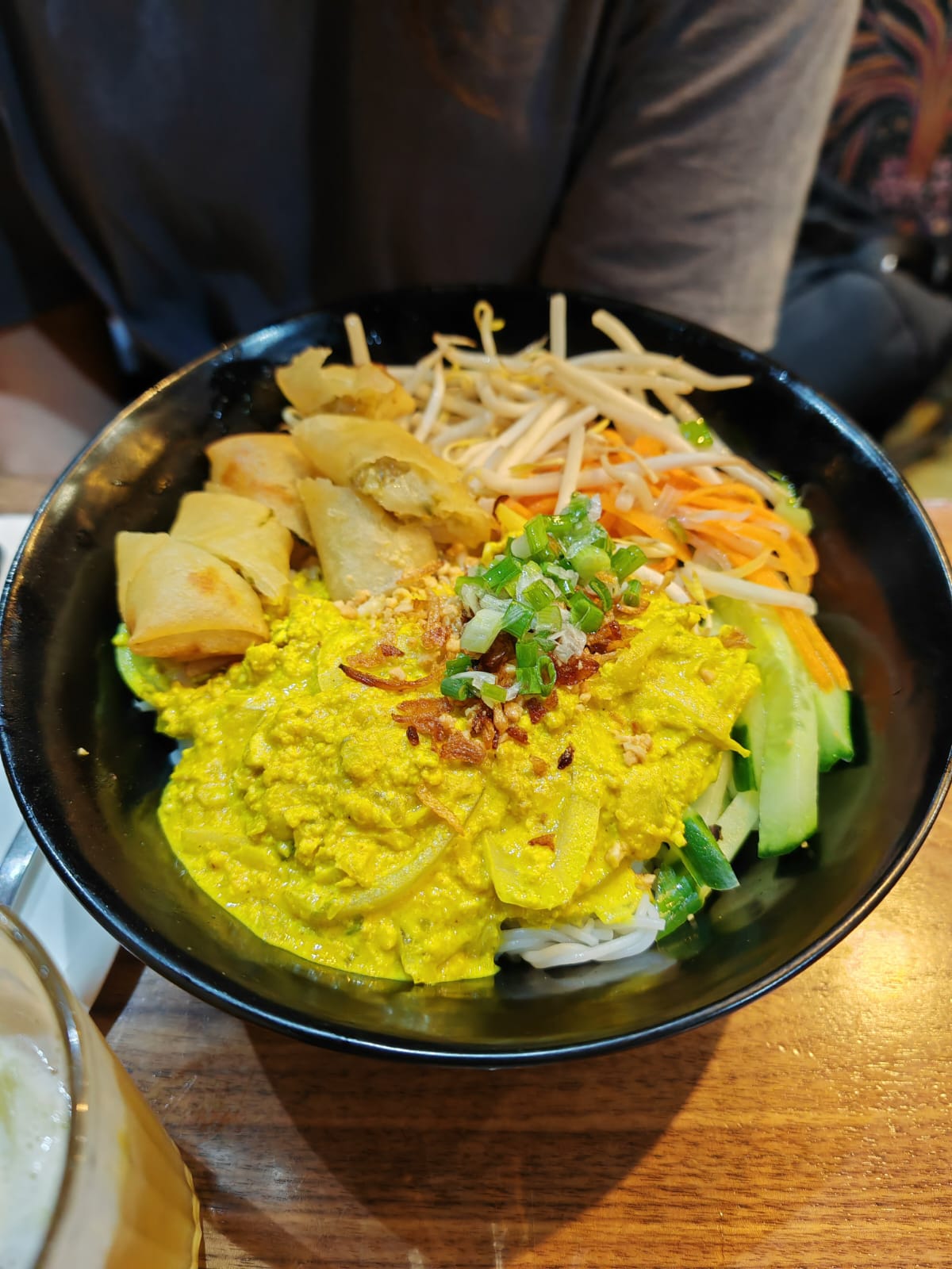 J'y suis allé avec des amis, j'ai eu le Bo Bun Végétarien. Servi avec une sauce au lait de coco, du tofu et des rouleaux de printemps, la saveur est délicate et profonde. Les tranches de concombre croustillantes, les germes de soja et la carotte râpée complètent parfaitement les nouilles udon. Garnis de cacahuètes, ils ajoutent une riche saveur de noisette à la noix de coco. Accompagné de thé au jasmin, je n'ai rien à reprocher à ce plat. Délicieux!