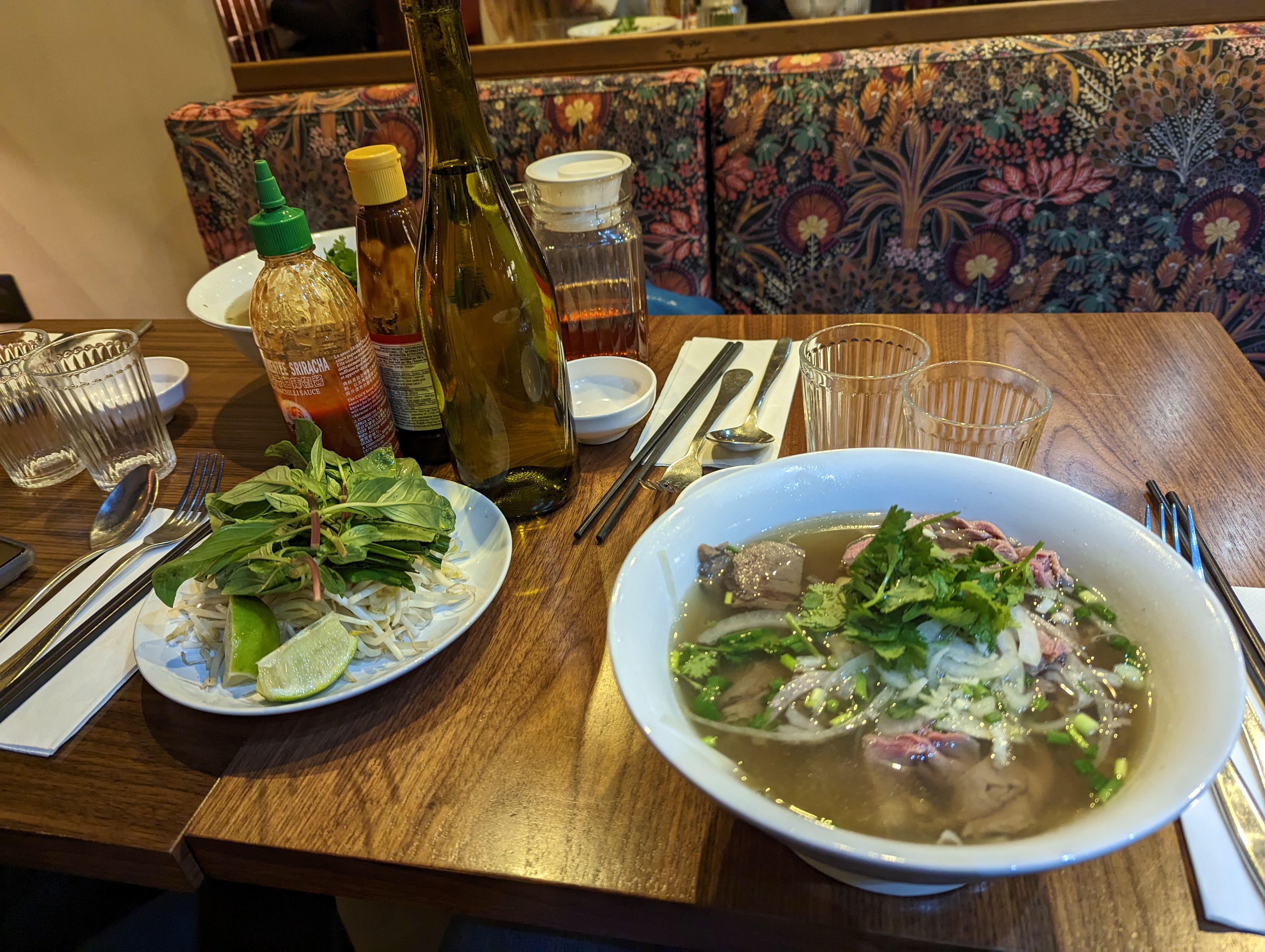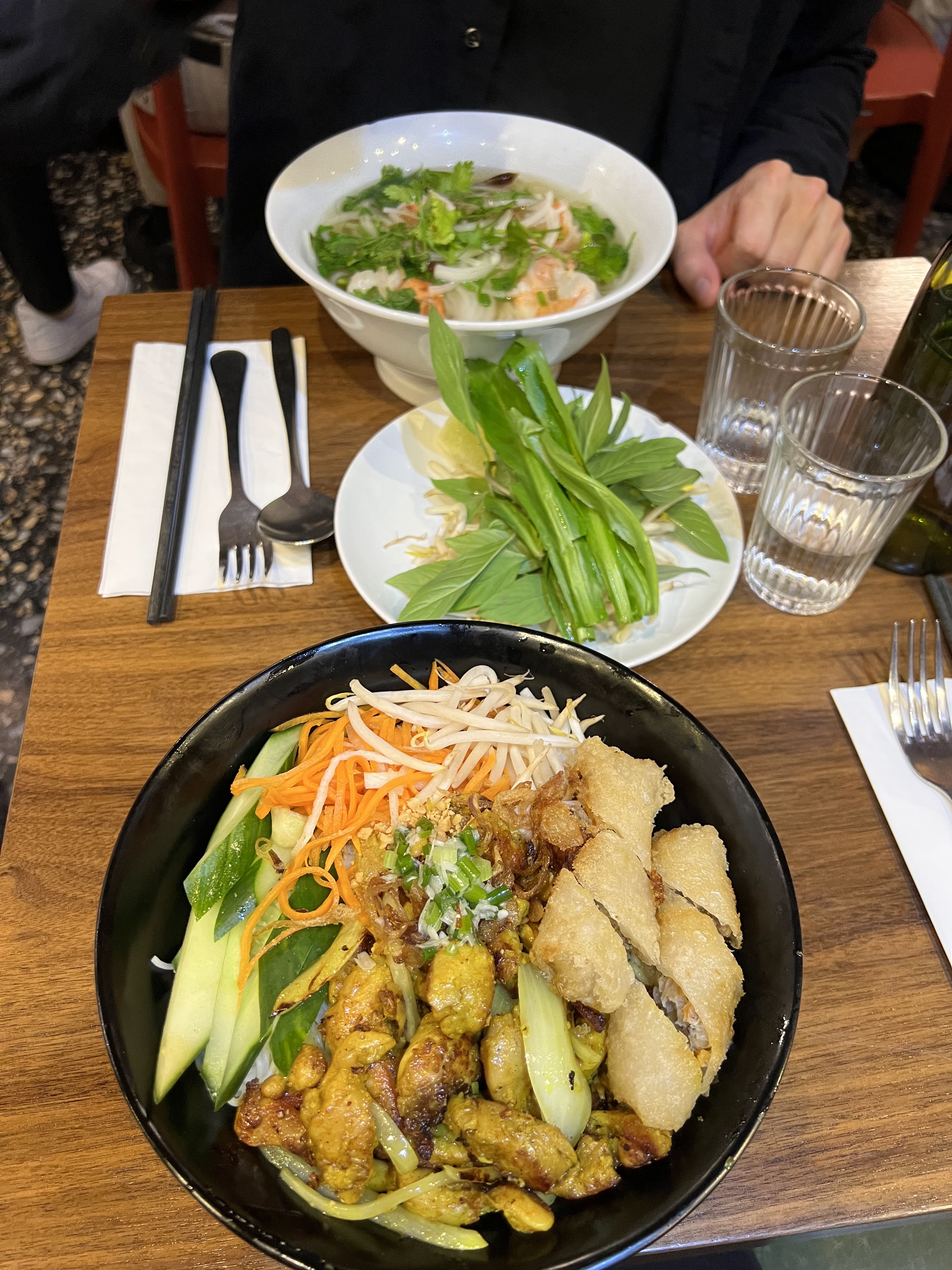J'ai trouvé cet endroit sur Google Maps, bien noté et j'ai décidé de le vérifier. Je suis entré, sans réservation. L'endroit est petit mais confortable. Comme je suis fan de la cuisine vietnamienne, je savais quoi commander. Ma copine et moi sommes fans des sauces et des pho. Nous avons commandé des rouleaux de printemps pour commencer, un Pho au bœuf et une salade de mangue aux crevettes. J'ai commandé une bière Saigon pour moi et un coca light pour ma petite amie. Cette nourriture va droit au but et répond au mieux à mes envies intérieures. Excellent choix pour un repas rapide et facile. Ps : étonné du nombre de livreurs foodora qui se sont arrêtés au restaurant pour récupérer de la nourriture. Ouvre les yeux, cligne des yeux.