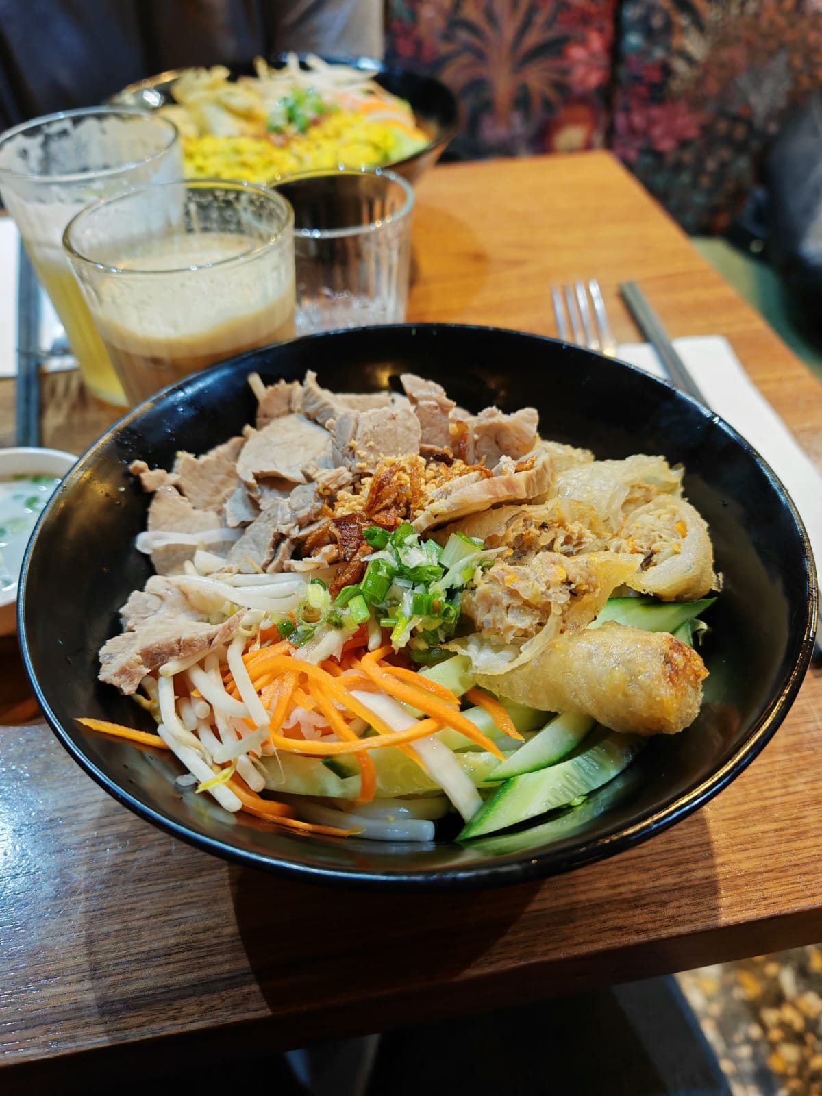Délicieux bo bun au poulet et pho au bœuf. Le bouillon Pho était costaud, aromatique et savoureux et les morceaux de bœuf étaient généreux et tendres. Ils ont les germes de soja standard et le basilic thaï à ajouter et l'offre est généreuse. Aussi délicieux que soit le bouillon seul, ils proposent également de la sauce de poisson, de la sriracha et de la sauce hoisin si vous souhaitez ajouter plus d'assaisonnement à vos plats. Bref, un plat satisfaisant. Le plat qui m'a vraiment surpris était le poulet bo bun. Tous ses composants, y compris les oignons grillés, les légumes croquants, les vermicelles et la viande, travaillent tous en harmonie. La star cependant était le poulet, qui rappelait le satay grillé : tendre, bien mariné et on peut également goûter la douceur de la marinade ainsi que le côté fumé et carbonisé de la viande. Il y a aussi des rouleaux de printemps croustillants dans le plat lui-même, ce qui montre qu'aucun détail n'a été épargné lors de sa préparation. Je n'ai commandé que ces deux plats, mais d'après ce que nous avons mangé, vous pouvez dire qu'il y a beaucoup d'amour dans leur nourriture. Le service était également très bon - notre serveur était gentil et sympathique (parlait anglais aussi !) et était suffisamment perspicace pour offrir à mon mari du piment rouge (piment oiseau) JUSTE AVANT que mon mari soit sur le point de le demander ! Nos meilleurs vœux au restaurant. J'espère qu'ils maintiendront ce niveau de nourriture et de service car j'ai hâte de revenir et d'essayer plus d'articles.