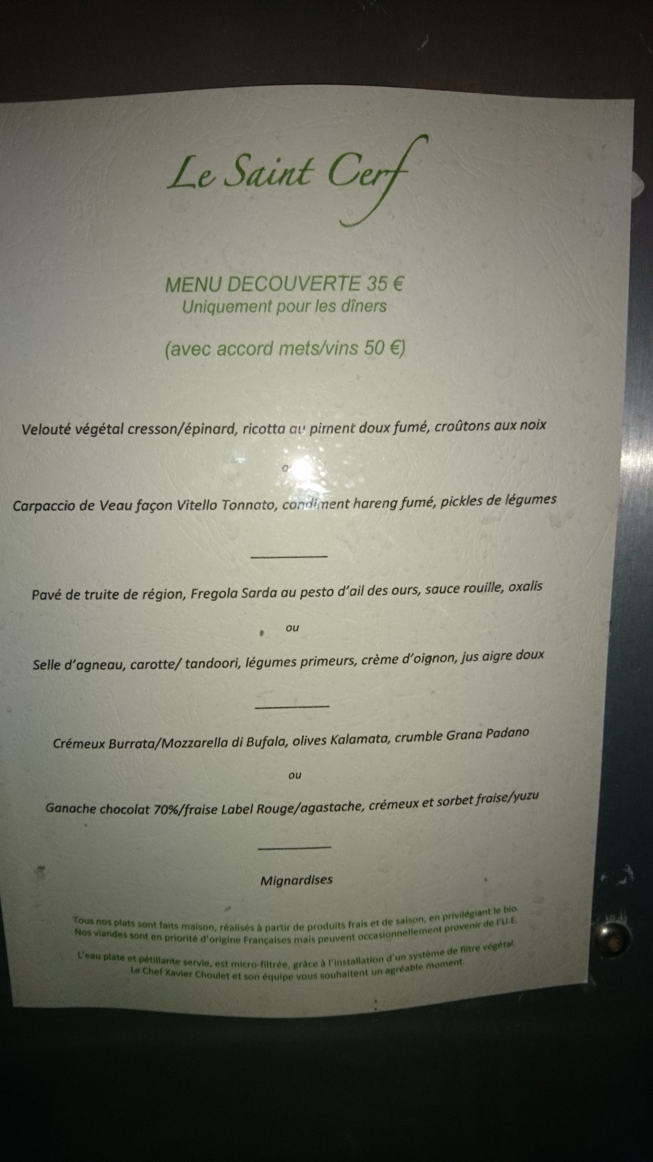 Nous avons passé une très belle soirée au saint cerf. Les plats sont très raffinés, copieux, et le service est très agréable. Je vous conseille le menu 4 plats (entrée, poisson,viande,dessert) avec les 5 verres de vins pour une belle expérience. Les plats et vins proposés permettent de sublimer encore plus les goûts.
