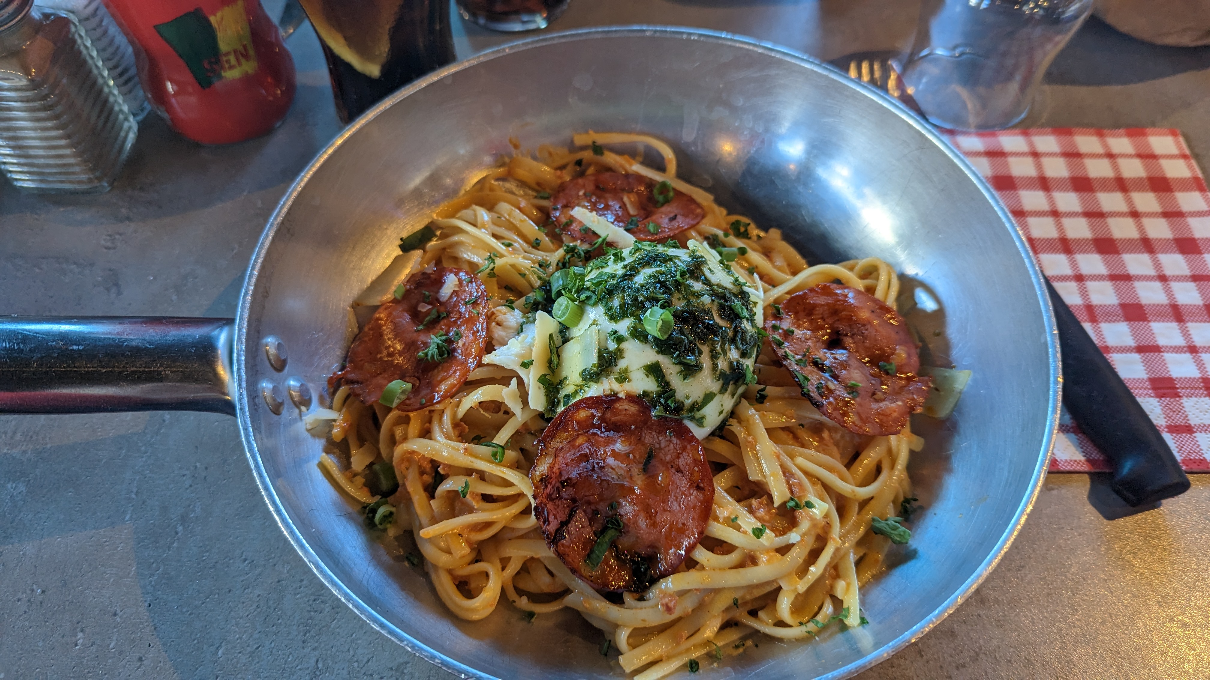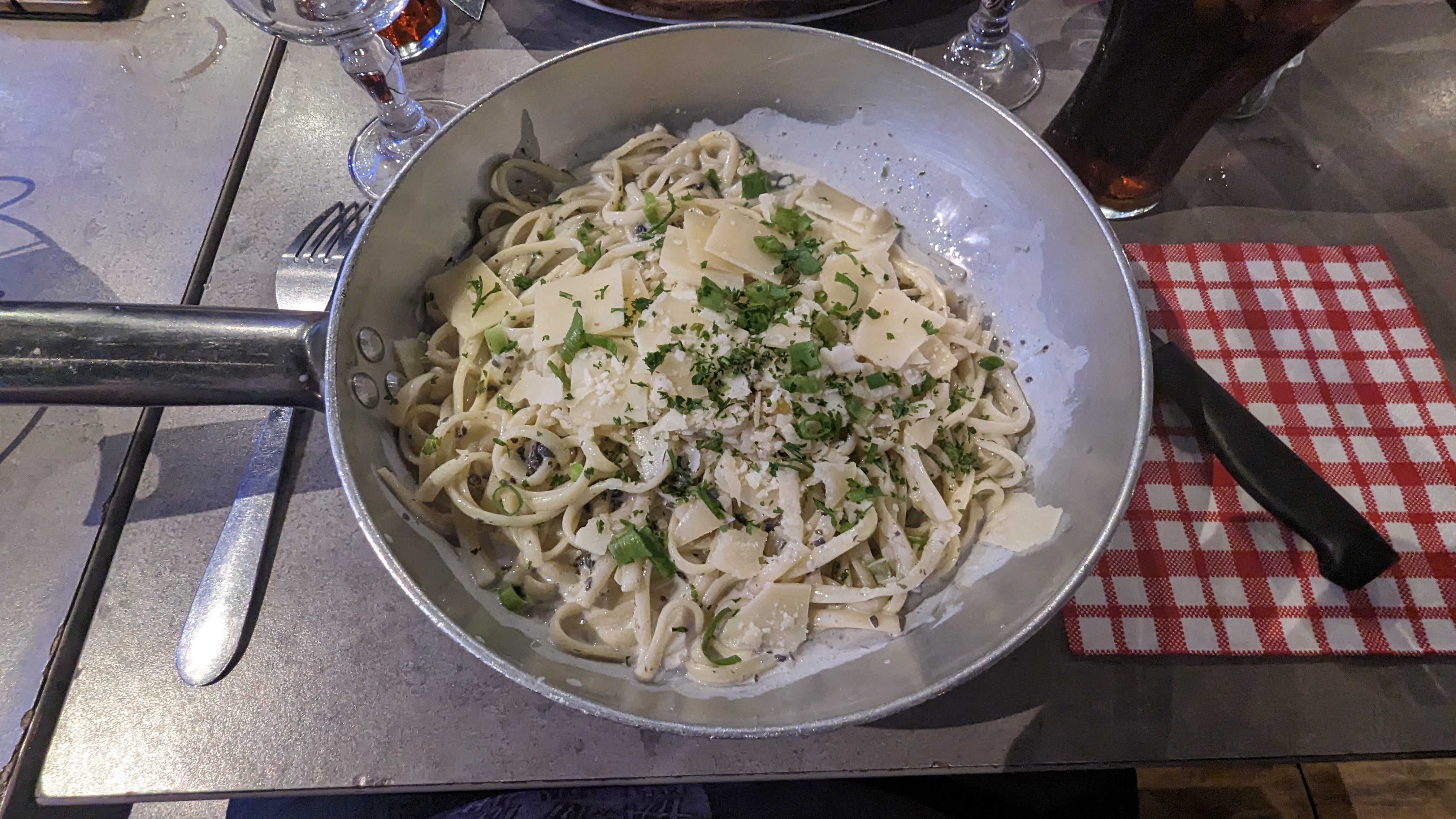 Pates jambon et sauce parmesan excellentes . Excellent accueil par un personnel très jeune samedi soir .