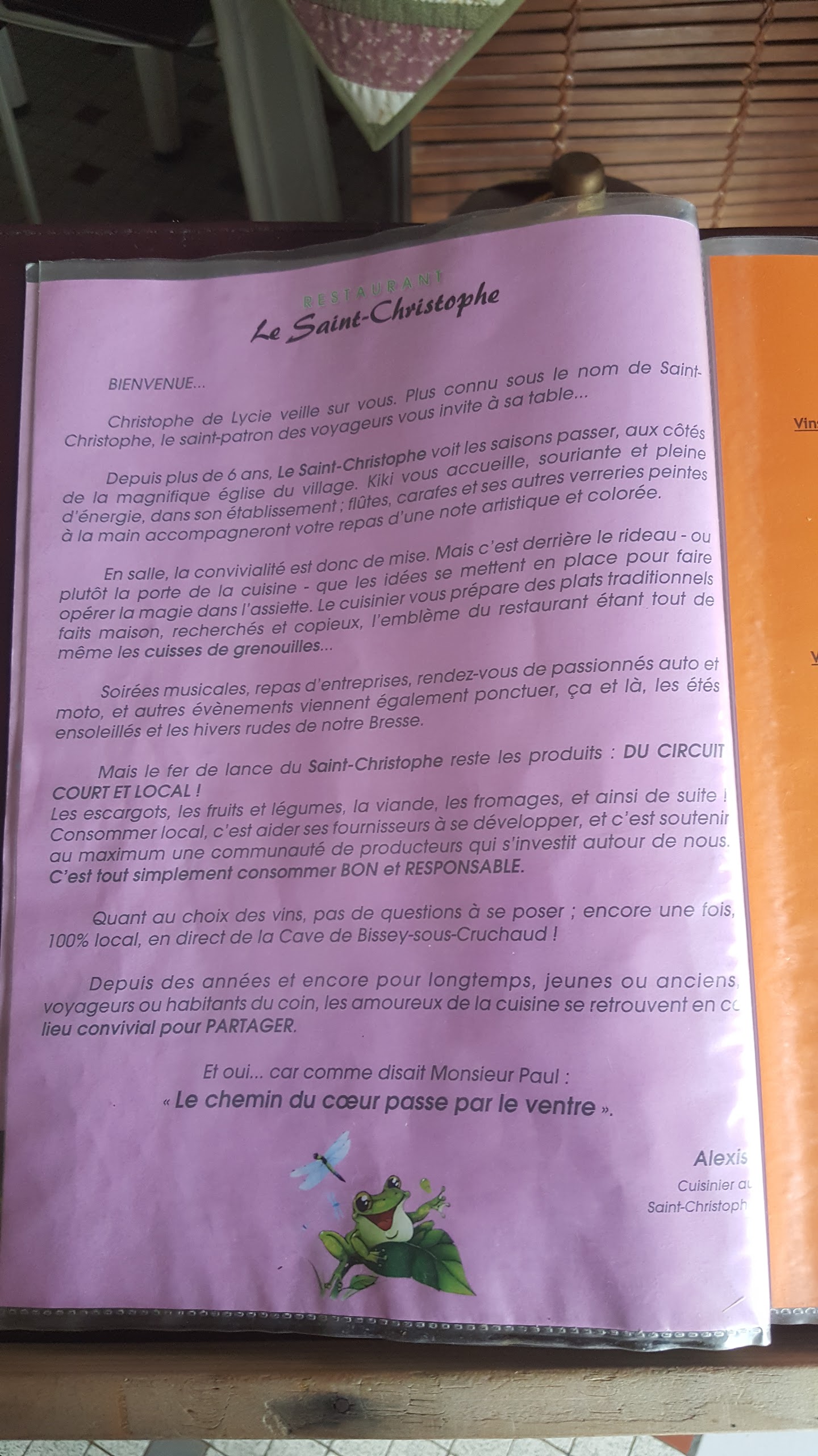 Dans une ambiance familiale, les clients sont reçus comme des amis, ils y retournent d'ailleurs comme de vrais amis, au relationnel constaté en salle... La patronne vous reçoit avec un grand coeur, les circuits courts d'approvisionnement sont un gros plus et la cuisine mérite le détour... la patronne ne cesse de vous vanter les avantages de ce choix et vous recommande les producteurs locaux... Le chef est le fils de notre hôte et ses grenouilles à la crème aux petits éclats de jambon cru du terroir sont une tuerie... Les autres sauces plus traditionnelles sont un délice de goût... Mets succulents, les cuisses de grenouilles à volonté du St Christophe sont légères et très digestes... Incroyable mais vrai, même pour une soirée... et pour les estomacs fragiles... Les bons vins sont présents, entrées et desserts également et la carte permet d'autres plats tout aussi attrayants... Les digestifs, un plaisir de terroir... servis généreusement... Enfin, le prix est raisonnable et la gentillesse de rigueur... Un détour à tenter, une auberge traditionnelle incontournable... Votre réservation peut même être faite par sms, confirmation aussi efficace... Nous ne connaissions pas, aujourdhui nous comptons bien y retourner entre amis... Bonne découverte et sublimez vos papilles... Philippe J.