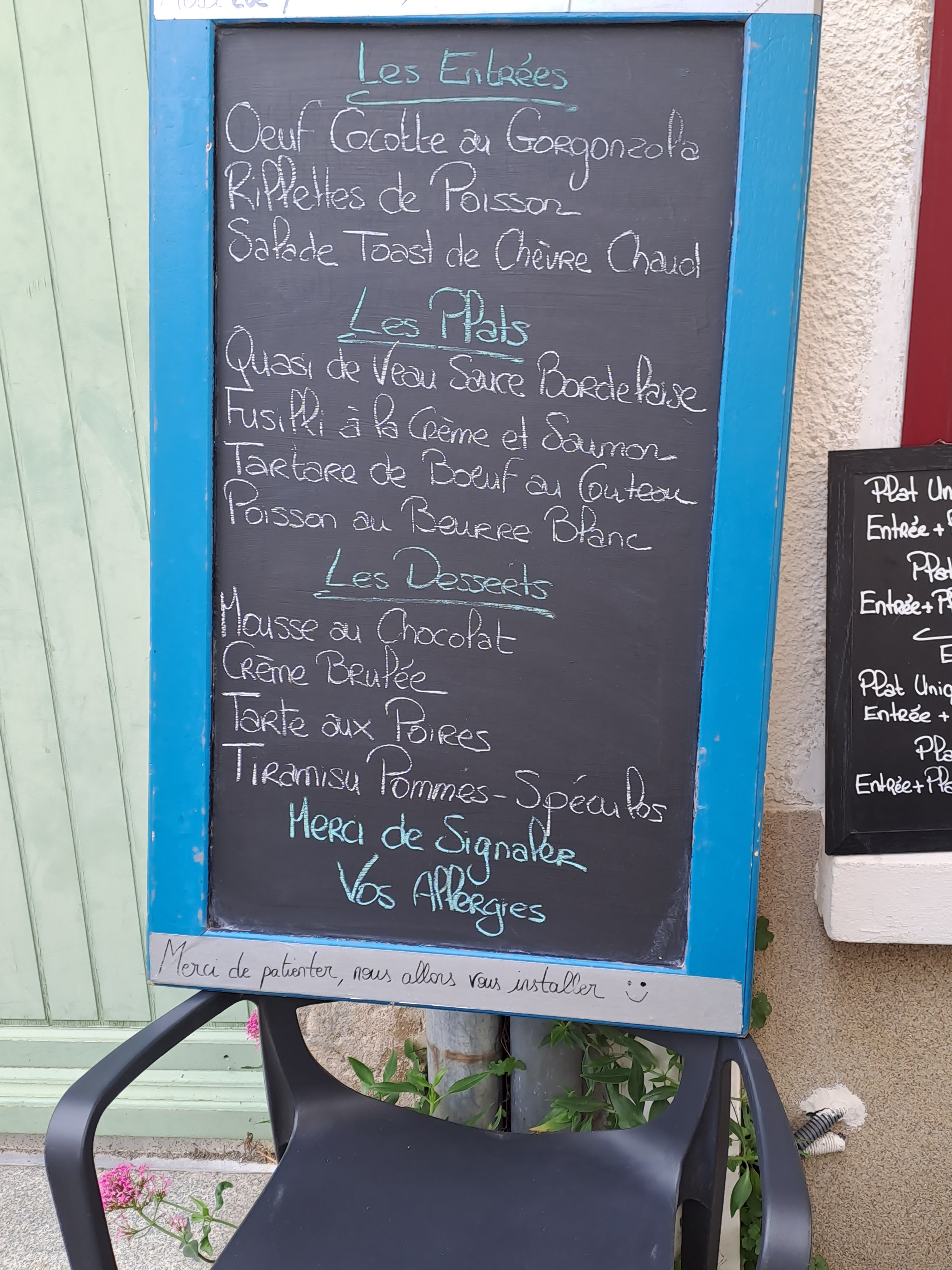 Tres bon restaurant patronne et serveuse synpa et souriant déjeuner sur la terrasse tres agréable pris poisson au beurre blanc et panacotta au citron vert un vrai régale je vous le recommande prix du repas très correcte si vous passez par la arrêter vous vous serez pas déçu du tout