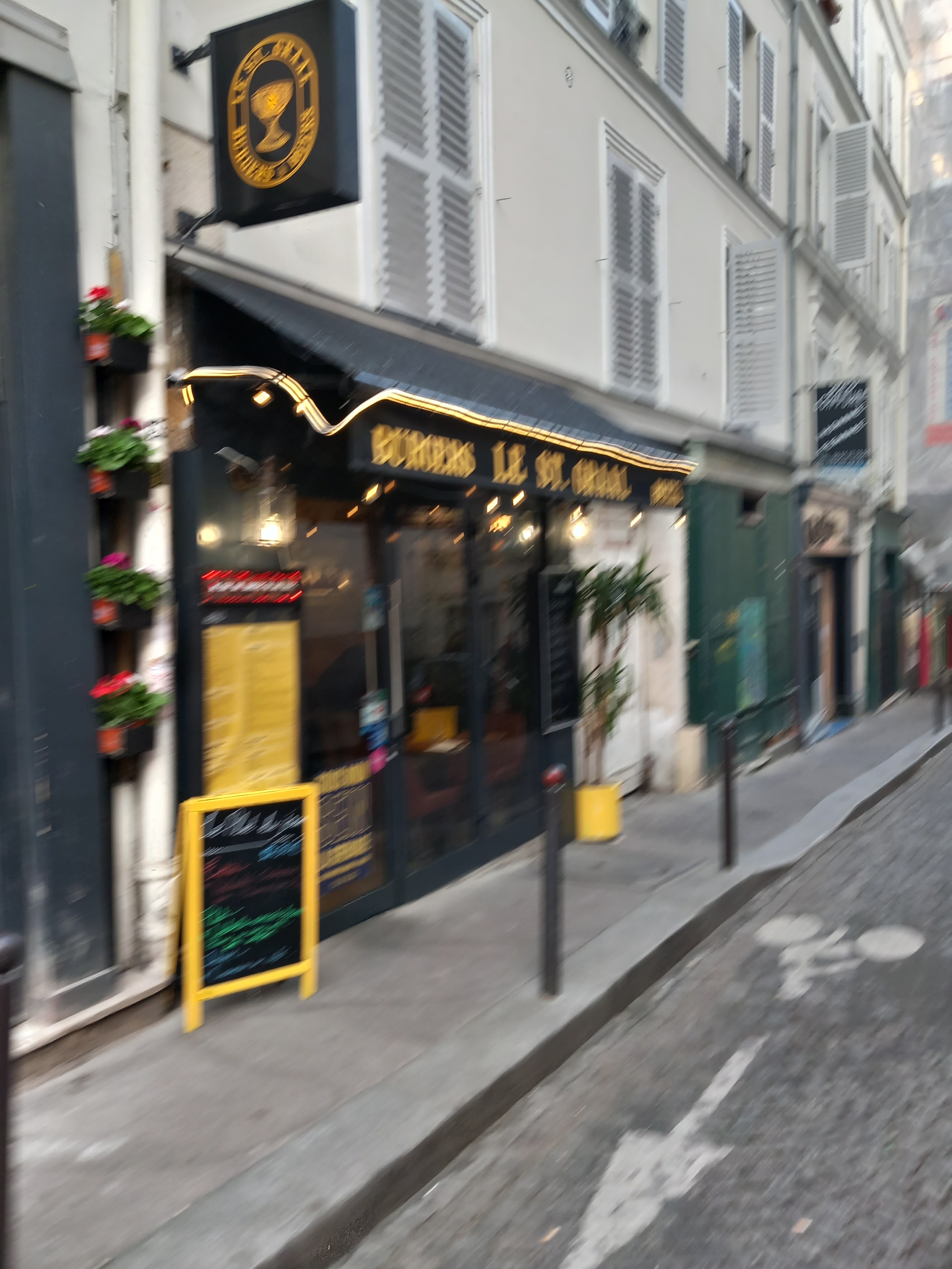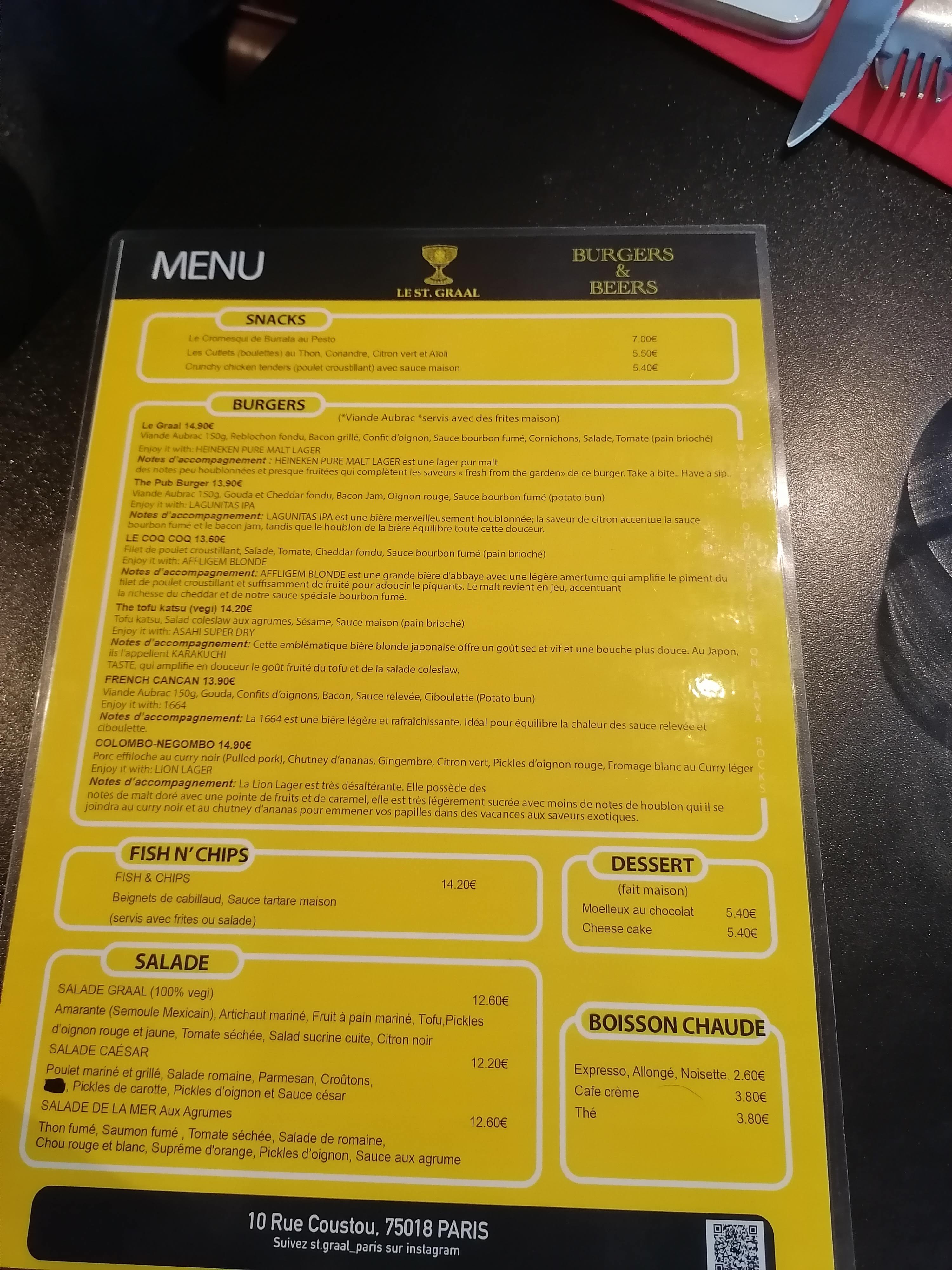 J'ai découvert ce nouveau restaurant par hasard en me promenant dans Montmartre. Très bons hamburgers et frites, salade, etc. Le personnel était très sympathique et rapide. Le spot est situé dans une rue calme. Le nom fait référence au roman « Le Da Vinci Code » de Dan Brown qui se déroule à Paris et raconte l'histoire d'un meurtre au Louvre et la recherche du Saint Graal (« le Saint Graal » en français). je recommande fortement de lire le livre!
