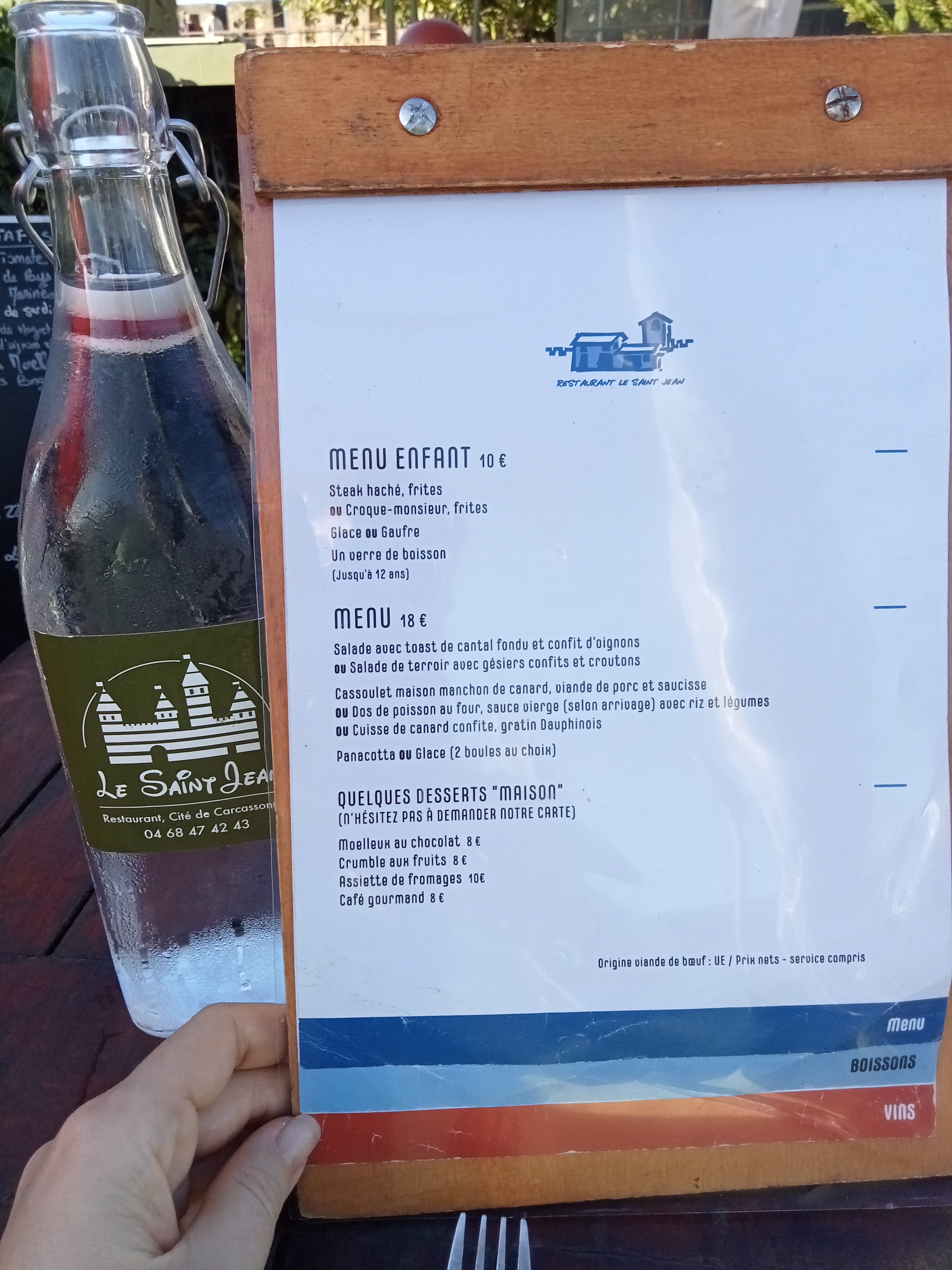 Une jolie découverte. Pour être franc : ce restaurant n’était pas notre premier choix. On s’est fié aux avis des restaurants mieux notés sur Google et TripAdvisor dans Carcassonne. Mais après avoir été reçus comme des pestiférés chez le Cachotier (petite dédicace 😉), nous avons dû trouver une alternative. Après un second refus, poli (lui) ailleurs , nous sommes arrivés au Saint Jean. Là : pareil. « On est complets, mais je vous réserve une table si vous voulez… » Super sympa. En deux temps trois mouvements : la table est dressée et prête. On prend : Un menu enfant avec croque-monsieur et gaufre, Un menu (salade, cassoulet et glace), Deux burgers, Une bière, deux cocas zéro et un ice tea. On finira par un café. Le tout pour 75,20€. Le service est un peu long, pour être franc. Cela dit : le cassoulet est très bon, même si brûlant. (À ce propos, j’ai vu des avis disant que les portions sont petites : je suis bon mangeur, et je vous garantis qu’il faut se l’encaisser !). Le burger est cuit à la perfection et bien composé. Les frites sont VRAIMENT « maison ». La terrasse est un peu balayée par les vents (le temps n’était pas au top). Mais tout le personnel était souriant… Ça sentait le travail d’équipe et le plaisir de régaler les clients. Au final, les deux seuls reproches à formuler pour chipoter sont le temps de service un peu long et les toilettes un peu « congestionnées ». Mais pas de quoi enlever le moindre bout d’étoile ni se gâcher le plaisir d’avoir été si gentiment reçus. Merci à l’équipe. Ce fut un plaisir… (Je vous avais promis de vous faire un avis aux petits oignons ! J’ai tenu parole !)