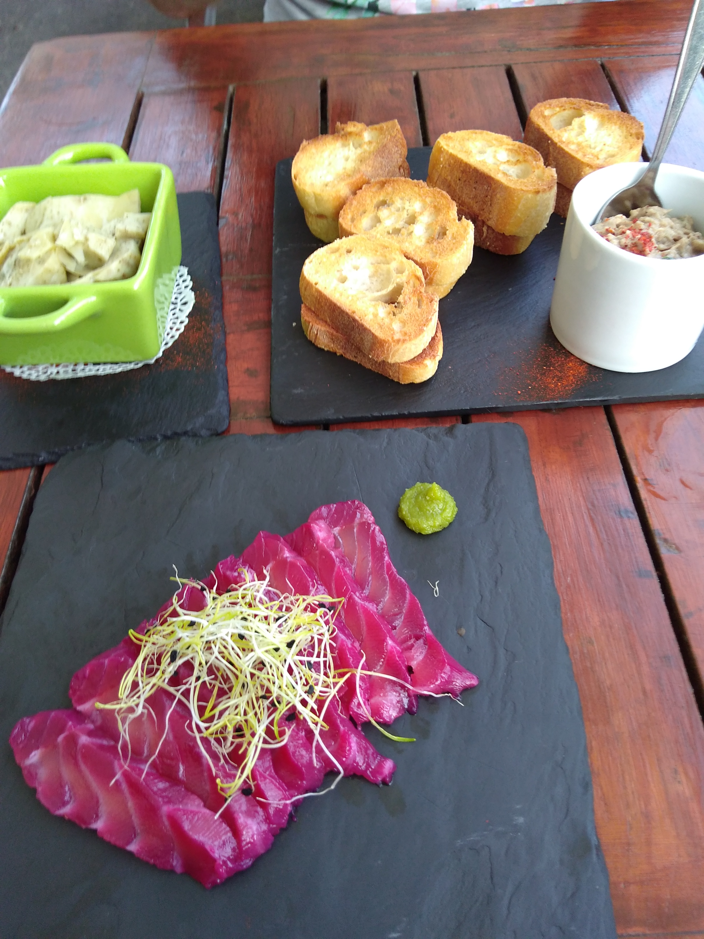 Cauchemars culinaire ! Pour la première fois de ma vie j’ai demandé l’addition après l’entrée sans aller plus loin dans le repas ! Malgré l’aimable proposition du serveur de nous offrir les entrées et de nous servir le reste ! Mais quand un restaurant propose en tapas ... des artichauts, qui arrivent dans une cassolette remplie d’huile avec du pain grillé et en guise de pan con tomate, une espèce de bouillie dans un pot à yaourt avec le même pain grillé ... on arrête le massacre tout de suite ! Le serveur ayant reconnu que les artichauts venaient d’une boîte ouverte et mise dans la fameuse cassolette ! Donc pour moi une expérience affreuse !