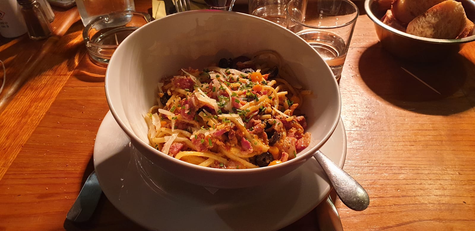 Dommage que le serveur ne soit pas assez pro. Il nous a quelques peu oublié et n'était pas suffisamment enclin à accepter son erreur. Il n'a visiblement pas terminé la soirée pour le bien des autres serveurs/serveuses. Des assiettes plutôt belles et généreuses. C'était bon, menu à 28€, bon rapport qualité prix. Quelques fausses notes, une panière sale de ketchup sec en dessous, un verre d'eau qui était sale et un poisson limite dans sa cuisson à coeur.... manque d'attention !