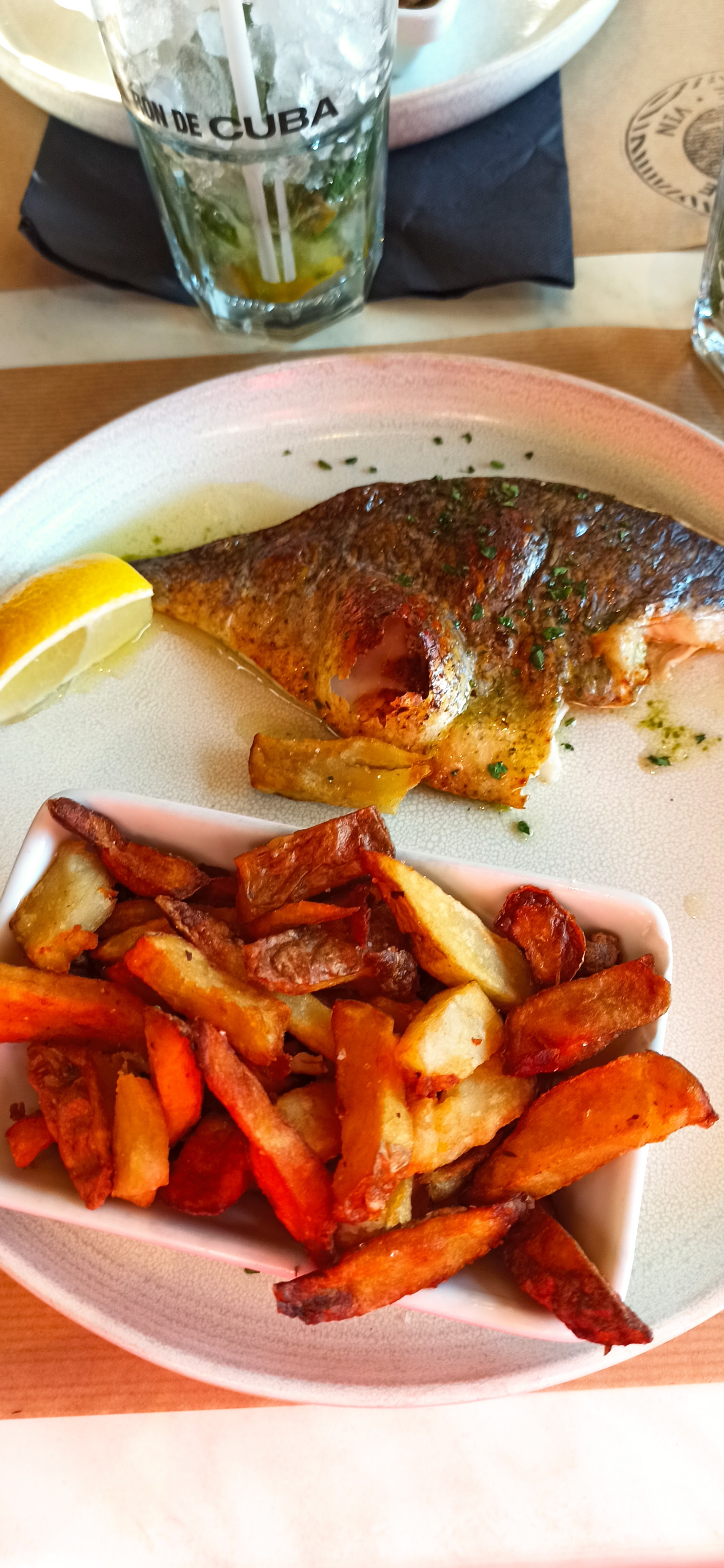 Nous y sommes allé ce 15 août, nous étions 3 adultes et 1 enfant. La zone possède un atout indéniable, les jeux d’enfants au centre de la place. Pour ce qui est du restaurant, les cocktails sont bons, leurs prix sont élevé à mon humble avis. Nous avons pris un carpaccio de saumon, bon, copieux et frites maison. Des seiches à la plancha, bon également. Et enfin un saumon, là par contre pour le prix, la part de saumon était un poil petite. Et un menu enfant nuggets frites, correct. Nous avons également pris des desserts 3 coupes caramel liégeois, simple. Si ma mémoire est bonne nous en avons eu pour 139€. Niveau ambiance rien d’exceptionnel ce soir là, niveau qualité, c’est correct. Niveau prix on commence à se rapprocher d’un bistronomique, dommage. Le service était correct. Ce n’est qu’un avis suggestif en fonction de mon expérience et de mes goûts. En résumé les plats sont bons, parfois pas assez copieux en fonction du prix. (En photo: cocktail piña colada et carpaccio de saumon)