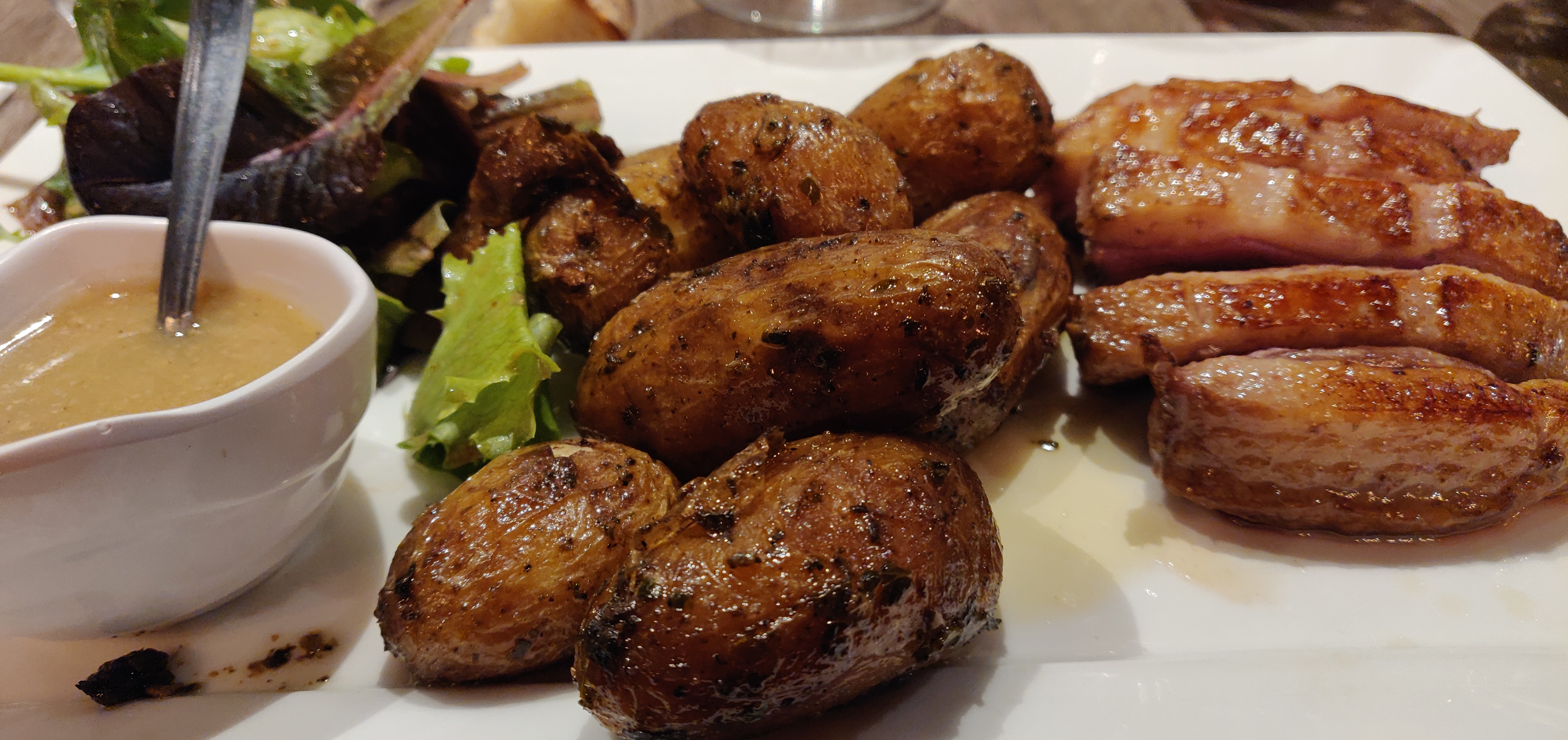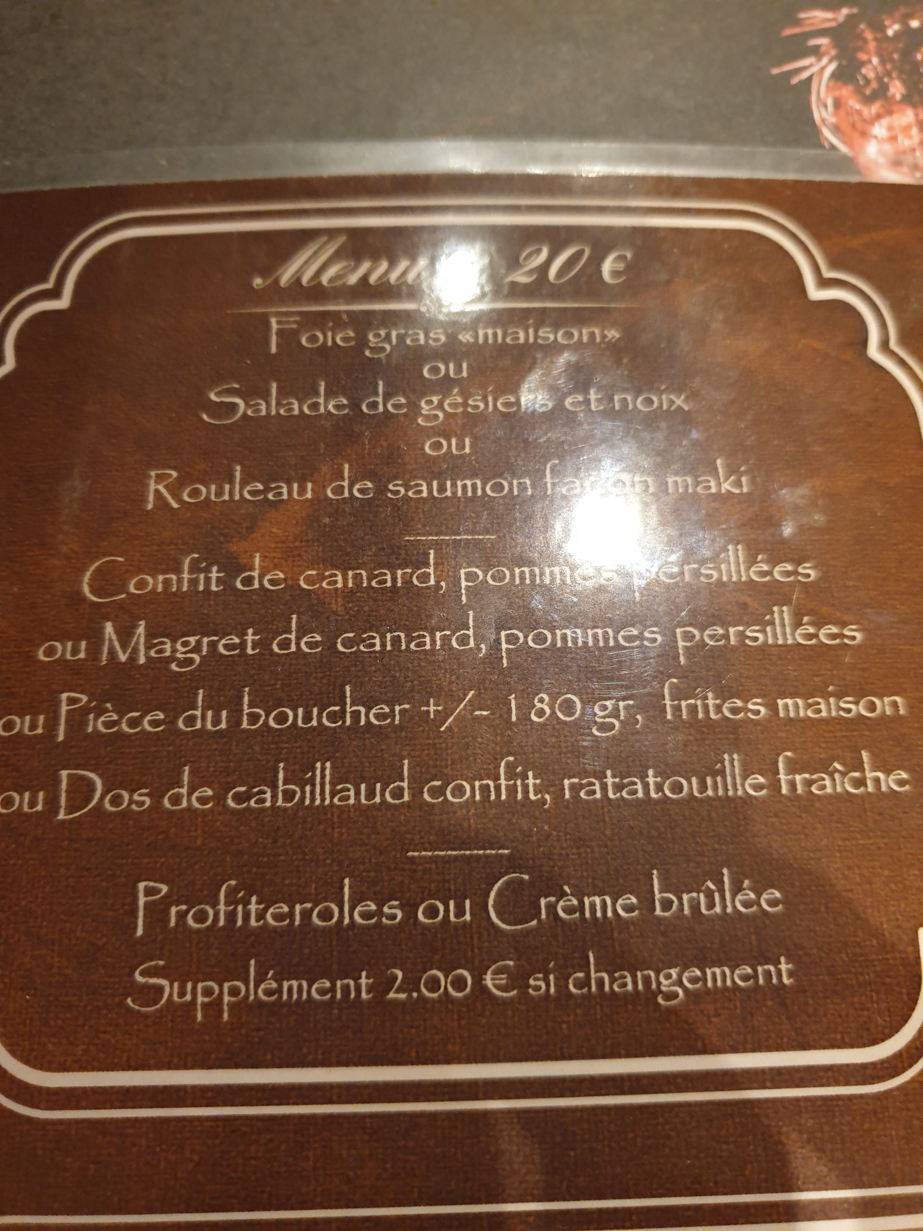 Nous avons beaucoup aimé le menu à 20 euros, à ce prix là nous avons mangé le foie gras maison, le magret de canard et ses pommes grenailles, et nous avons fini avec de très bonnes profiteroles. Nous nous sommes régalés et nous avons été rassasié pour la journée 😉