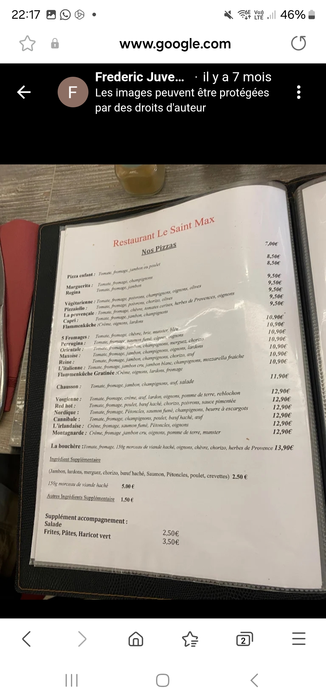 On tente Pizzas à emporter, une lorraine, une 5 fromage!Que dire... A part aucune saveur. Pâte fade, sauce tomate du commerce, produits sans goût... De plus on rajoute un fromage à peine fondu à une pâte avec un manque de cuisson. En allant sur la barre de recherche, on tombe direct sur la pizzeria et une carte avec des prix correct. Sur place, surprise 25€80...au lieu de 20 euros.En rentrant je regarde de plus prêt, il fallait prendre la 3eme carte.... Désolé... La flammenkuche gratinée sans oignons à emporter à 20h30 Carte 1, 2 sur Google La 3 ème avec les bons prix sur facebook