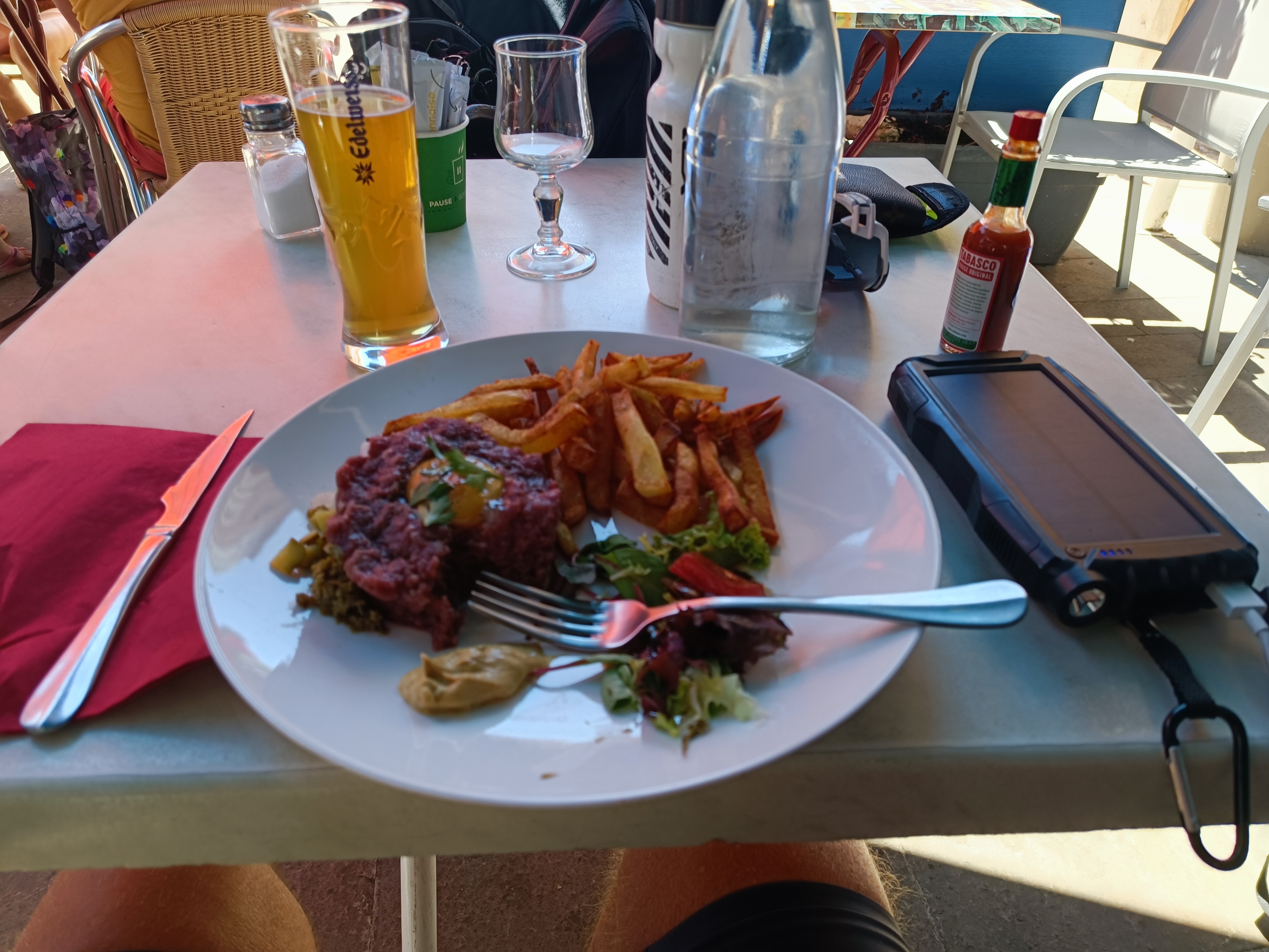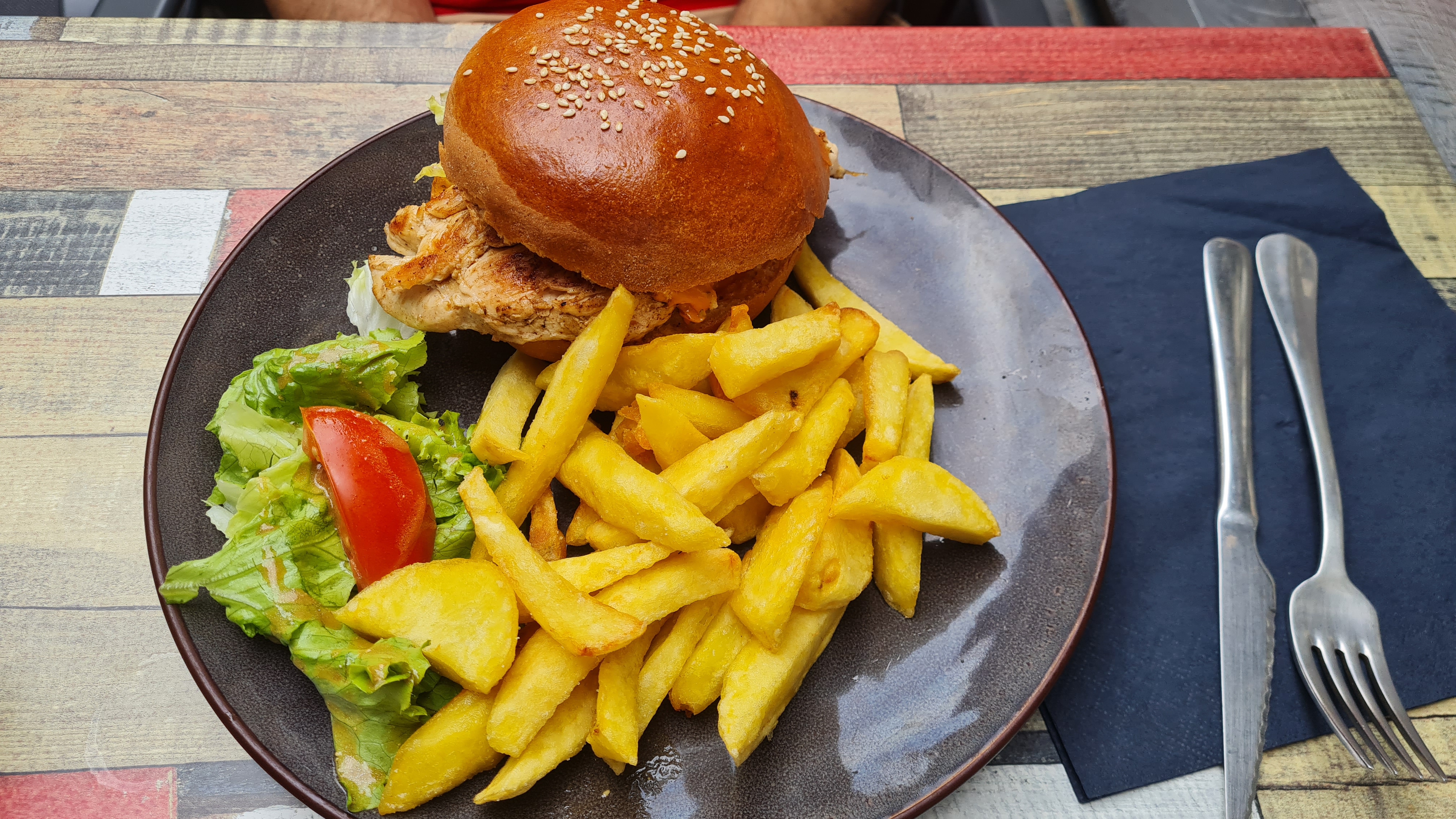 Nous avons mangé ici lors d'une escale sur le chemin du retour en Italie. Nous avons commandé un burger avec pommes de terre, un plat du jour (moules frites) et une salade Paysanne. Bière, coca et eau. Nourriture abondante, bonne qualité et prix moyens.