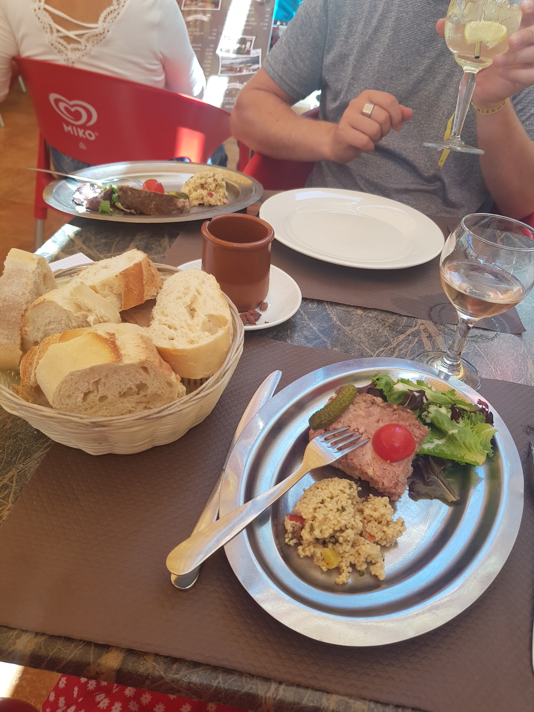 Repas de midi à 24 €. Terrine de sanglier : j'y crois pas, pas typée sauvage (car quand le sanglier c'est de l'élevage, autant appeler ça du porc) et des terrines de porc j'en ai mangé des meilleures. Lapin aux herbes avec une sauce épaisse de consistance industrielle, très lourde à digérer encore le soir à 19h! Avec cette sauce on ne sentait pas les herbes. J'aurais plutôt vu un lapin cuit au vin blanc avec des branches de thym, de romarin, plus parfumé. La tarte aux myrtilles était bonne.