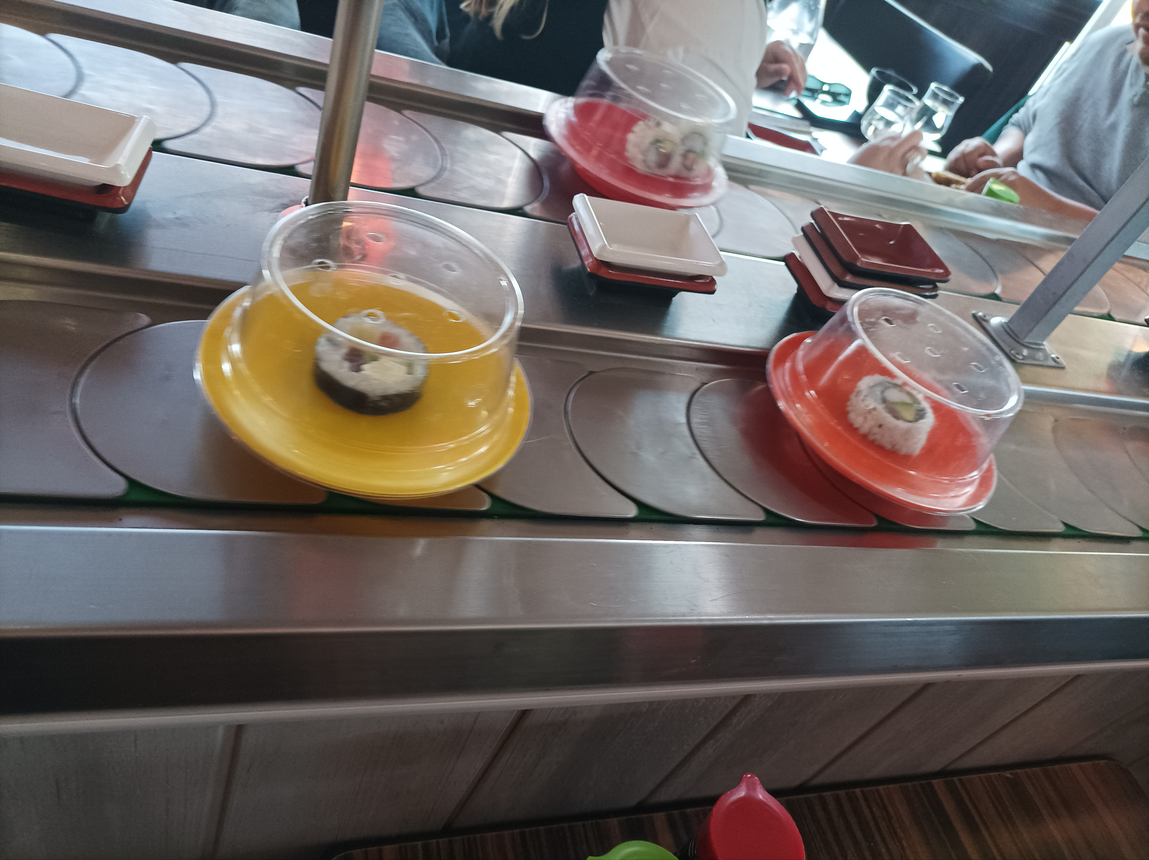 Les points positifs : concept du tapis roulant marrant, plutôt pas mal de choix, personnel souriant et boss sympathique. Les points négatifs : vaisselle collante ou mouillée, plastique à outrance, des choix de sushi selon les heures qui changent pas mal et peu de goût. Des toilettes côté hommes poussiéreuses pas très entretenues. Pour les adeptes du bio, à éviter