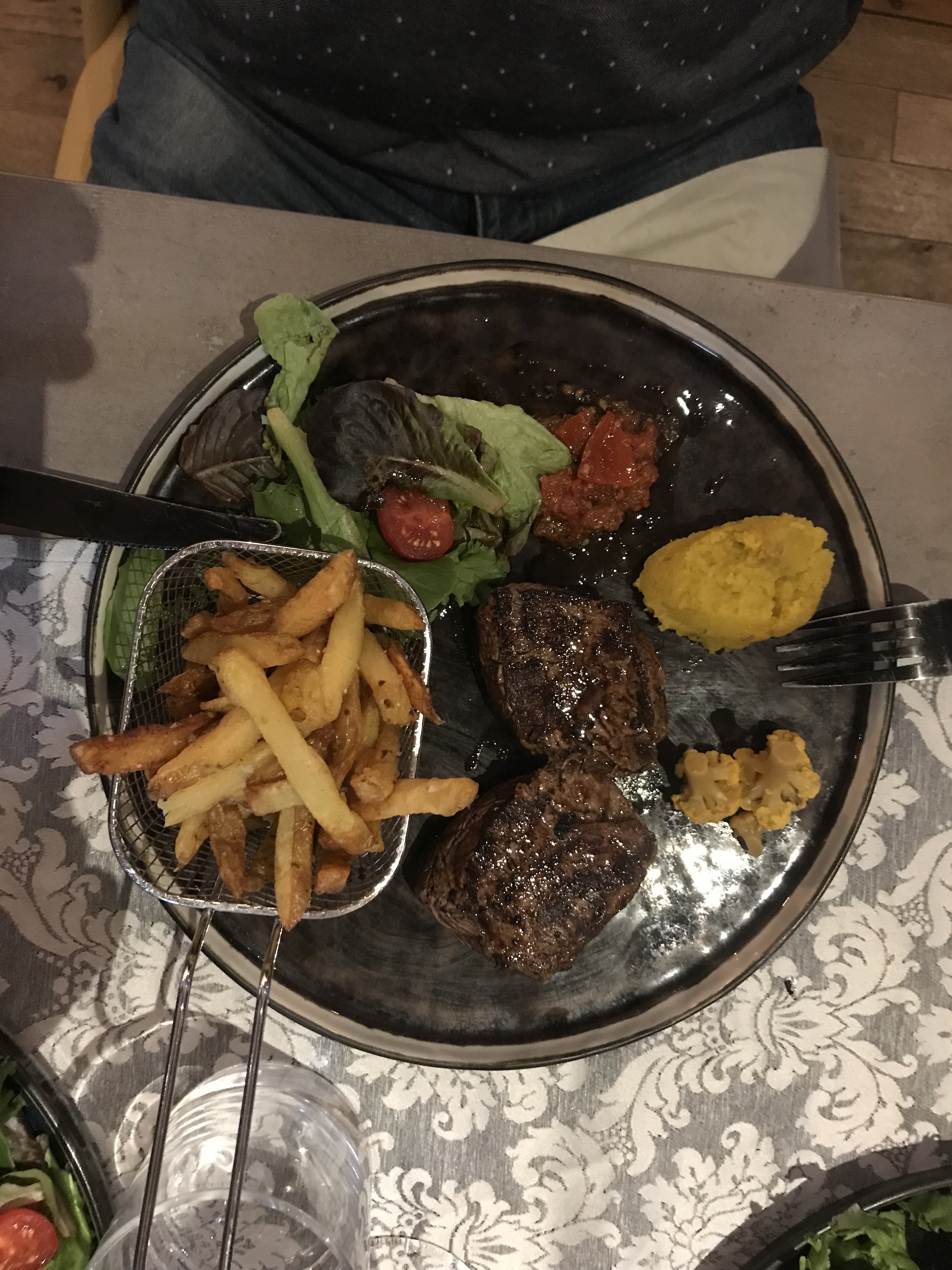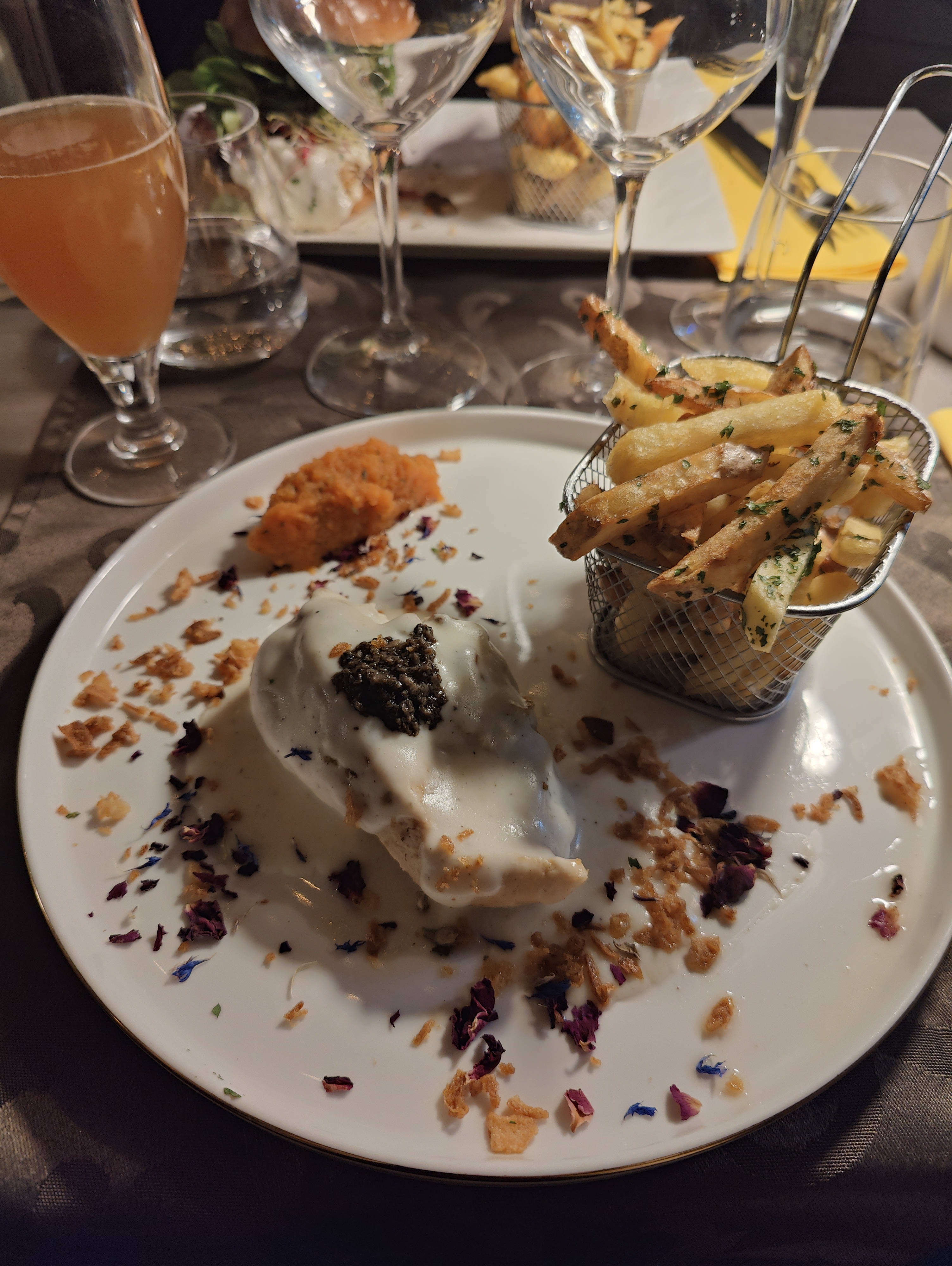 Bonne expérience mais rien de spécial. Nous avons demandé de la viande mi-saignante et avons dû la renvoyer deux fois pour la griller à nouveau car elle était encore crue. L'escargot en entrée était délicieux ! Les serveuses étaient très maladroites : laissant tomber nos couteaux et fourchettes par terre, renversant du vin au moment de servir... pas très professionnelles. Le propriétaire est un gars hyperactif sympa qui est toujours là et qui intervient pour s'assurer que tout va bien. Les frites en accompagnement étaient soit trop grasses, soit brûlées Malheureusement, le dessert comportait une pâtisserie vieille et non croustillante, donc elle n’avait pas bon goût. Dans l'ensemble, nous avons payé autant qu'un restaurant Michelin de la région qui était bien meilleur pour le même prix.