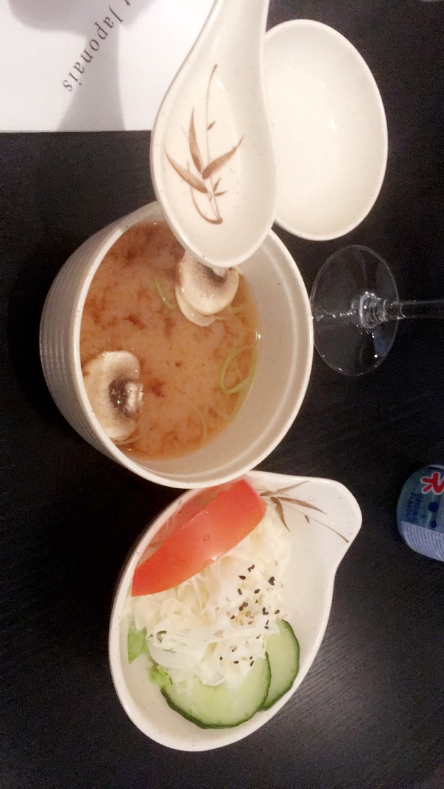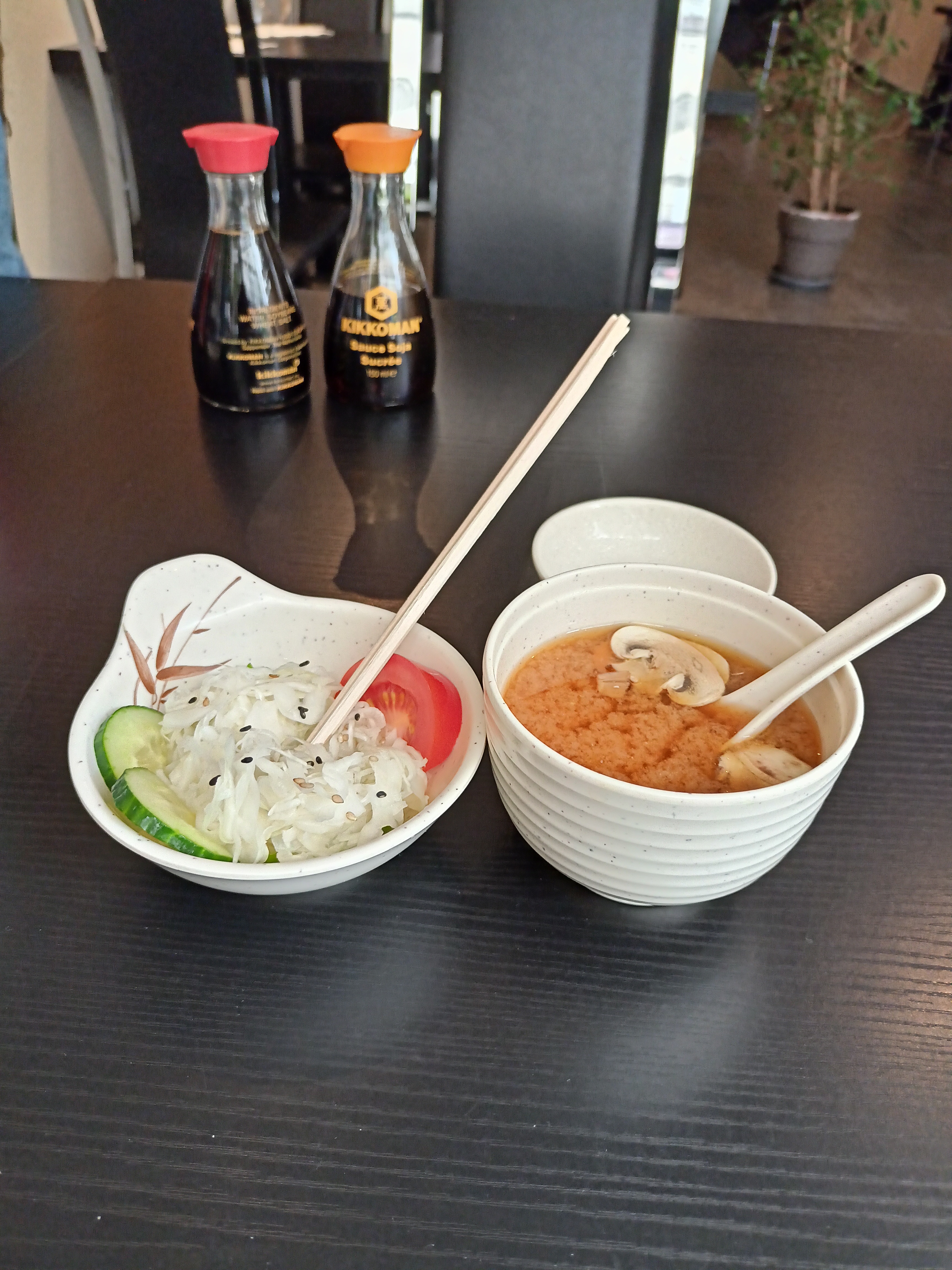Restaurant calme et lumineux. Un assortiment de sushis Et de brochettes delicieuses. Une soupe miso juste comme il faut Et une salade de choux juste comme il faut.