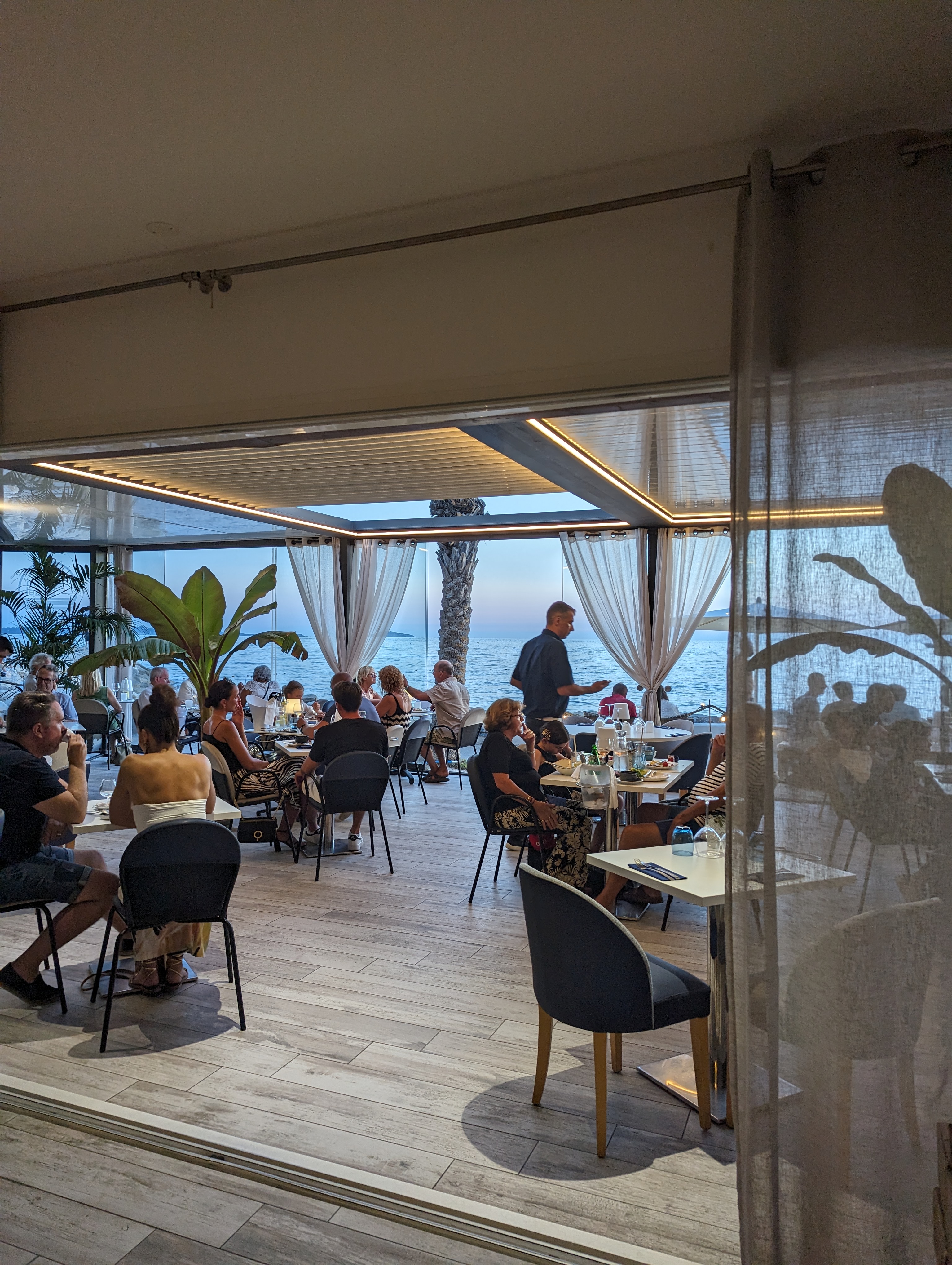 Vue mer magique, restaurant magnifiquement décoré, serveurs parfaits (temps de service entre les plats parfait, efficaces, aux petits soins).Concernant les plats, un petit bémol par rapport à la simplicité de la cuisine vu le prix (notamment accompagnement de la bavette et la sauce), hormis pour les desserts qui sont extras. Mais nous y retourneront avec grand plaisir vu l'enchantement de tout le reste! Nous avons passé une très belle soirée.