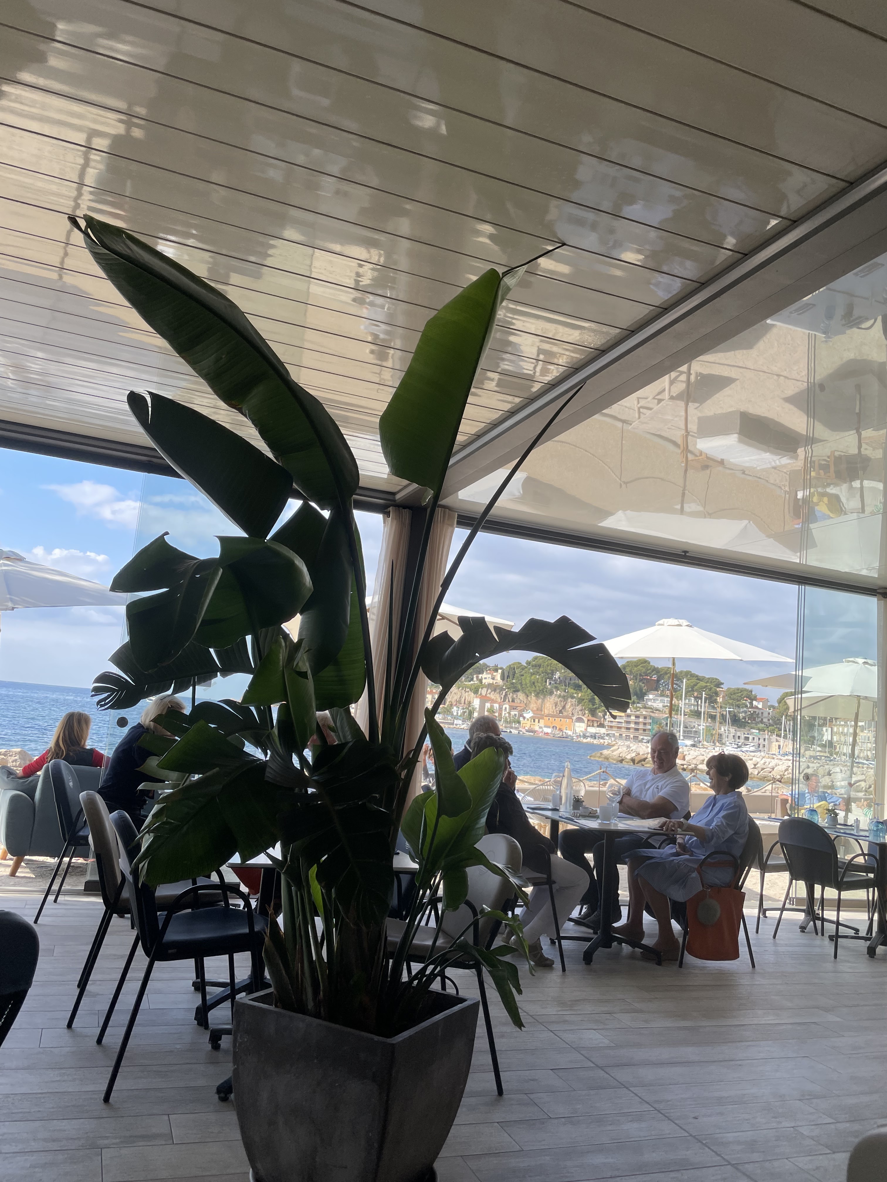 Nous étions 4 et avions réservé une table plus d'une semaine à l'avance pour le samedi 2 octobre midi . Le couple d'amis avec qui nous devions déjeuner était allé déjà 2 fois dîner dans ce restaurant et en avait été très contents . Pour ma part , surtout après avoir regardé les avis très favorables sur le site , je me faisais un plaisir de découvrir cet endroit . Mes amis avaient demandé une table avec vue sur mer et bien exposée. Lorsque la serveuse nous a conduits à notre table , celle-ci était bien exposée pour la vue , mais en plein courant d'air . Nous avons donc demandé de nous changer d'endroit ou bien de fermer plusieurs baies vitrées pour être protégés du vent . Malheureusement , un couple était à l'abri dans un coin et n'a pas voulu fermer les baies . La serveuse nous a proposé une autre table à l'intérieur mais sans vue sur la mer . Aucun patron n'est venu régler le problème et nous sommes donc partis sans manger . Nous sommes des personnes habitant Sanary , et nous regrettons cet accueil car nous ne retournerons plus dans ce restaurant qui privilégie peut-être les touristes au détriment de la population locale. Effectivement , 4 personnes de moins ce n'est pas important quand on fait le plein pendant la bonne saison ! Nous préférons laisser notre argent dans des établissements qui savent maîtriser les situations conflictuelles et où chaque client mérite d'être bien reçu. Dommage pour ce restaurant , mais heureusement qu'il y en a d'autres où l'on est mieux considérés !!!