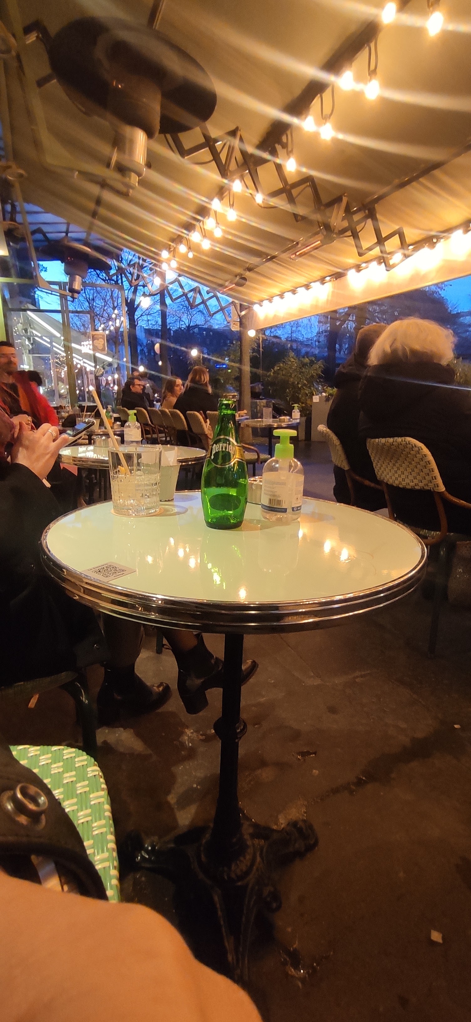 Assis dehors sous les radiateurs de terrasse, regardant le monde passer. Quel bon restaurant. Nourriture superbe et vin excellent! Hautement recommandé.