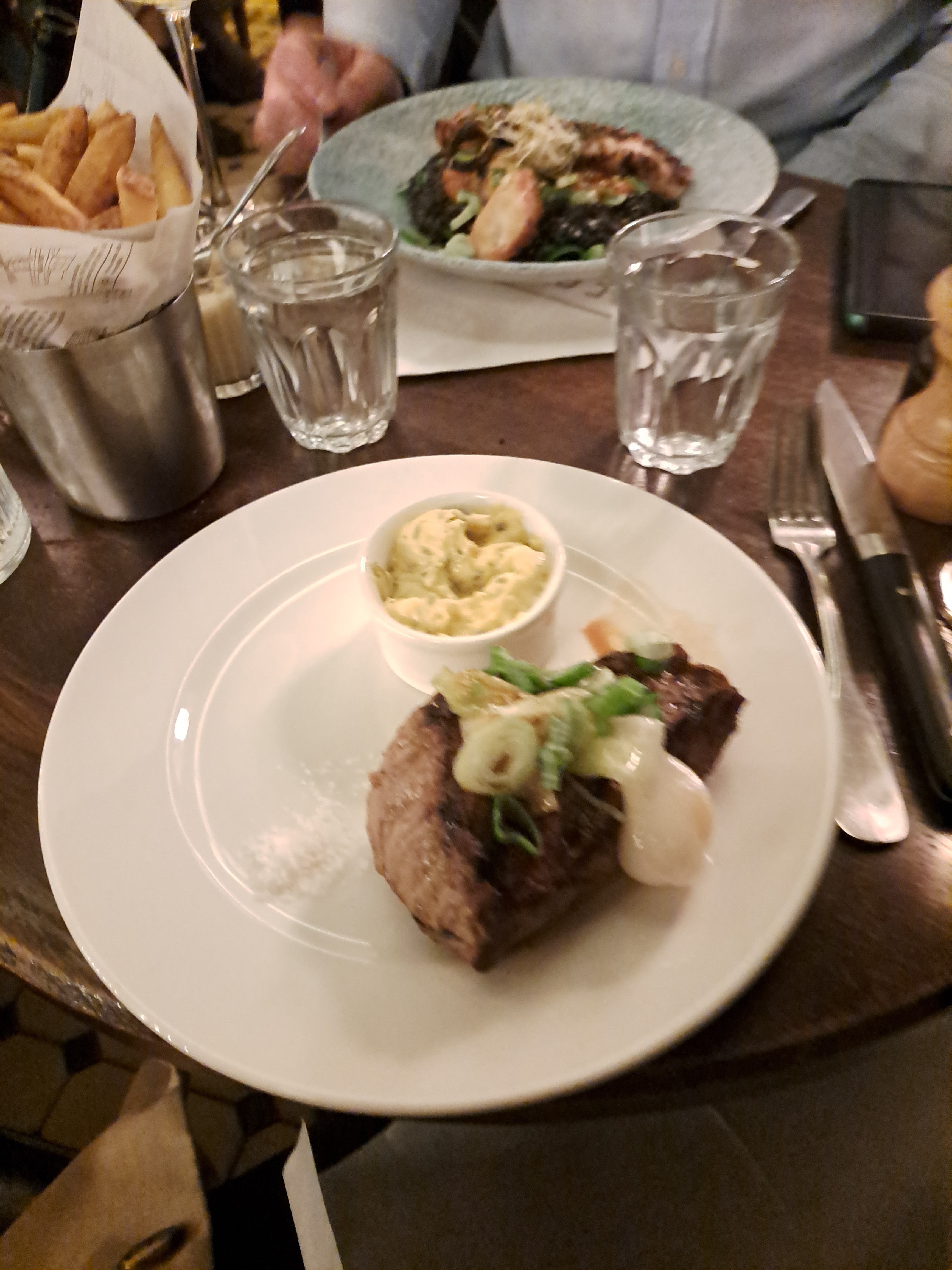 La nourriture était bonne mais notre serveur était incompétent. Nous avons commandé des entrées et des plats principaux et tout a été livré en même temps. Il nous parlait constamment, prenant peut-être une commande ou qualifiant quelque chose, puis s'enfuyait au milieu de tout cela. Il y a pas mal de bruit dans cet endroit, si vous voulez un endroit raisonnablement calme, ce n'est pas ça.