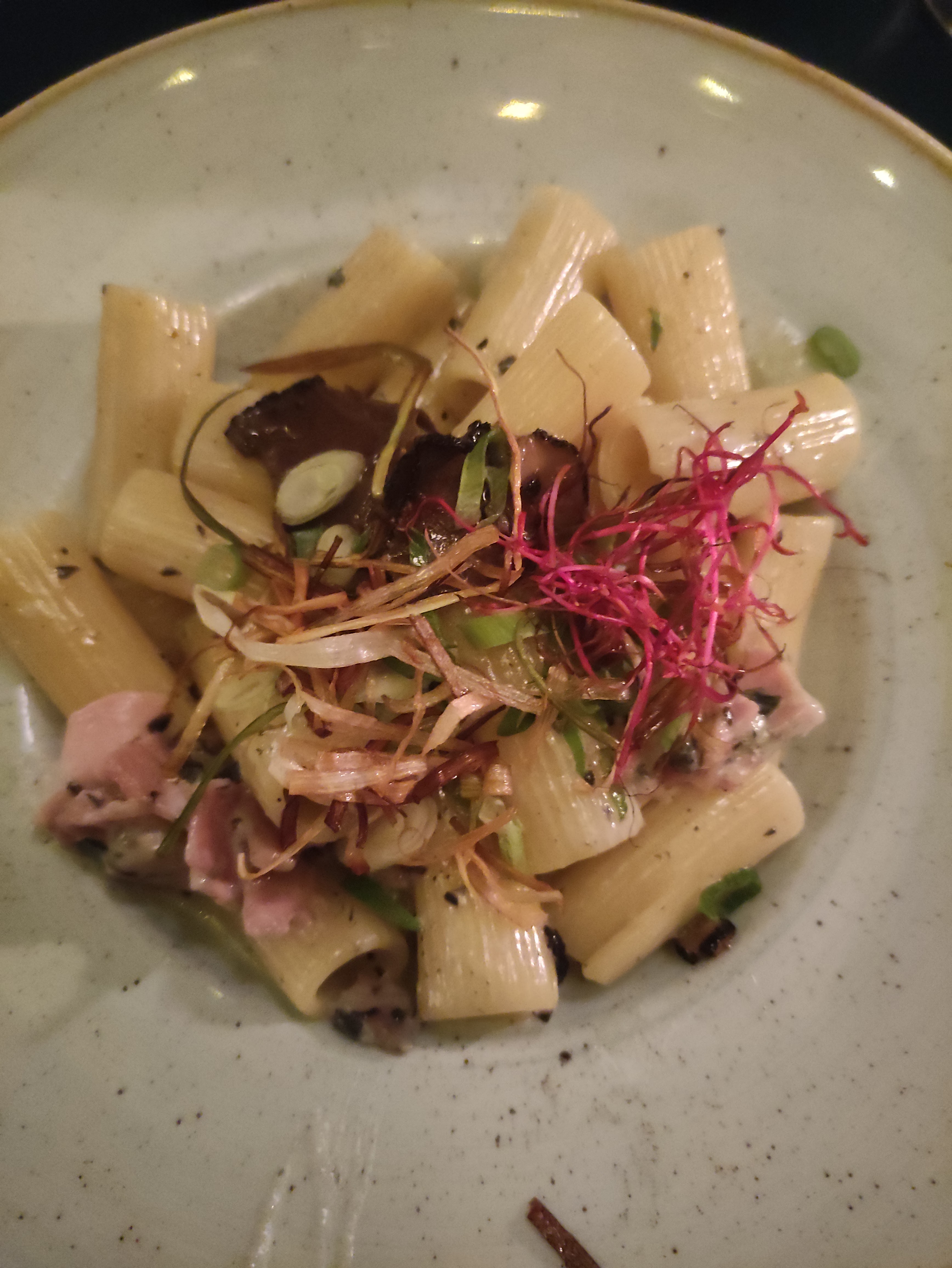 La nourriture était bonne, mais rien de spécial. J'ai eu des gnocchis aux épinards et au pesto (l'une des très rares options végétariennes) servis dans une marmite en métal et du vin blanc qui était très bon. Le service était très sympathique mais effronté. Le plus gros avantage est l'emplacement et le design intérieur.