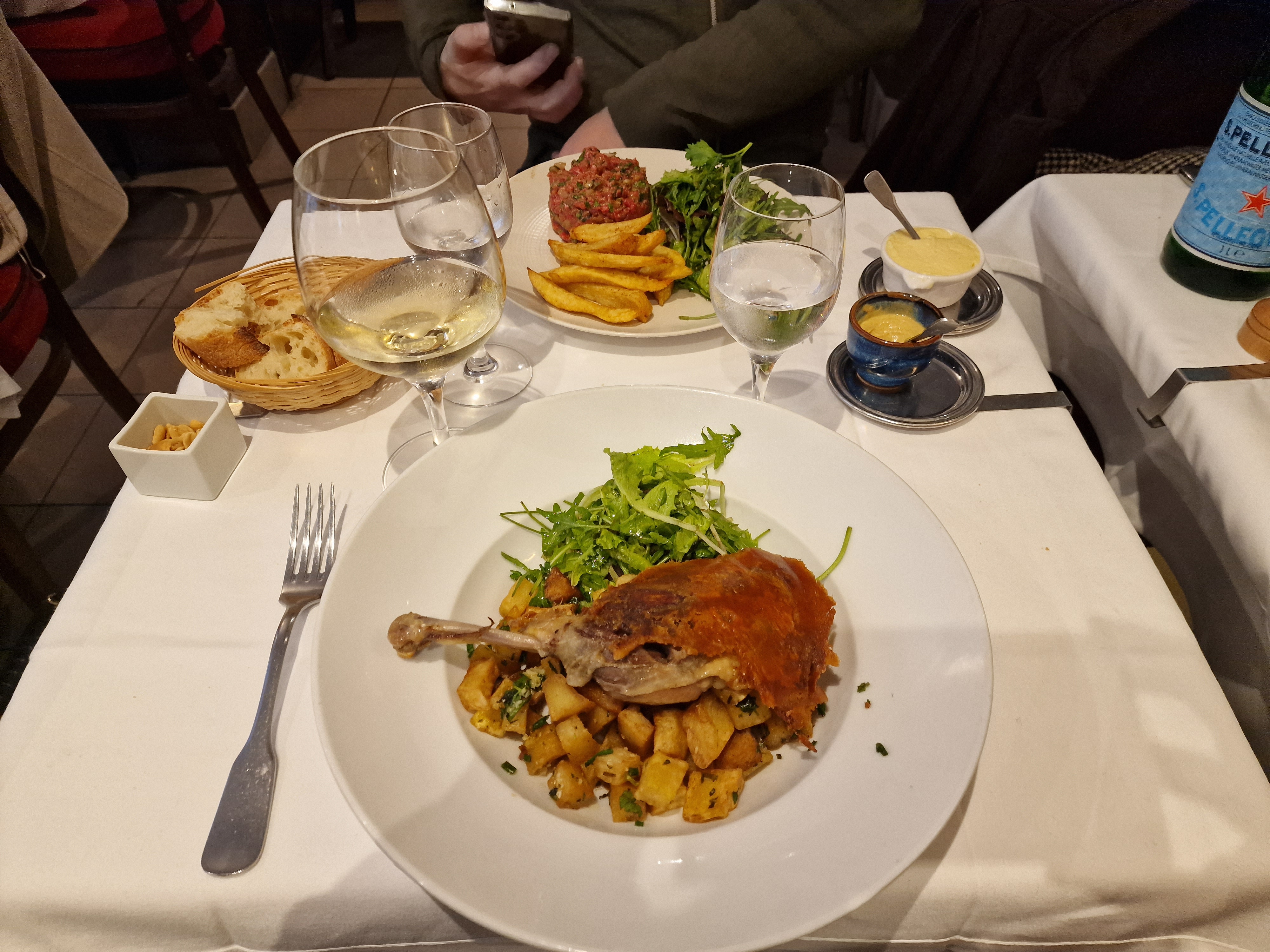 Excellente expérience culinaire. Rue calme et ambiance agréable à l'intérieur du restaurant. Le service était trop excellent. Je pense que notre serveur était peut-être le propriétaire ou le gérant et elle était très sympathique et drôle. La jeune fille qui apportait la nourriture a également fait un excellent travail. J'ai commandé le canard confit et c'était excellent. Croustillant et savoureux et les pommes de terre frites étaient vraiment délicieuses. Avoir un bon confit de canard était sur ma bucket list pour Paris et je l'ai coché ici. J'ai partagé le crime brûlé pour le dessert et c'était parfait - crémeux et peu profond pour que vous puissiez obtenir beaucoup de sucre croquant à chaque bouchée. Bref, un merveilleux repas :)