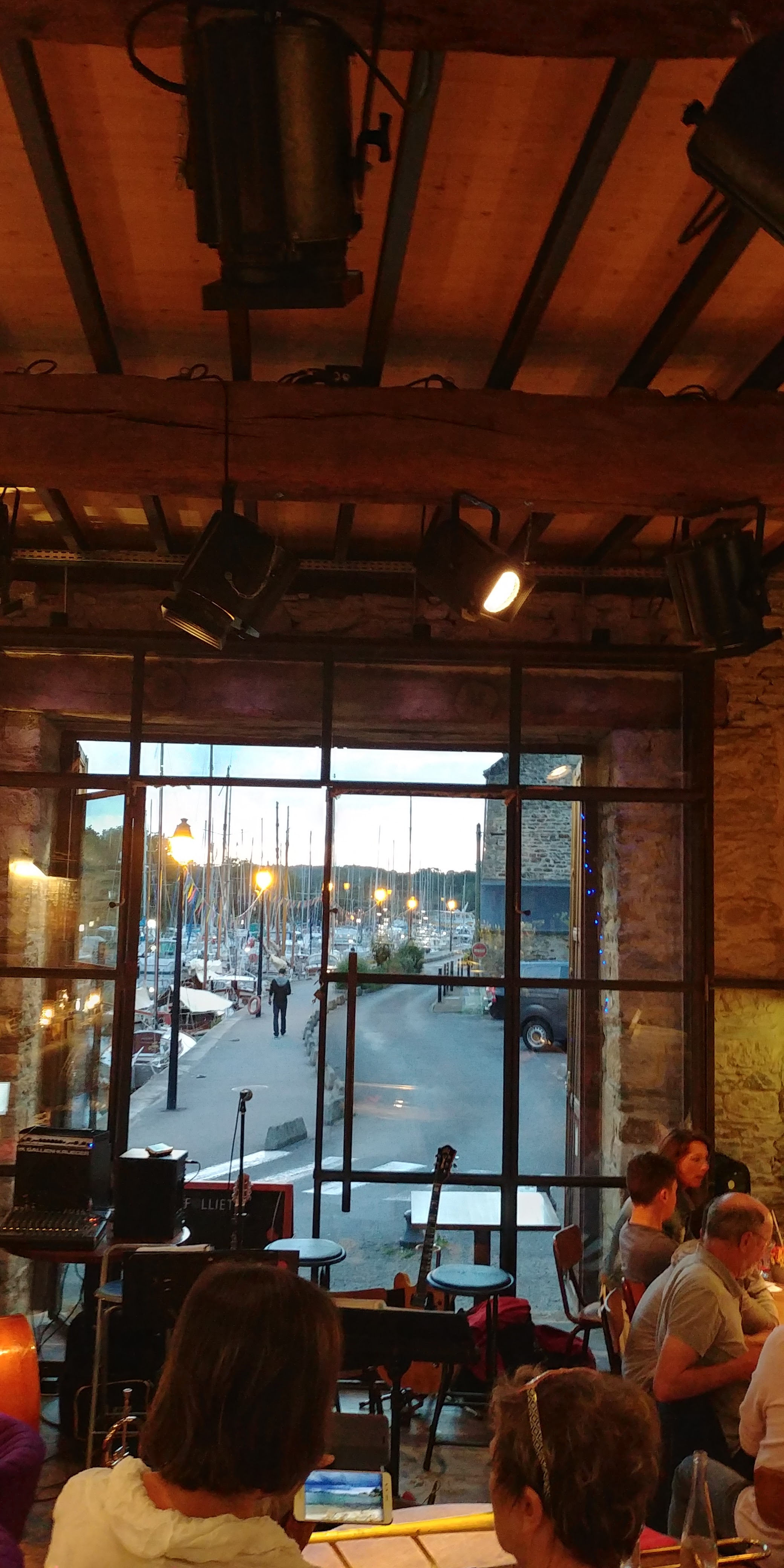 L'endroit est superbe. Au bout du vieux port de la Roche Bernard, on découvre une bâtisse dans son jus. La terrasse avec vue sur le port est plaisante mais la curiosité pousse à aller à l'intérieur et là on découvre un intéressant aménagement néo industriel sur 4 niveaux. Le lieu est insolite et plein de charme. Les matériaux sont simples et brut mais intelligemment associé : on a tout de suite envie de s'installer. Ça tombe bien, l'accueil est présent et souriant. Une chose apréciable, on peut s'installer où l'on veut sans le ah ben non monsieur, l'étage est fermé !. Même, si vous restez au rez-de-chaussée, je vous recommande de faire le tour des étages pour le plaisir et admirer le lustre paquebot. La carte est simple et efficace : tapas, entrées, poissons, viandes, végétalien. On trouve un truc à nous plaire. Le service est rapide et les plats sont corrects sans être copieux. Et c'est bon, une fois commencer on a envie de continuer. Un petit dessert pour la route : un entremets pistache framboise très goûteux. Le restaurant organise des animations le samedi et le dimanche. Compte-tenu du cadre, ça s'annonce prometteur. A tester. En somme, on passe un agréable moment dans un cadre un peu insolite et avec une cuisine efficace dans prétention exagérée.
