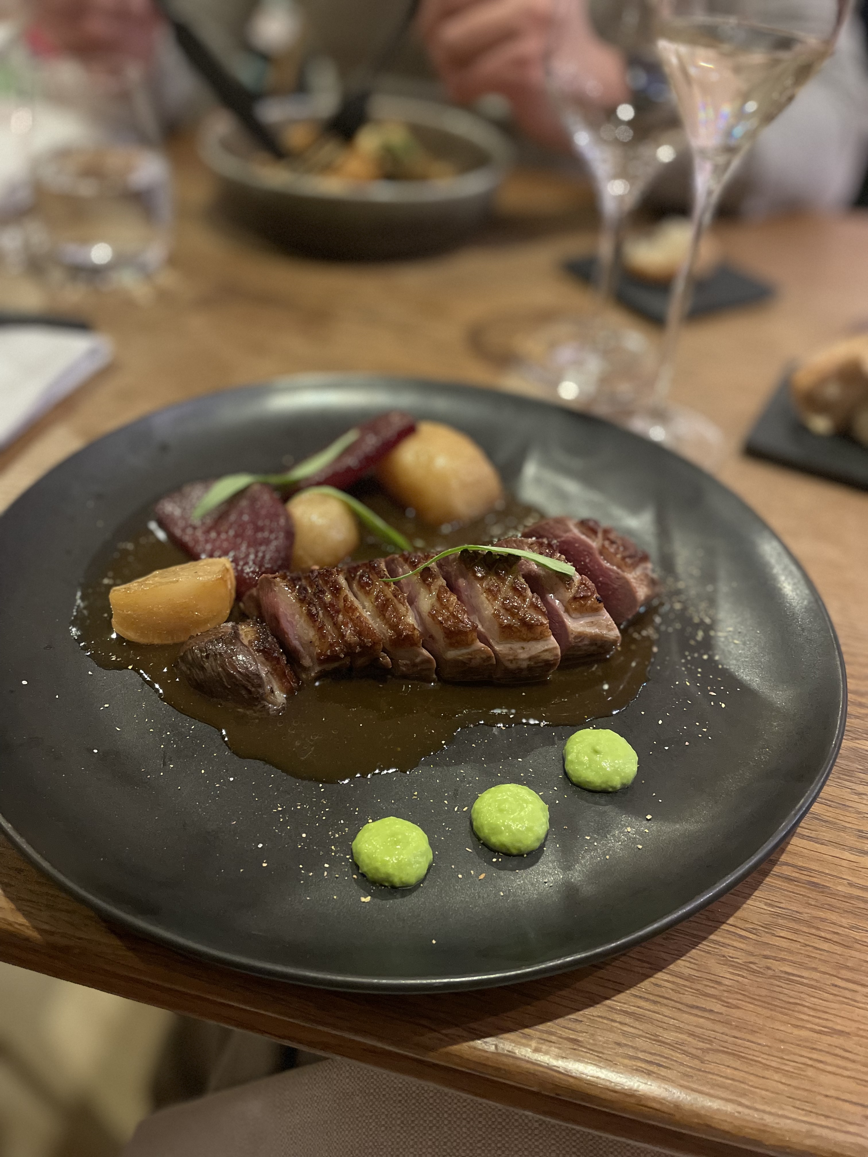 Nous sommes ravis d’avoir découvert ce restaurant, service très agréable de qualité, une attention à chaque détail, nous avons apprécié les gougères et la mise en bouche avant le repas. Les asperges étaient parfaitement cuites, avec une très bonne sauce gribiche. Le risotto d’épeautres était subtilement assaisonné. Le jus à l’estragon qui accompagnait la poire de boeuf était exquis. En dessert, la crème brûlée était très bonne, avec un fort goût de vanille. Nous avons passé un agréable moment, un grand bravo au chef, et sa brigade et à l’équipe de salle.