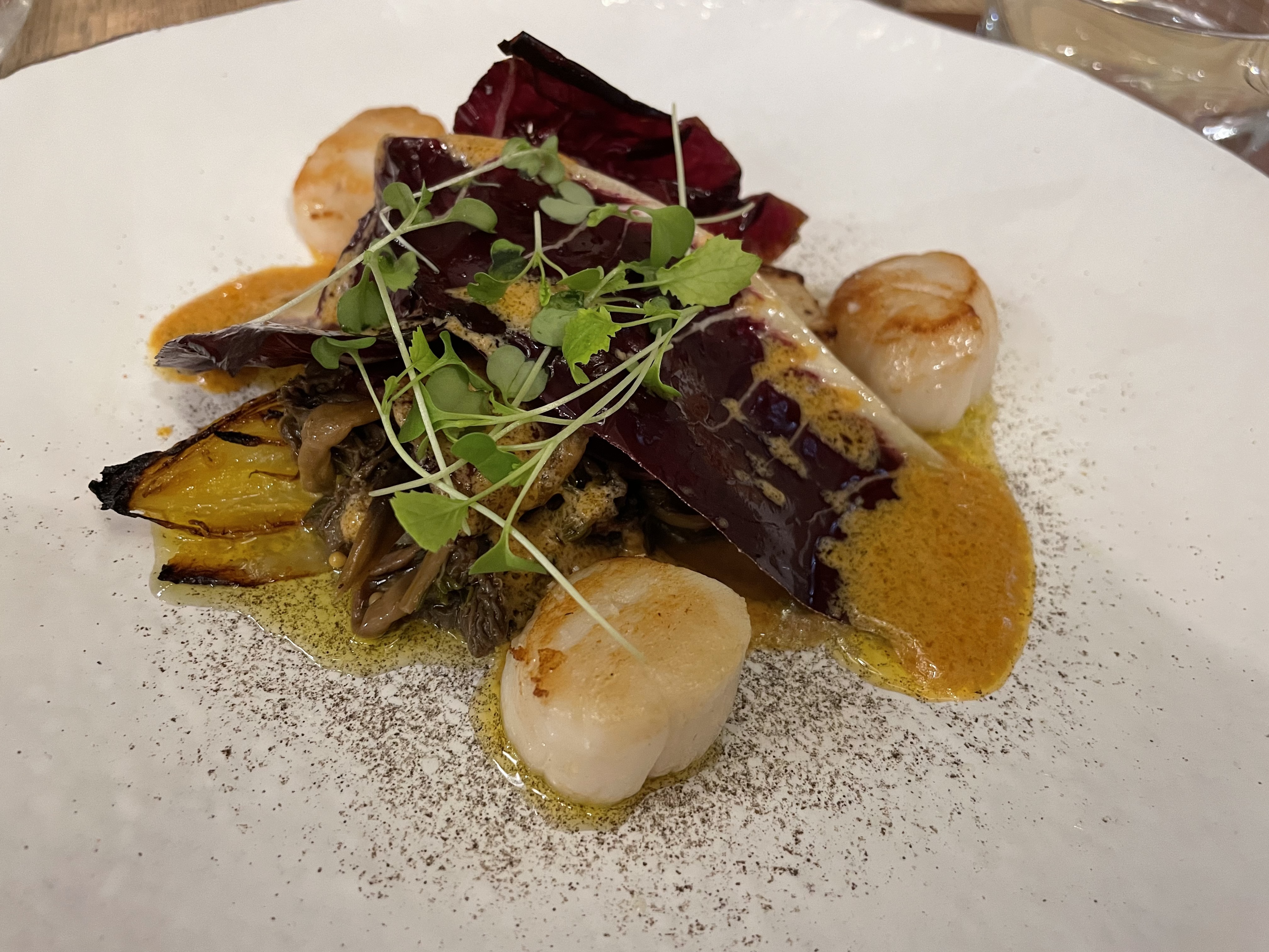 Ceviche juste parfait, Steak Angus, purée de pomme de terre accompagnée de morceaux de châtaignes et de chanterelles excellent. Un régal pour les yeux et les papilles. Merci au chef et à Julien pour ses conseils pour les choix des vins.