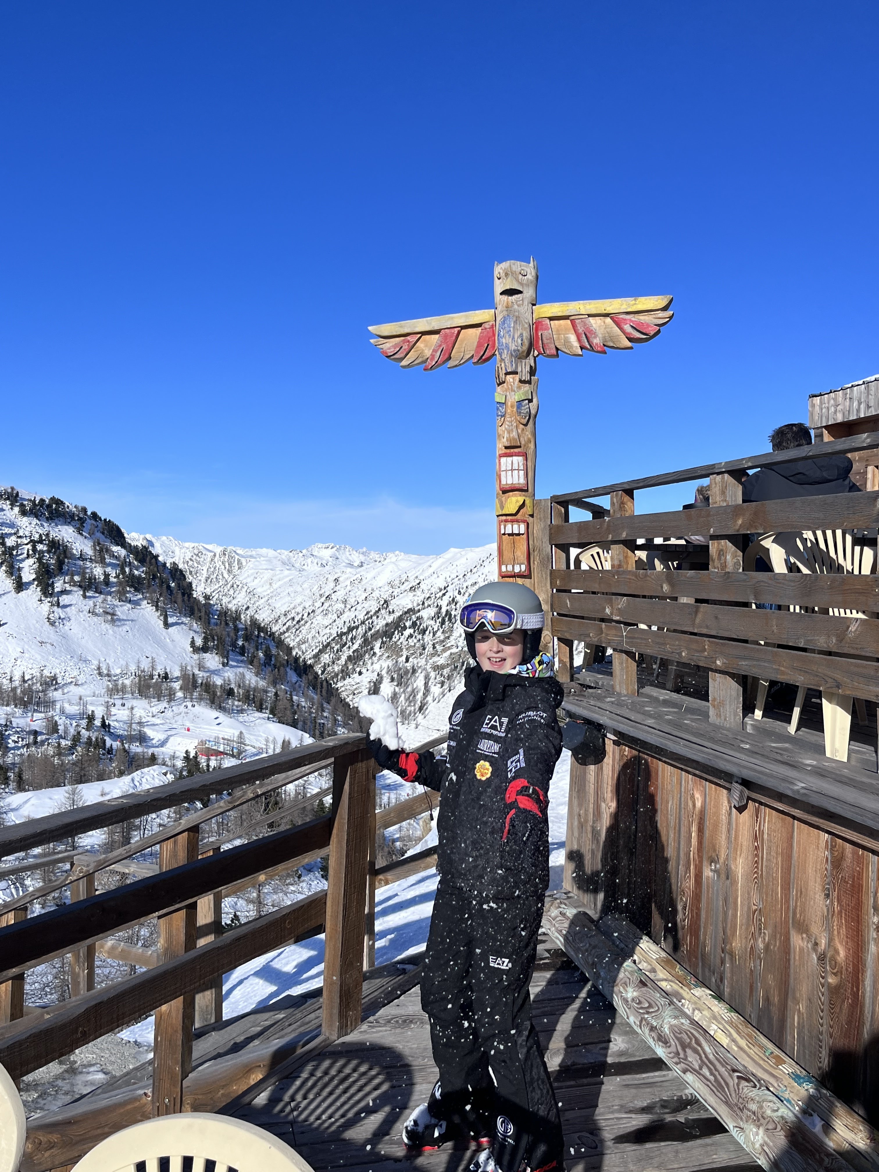 Un super endroit avec une vue imprenable, sur la vallée, sur le snow park et certaines pistes. Ambiance cool avec un dj.