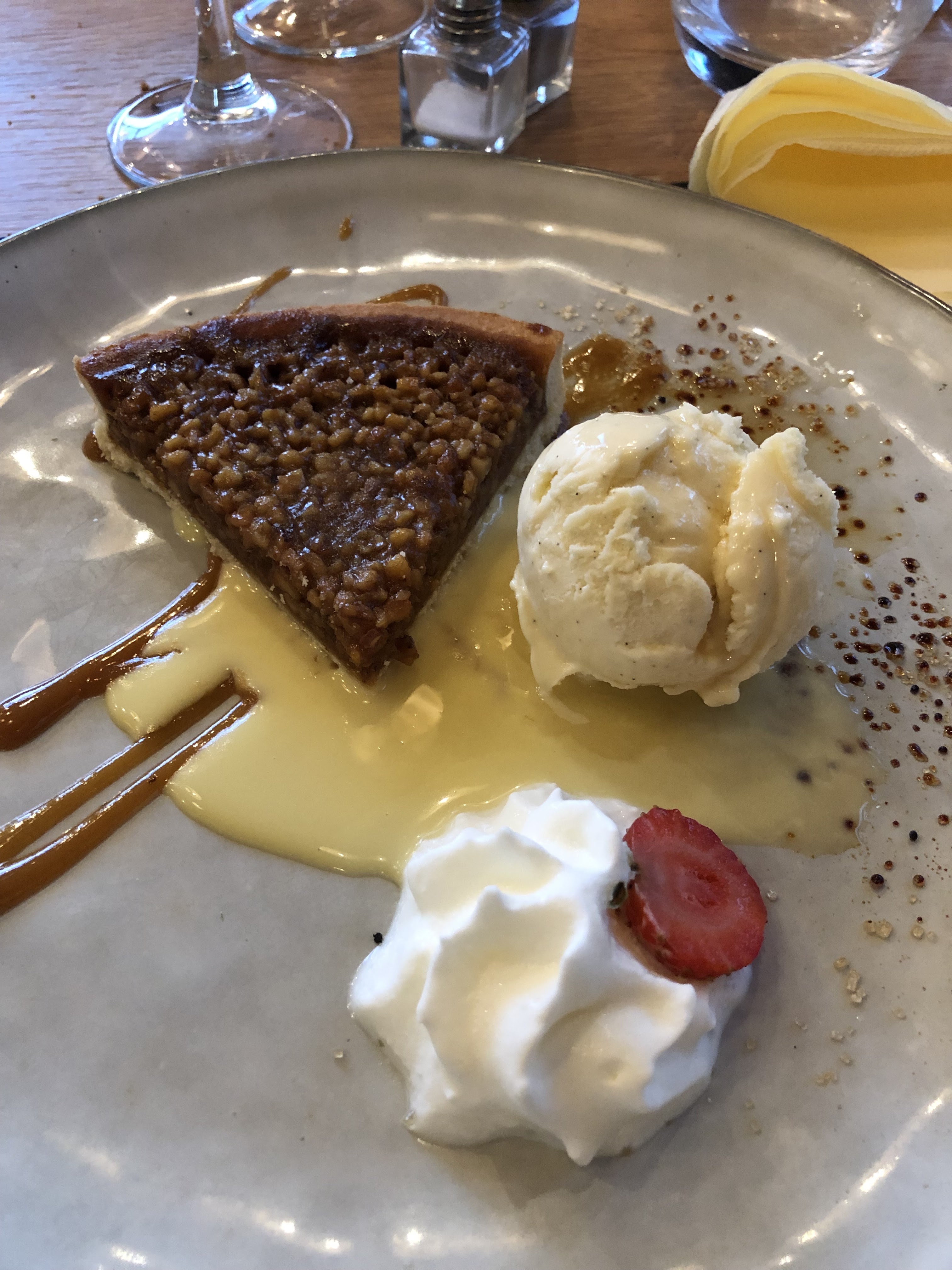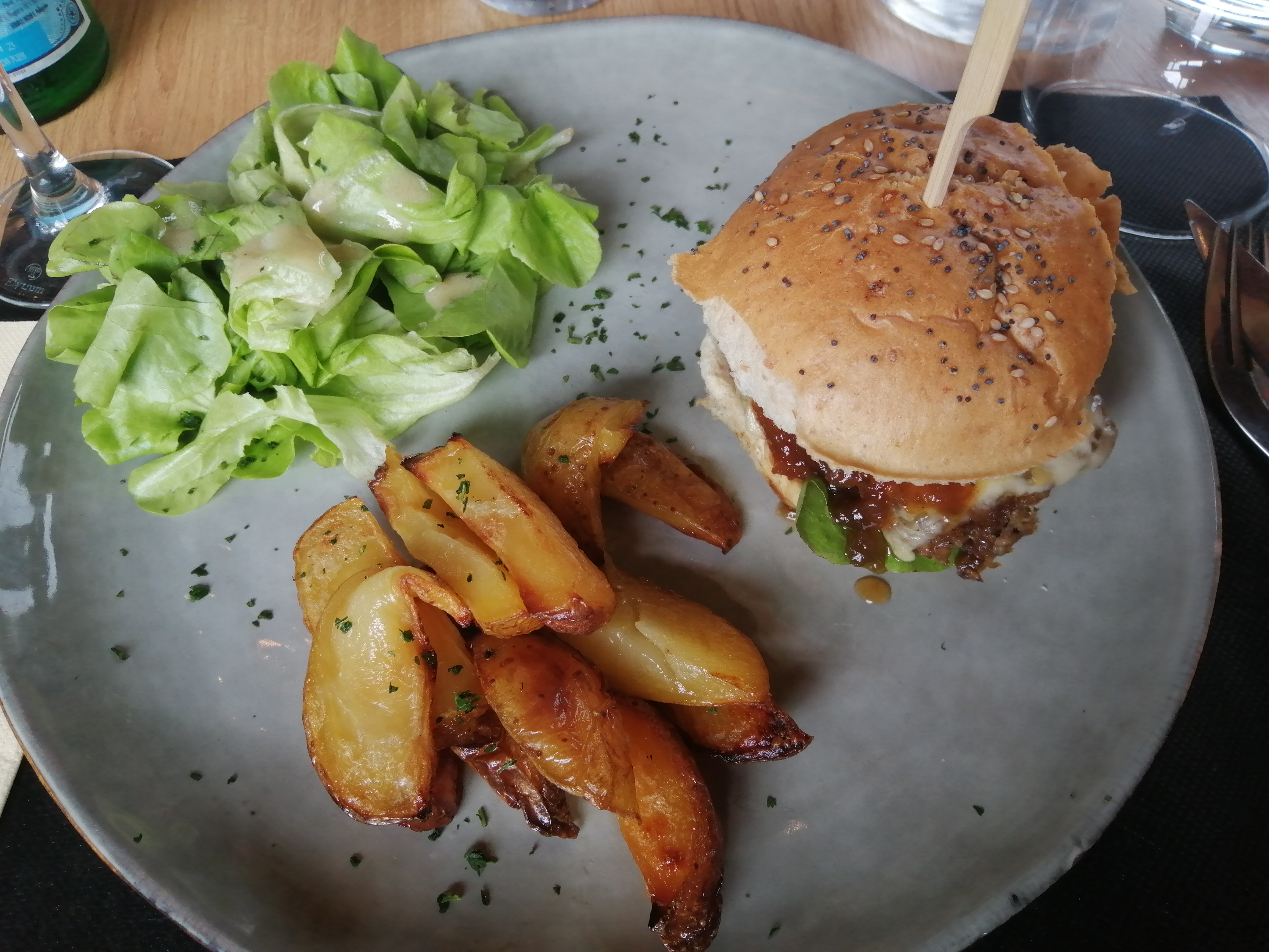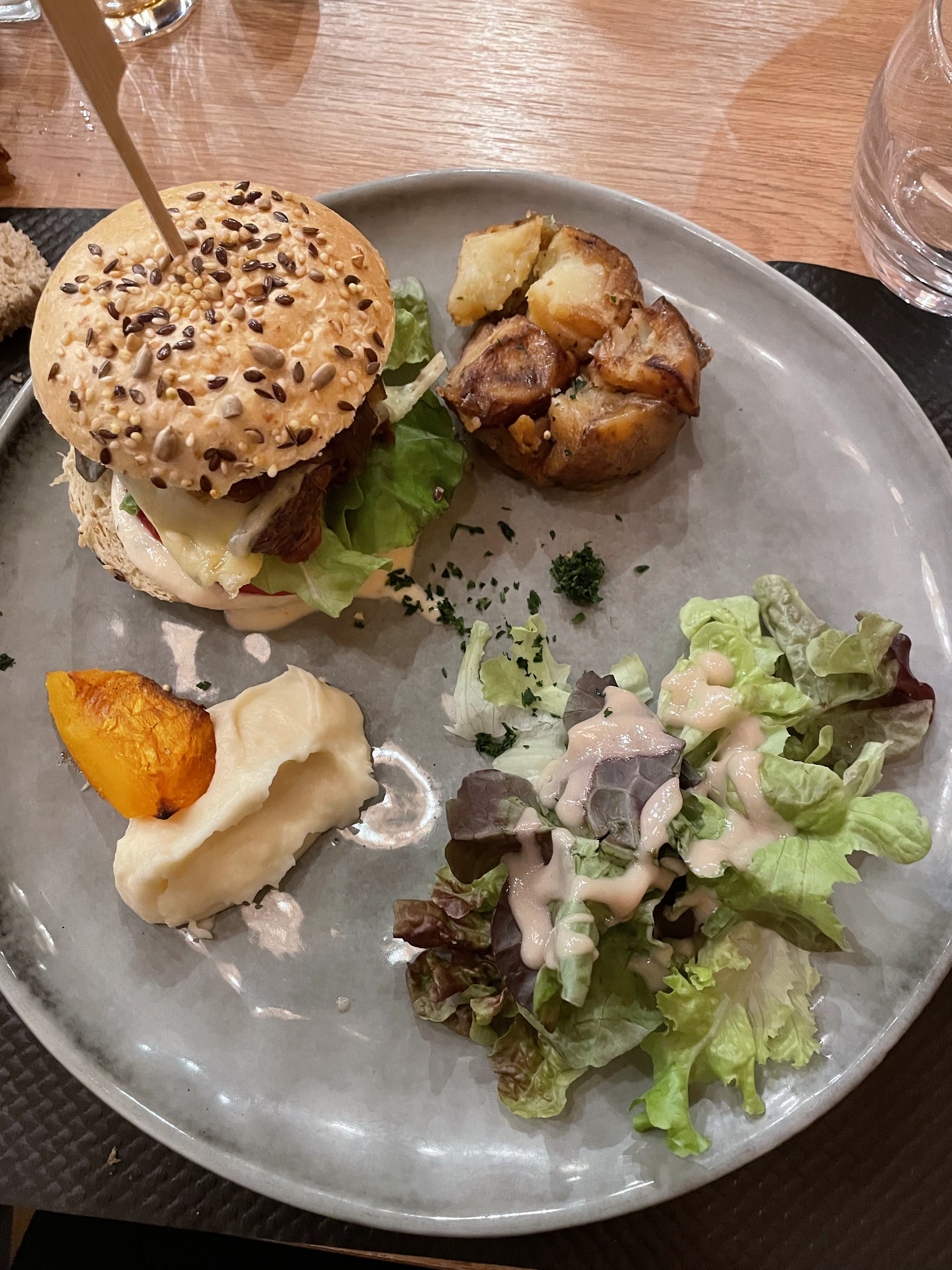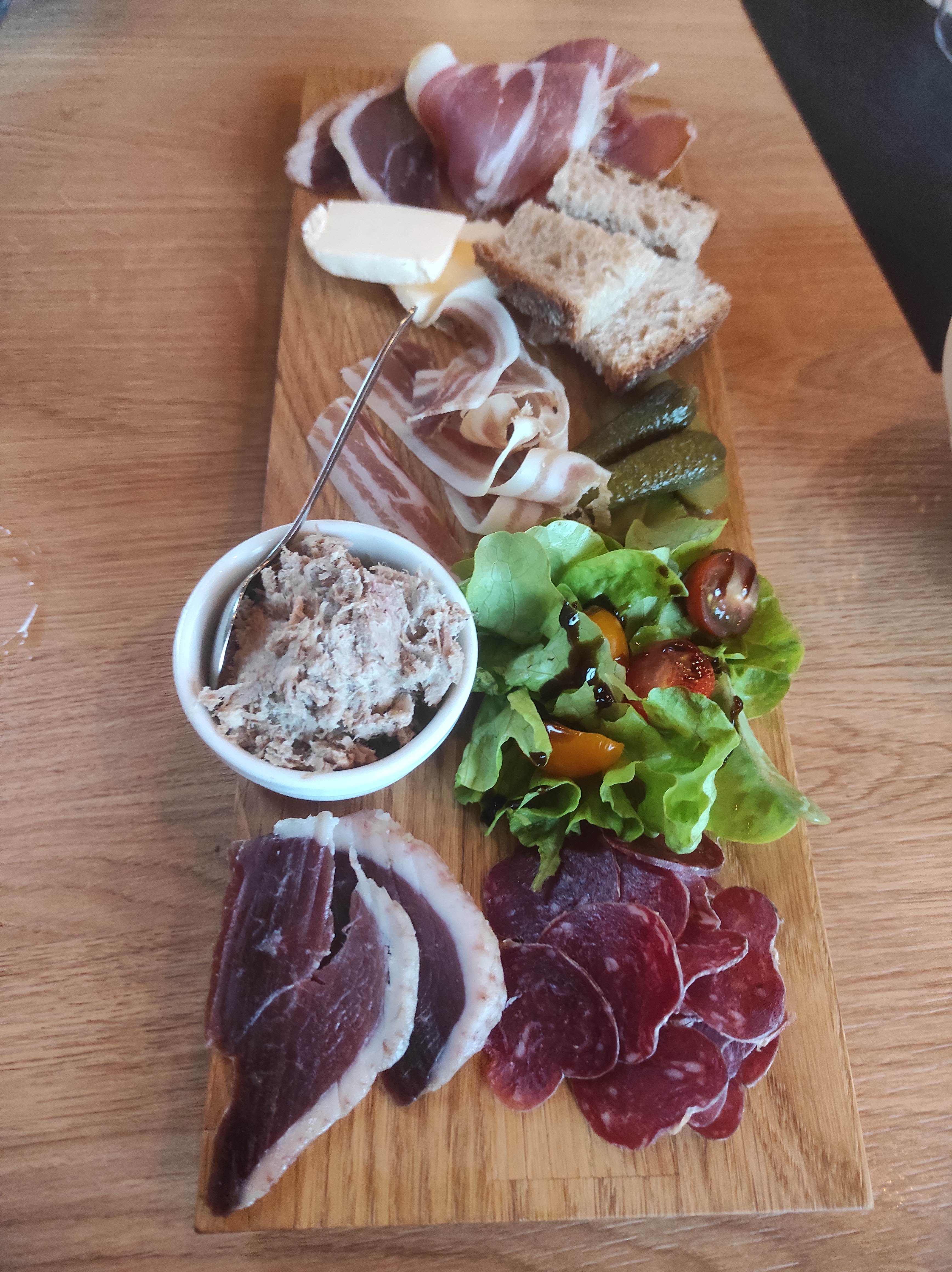 Repas excellent : rillettes, foie gras, burger au canard effiloché, tarte aux noix et glace à la prune. Parfait de l’entrée au dessert ! Copieux et raffiné. Le lieu est en plus vraiment agréable !